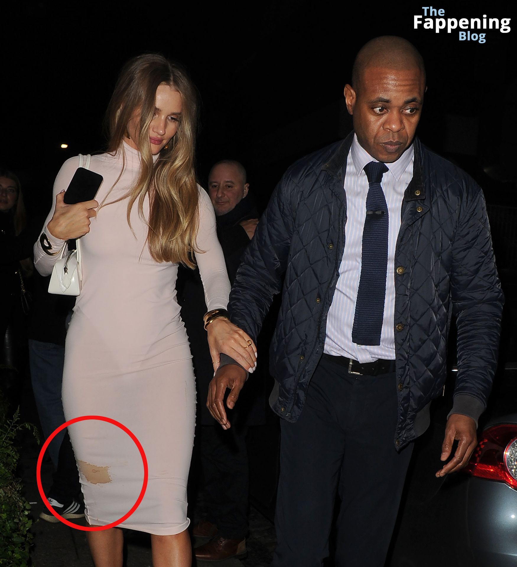Rosie tinha uma mancha de bebida no vestido, que não estava lá quando ela chegou ao Firehouse. A modelo usava um vestido rosa claro com um collant por baixo, exibindo sua silhueta invejável.