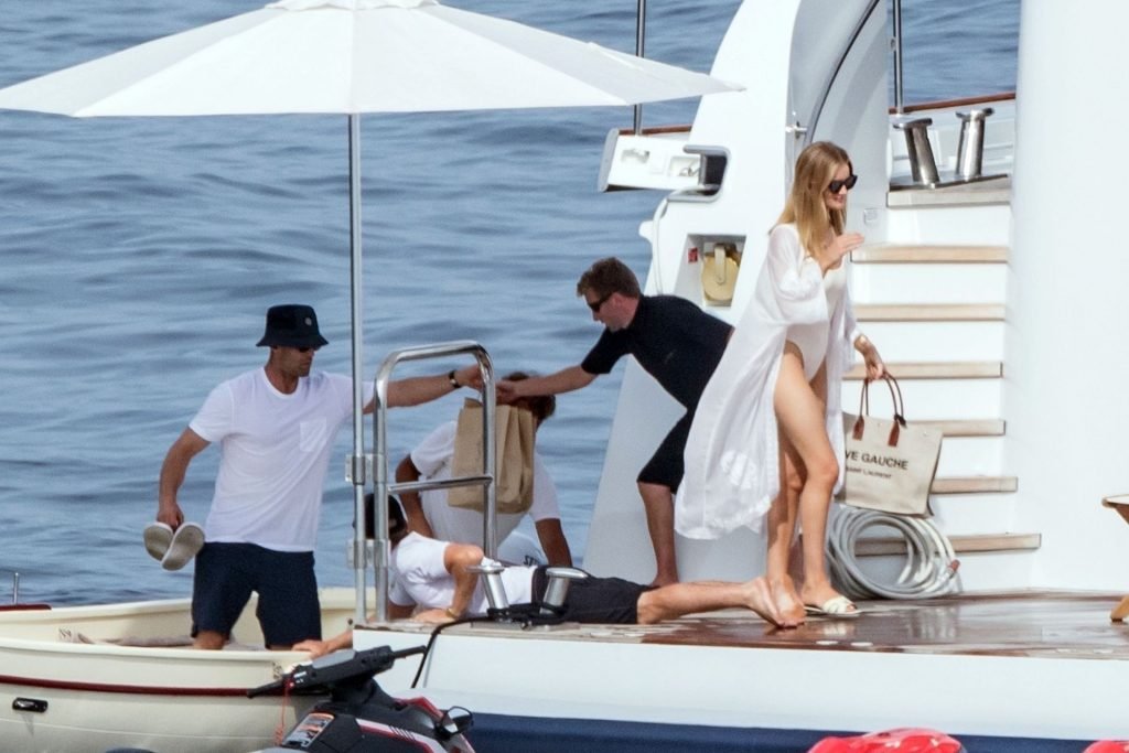 Rosie usava um atraente maiô branco justo que mostrava sua figura impressionante e foi vista abraçando Jason com um abraço apaixonado a bordo de seu barco de luxo antes de desembarcar para comer algo.