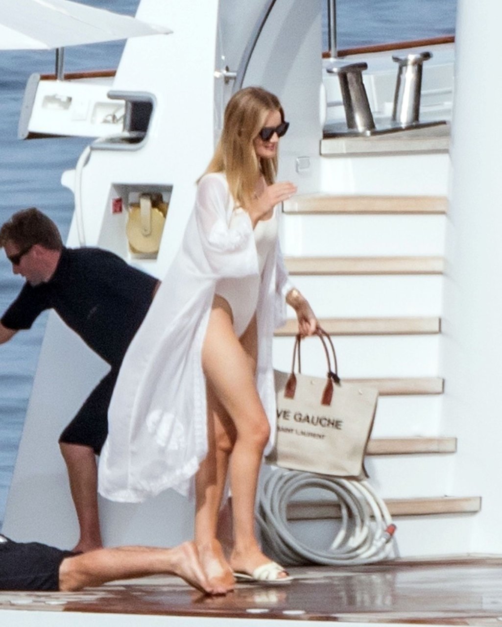 Rosie usava um atraente maiô branco justo que mostrava sua figura impressionante e foi vista abraçando Jason com um abraço apaixonado a bordo de seu barco de luxo antes de desembarcar para comer algo.