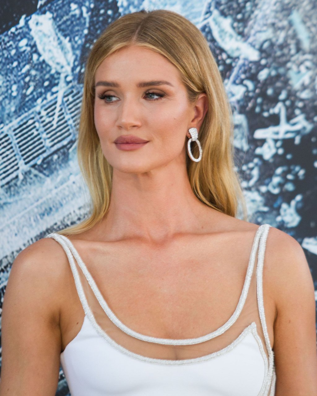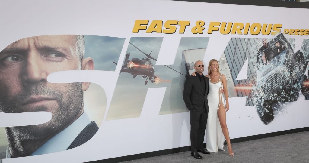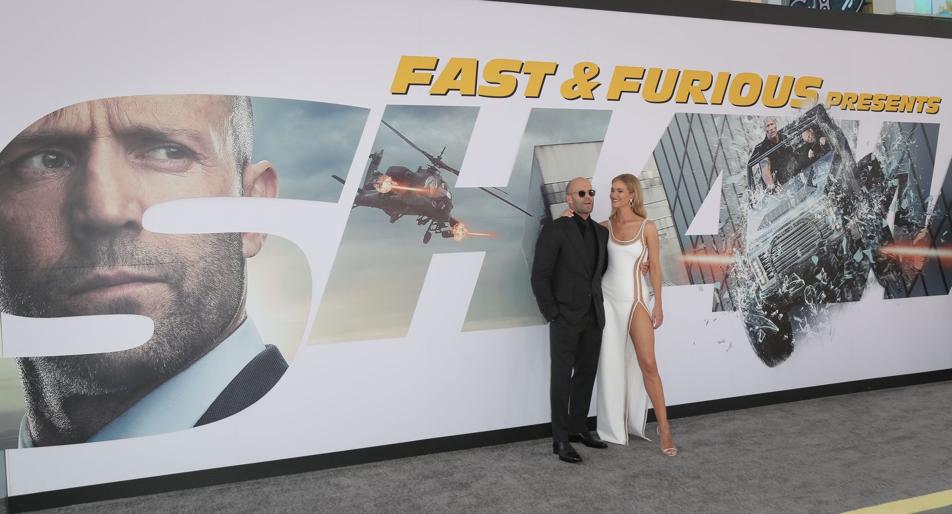 Rosie Huntington-Whiteley chega com Jason Statham à estreia de “Velozes & Furiosos: Hobbs & Shaw” da Universal Pictures no Dolby Theatre em Hollywood, 13/07/2019. A modelo exibiu sua perna sexy usando um vestido branco justo.