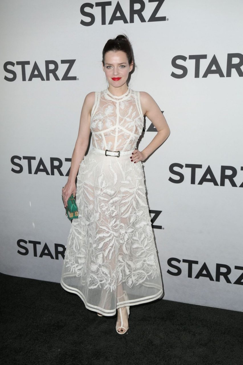 Atriz/modelo Roxane Mesquida (37) foi vista usando um vestido branco transparente no STARZ, TCA Winter Press Tour em Los Angeles, 12/02/2019.