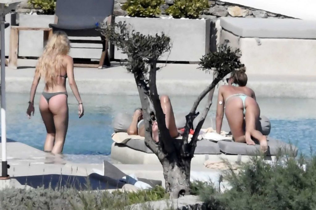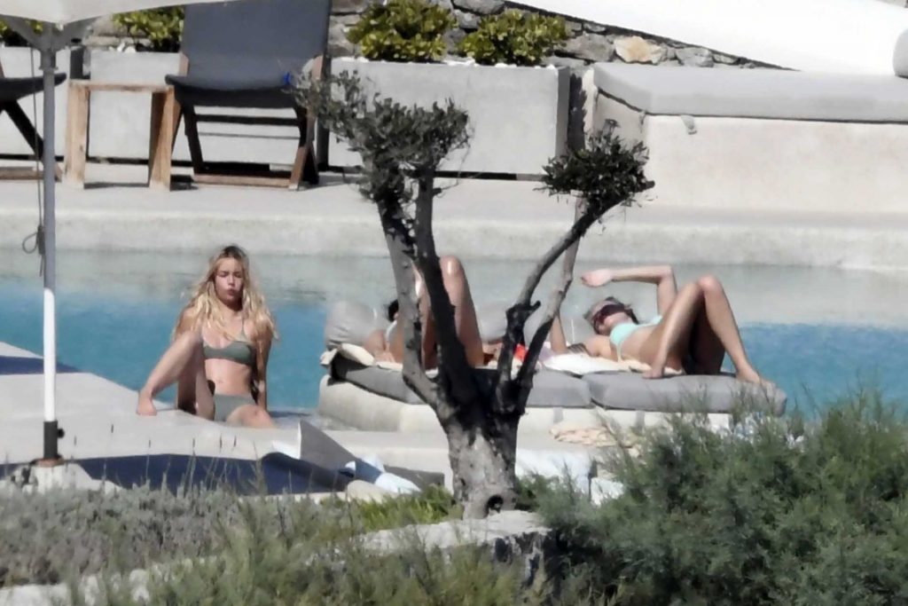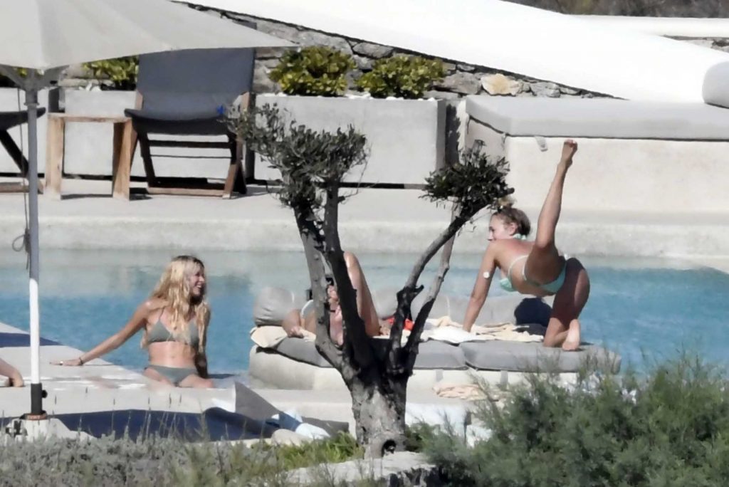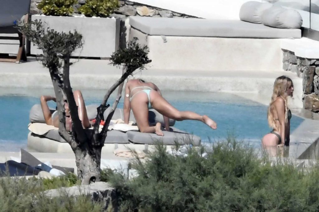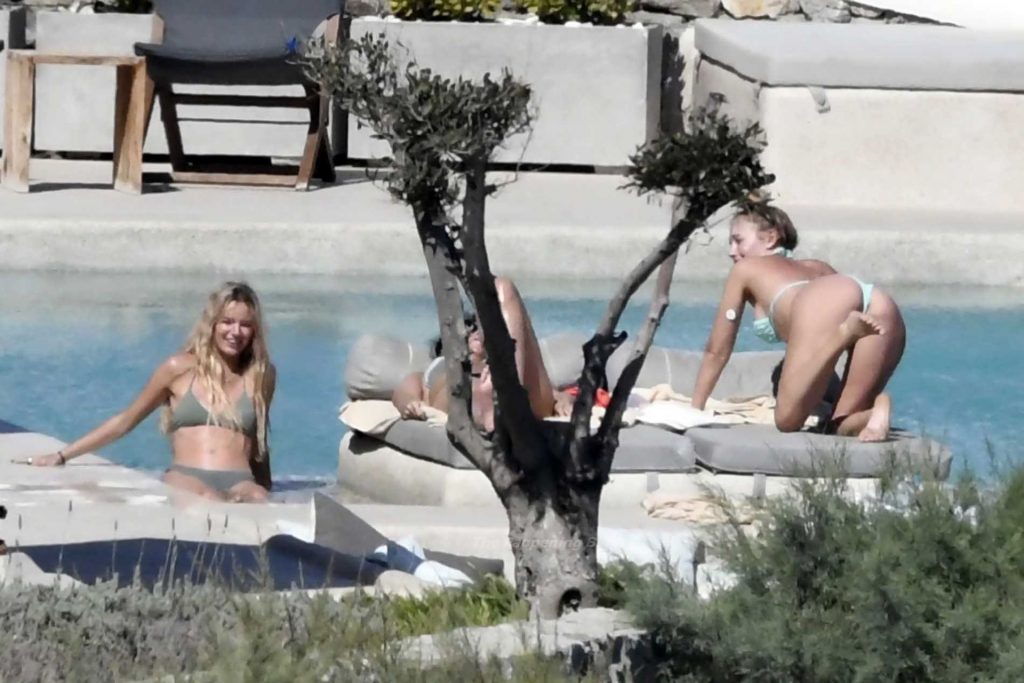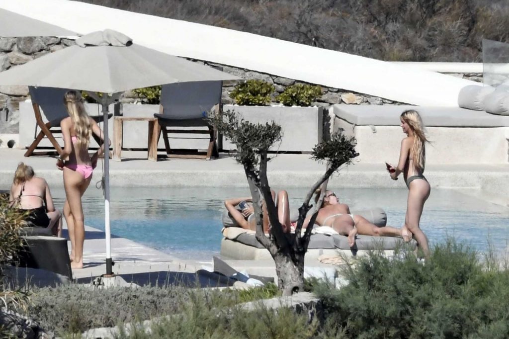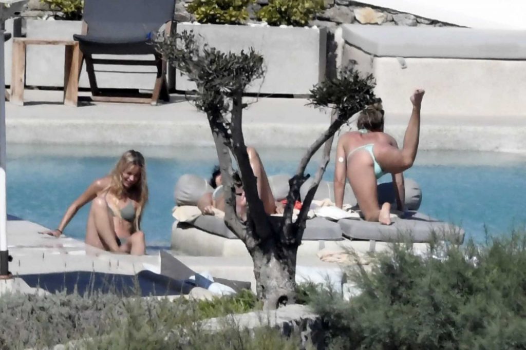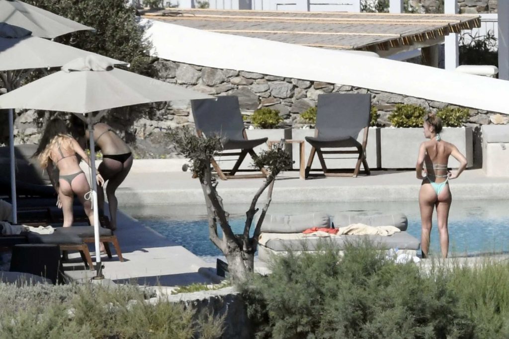 As duas belas em seus biquínis e até topless relaxam e brincam com alguns outros amigos enquanto tomam sol à beira da piscina durante sua estadia de férias em Mykonos.
