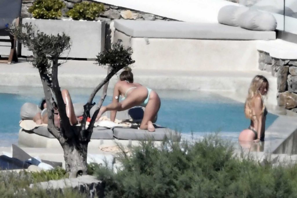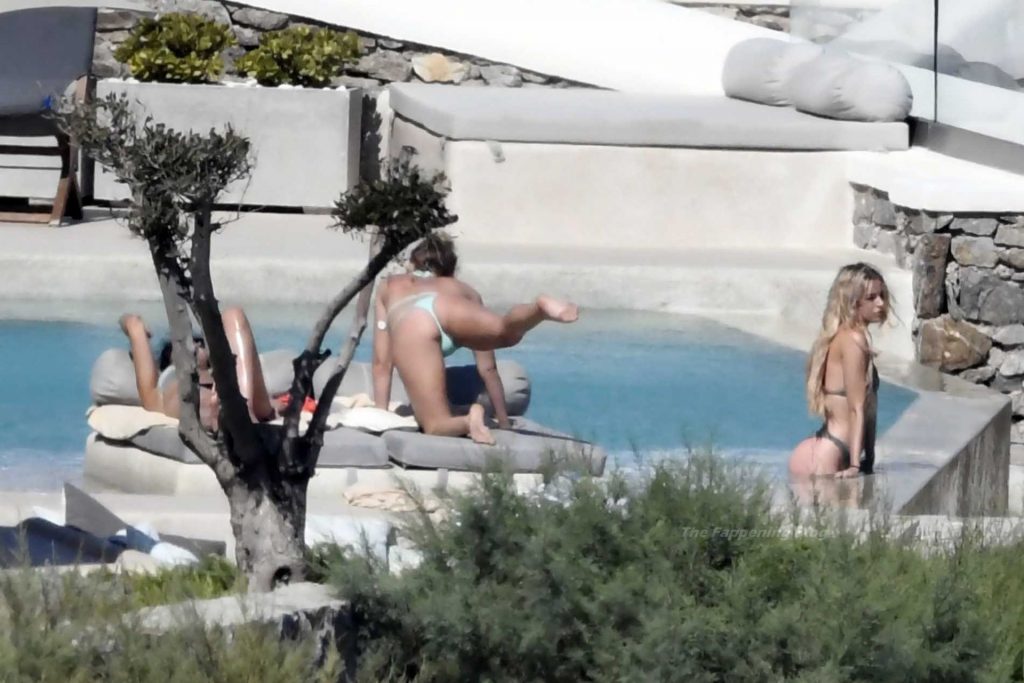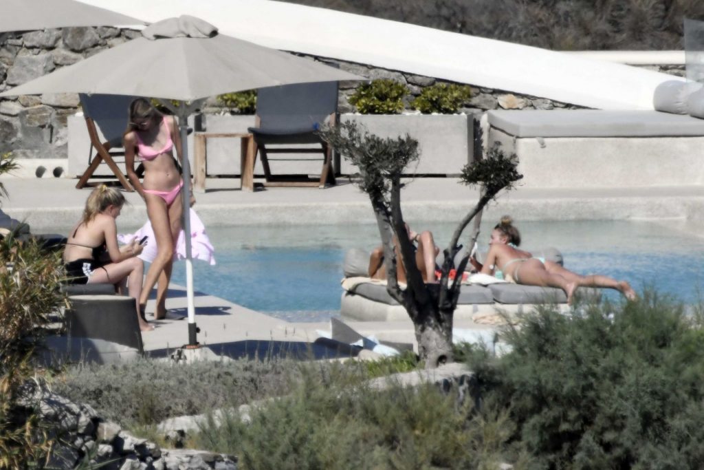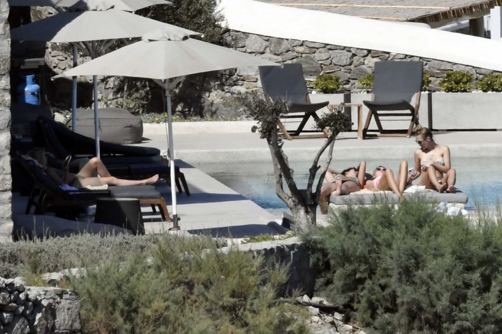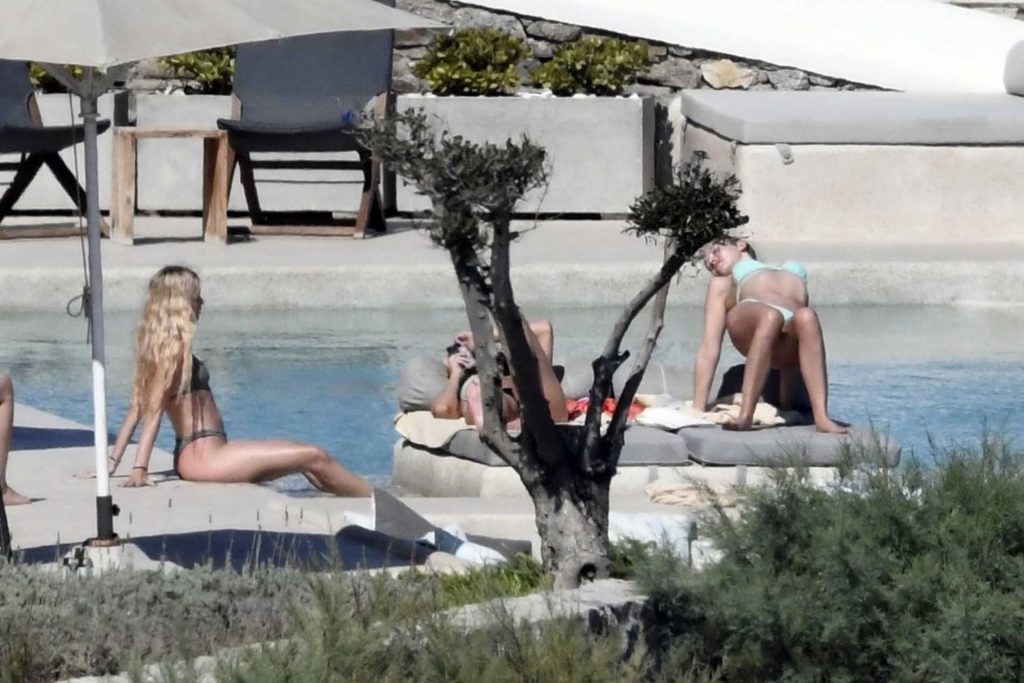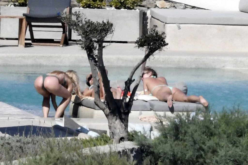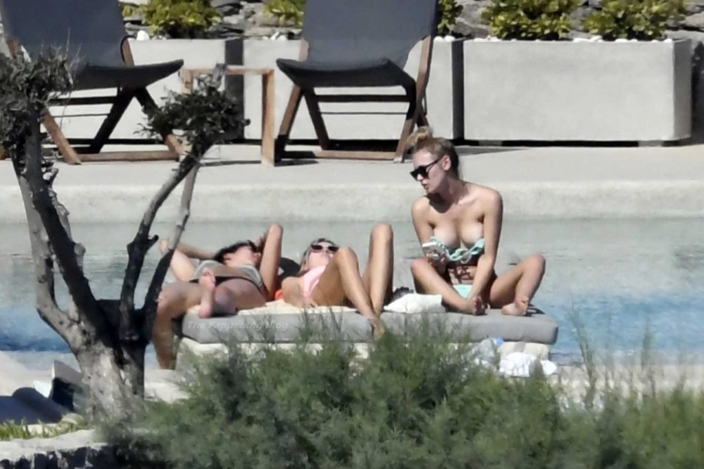 As duas belas em seus biquínis e até topless relaxam e brincam com alguns outros amigos enquanto tomam sol à beira da piscina durante sua estadia de férias em Mykonos.