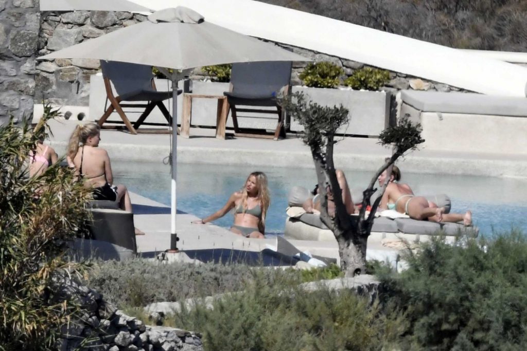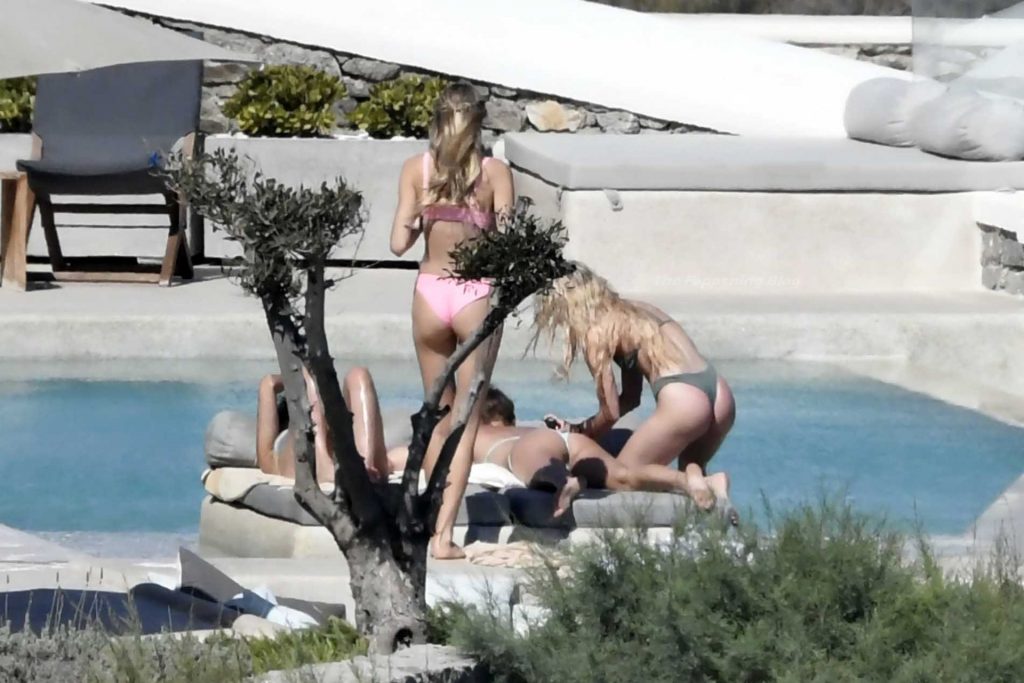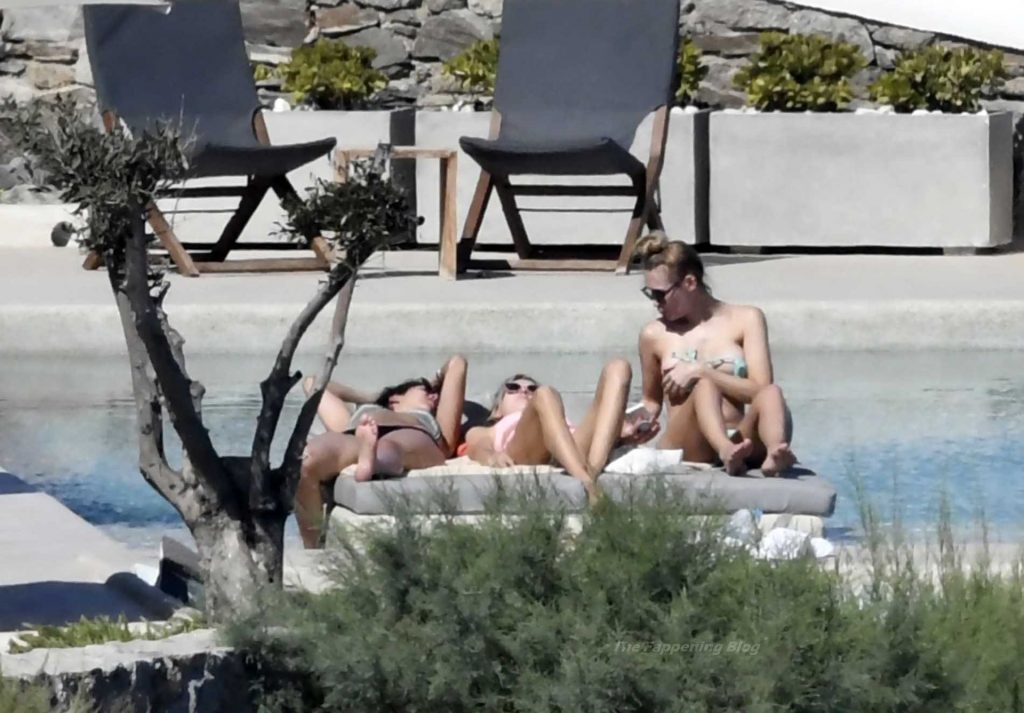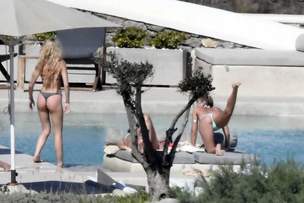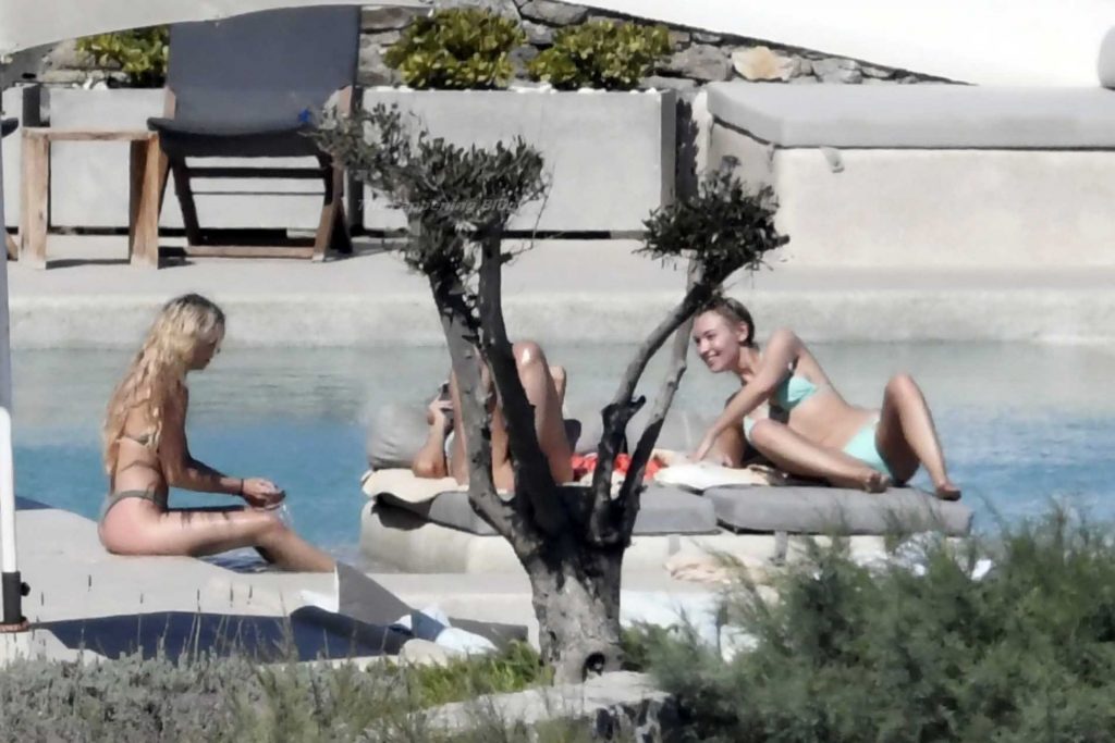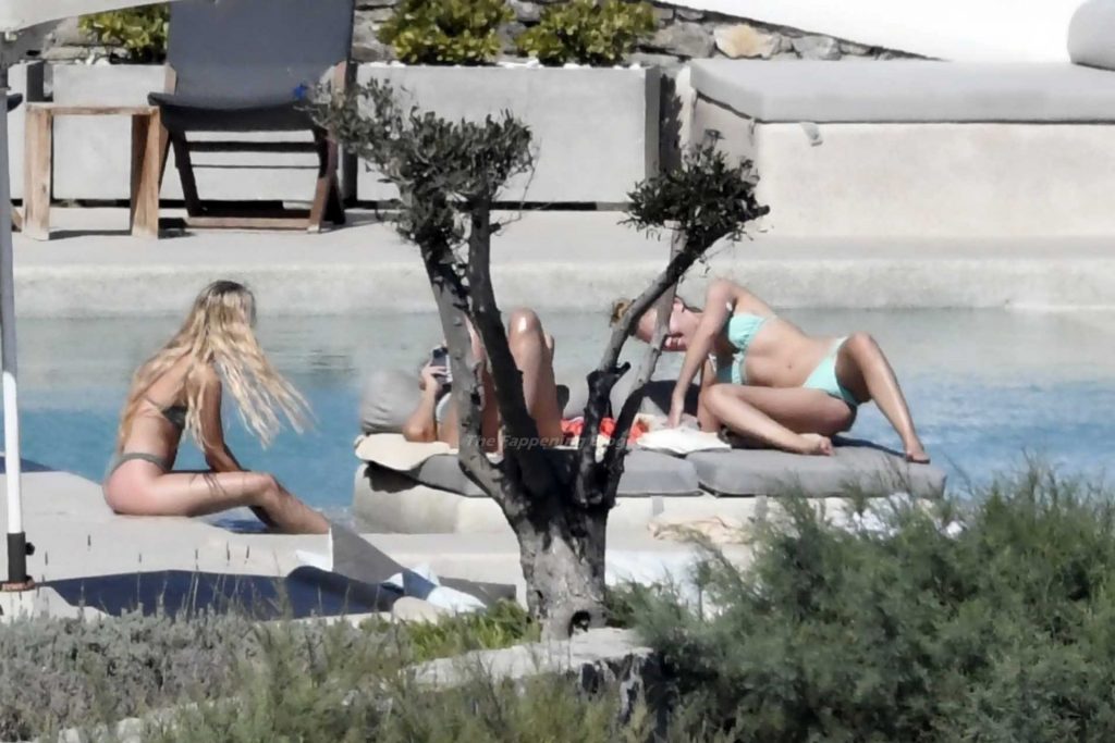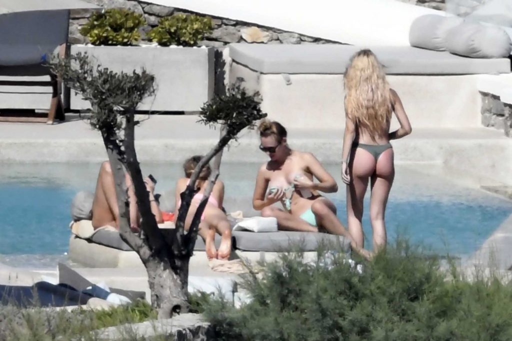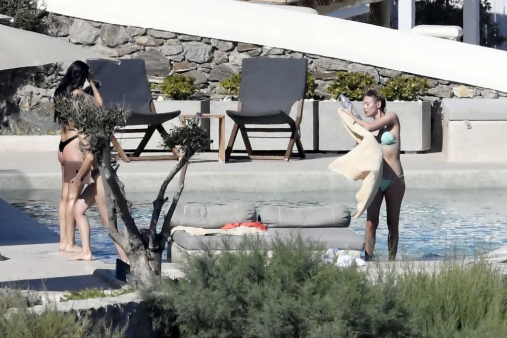 As duas belas em seus biquínis e até topless relaxam e brincam com alguns outros amigos enquanto tomam sol à beira da piscina durante sua estadia de férias em Mykonos.