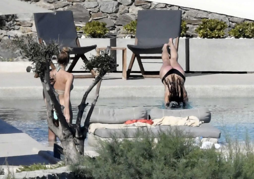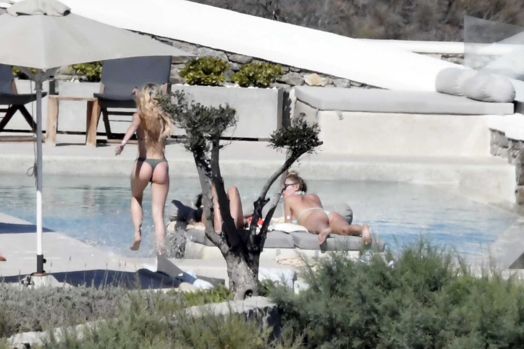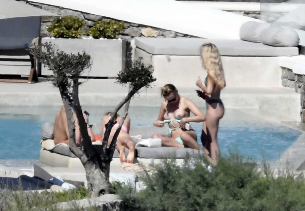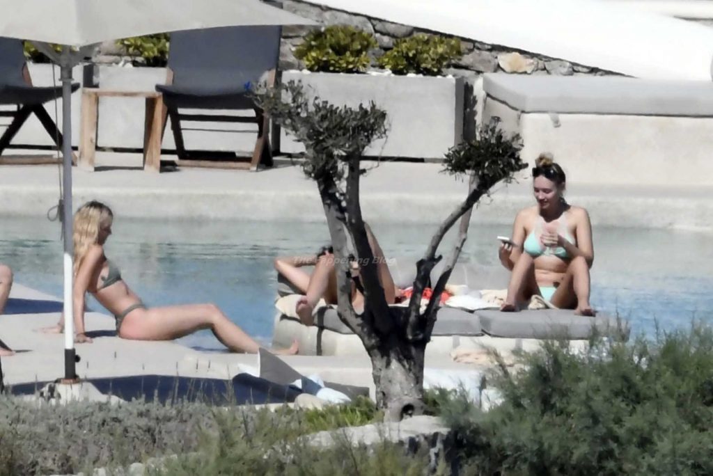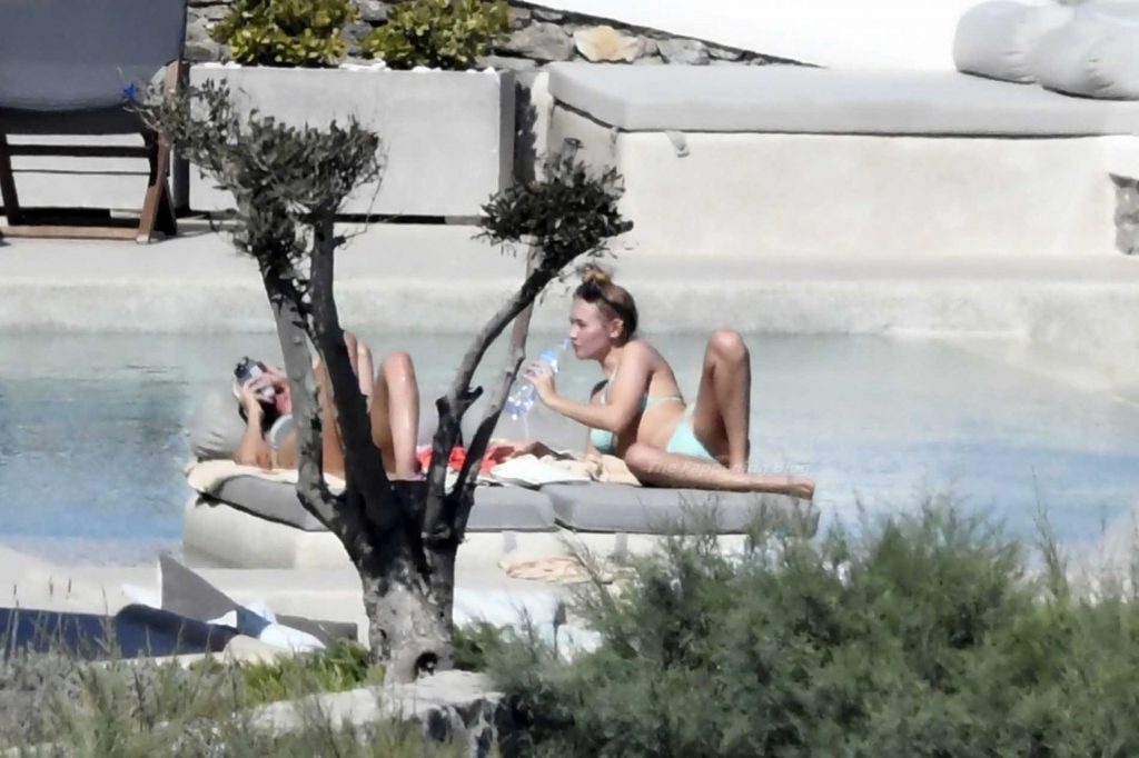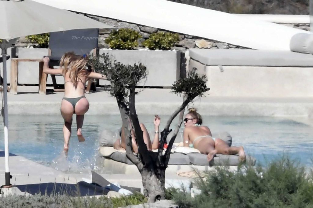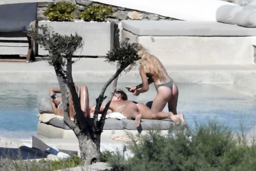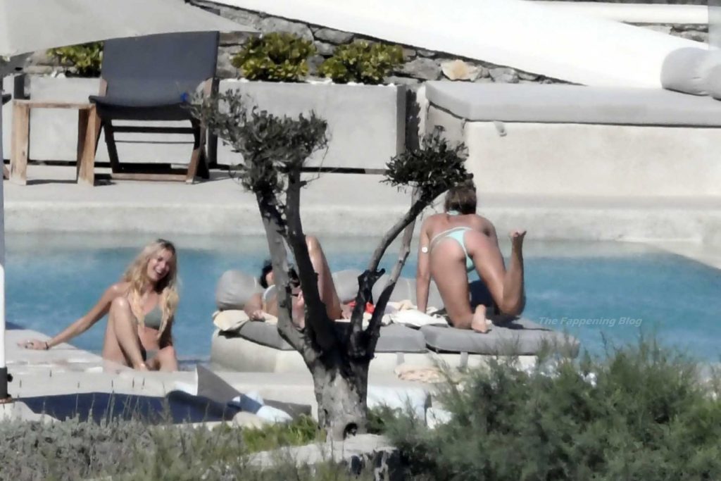 As duas belas em seus biquínis e até topless relaxam e brincam com alguns outros amigos enquanto tomam sol à beira da piscina durante sua estadia de férias em Mykonos.