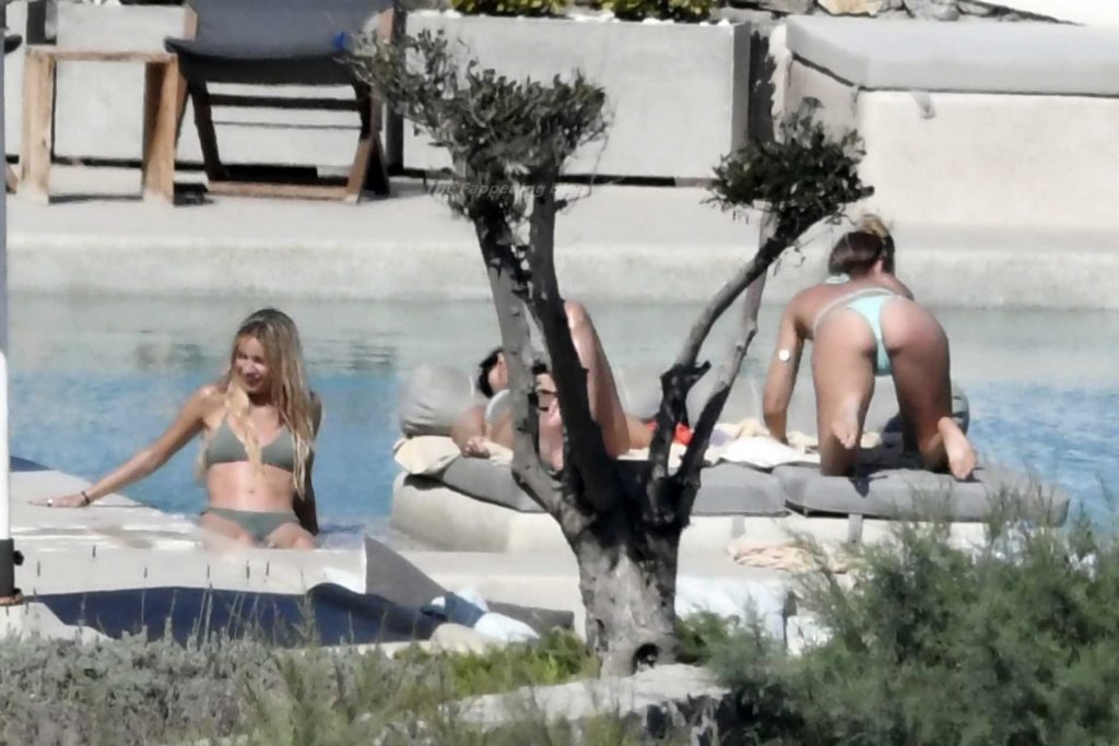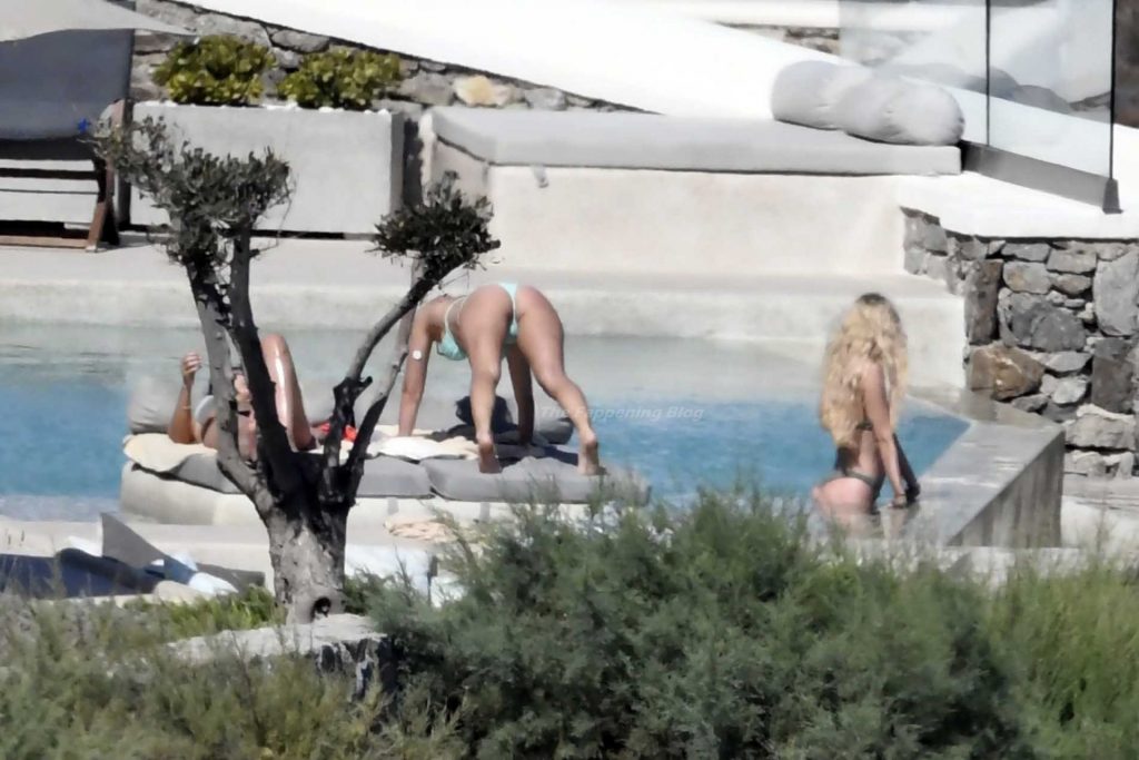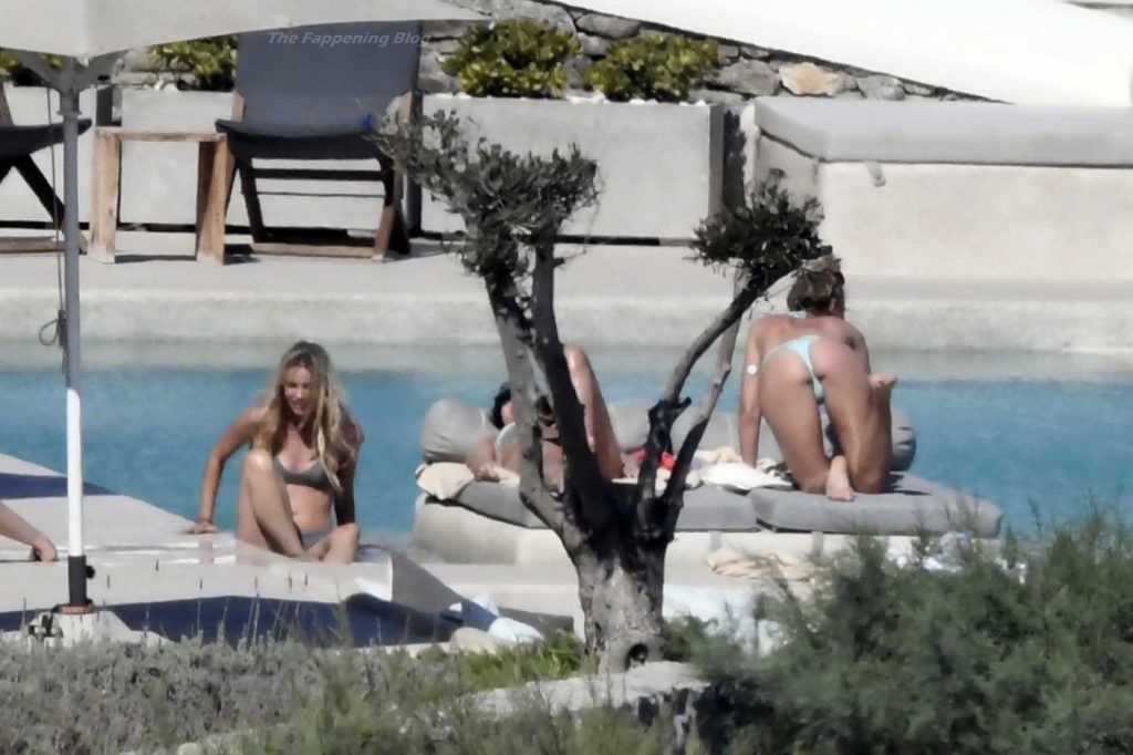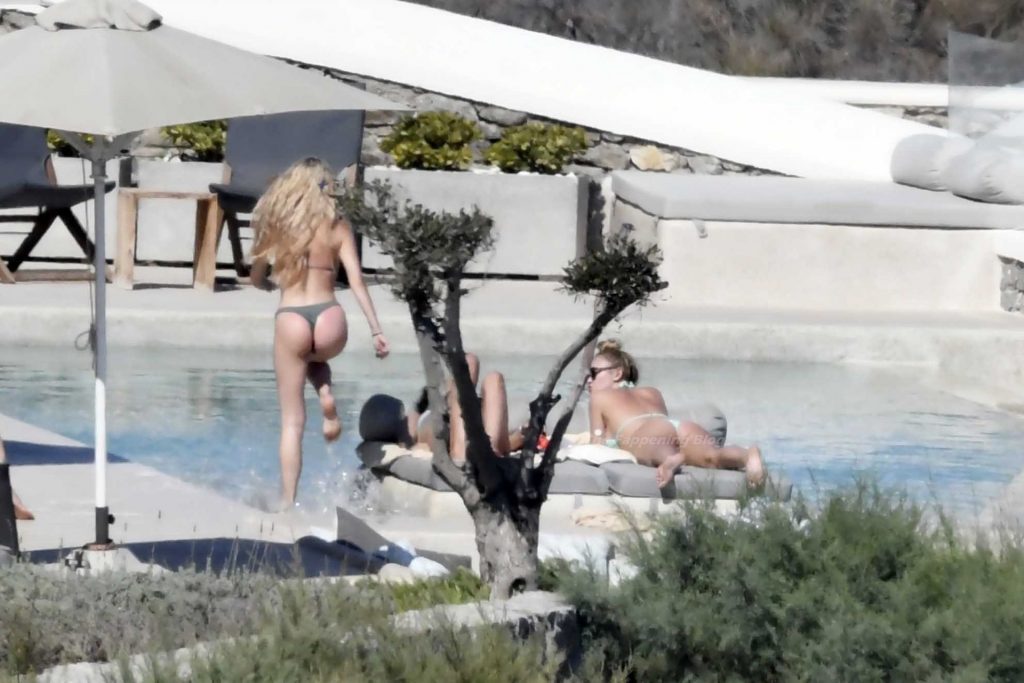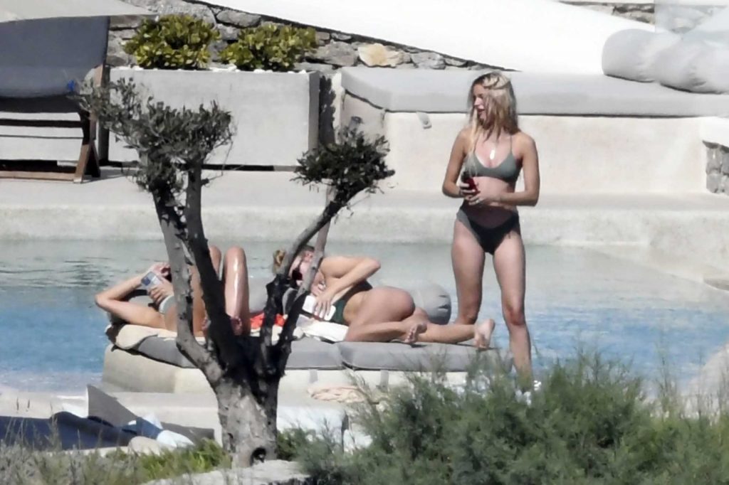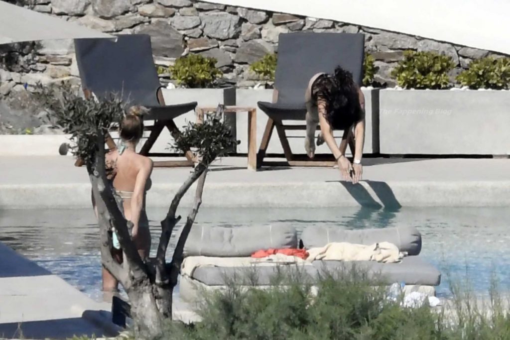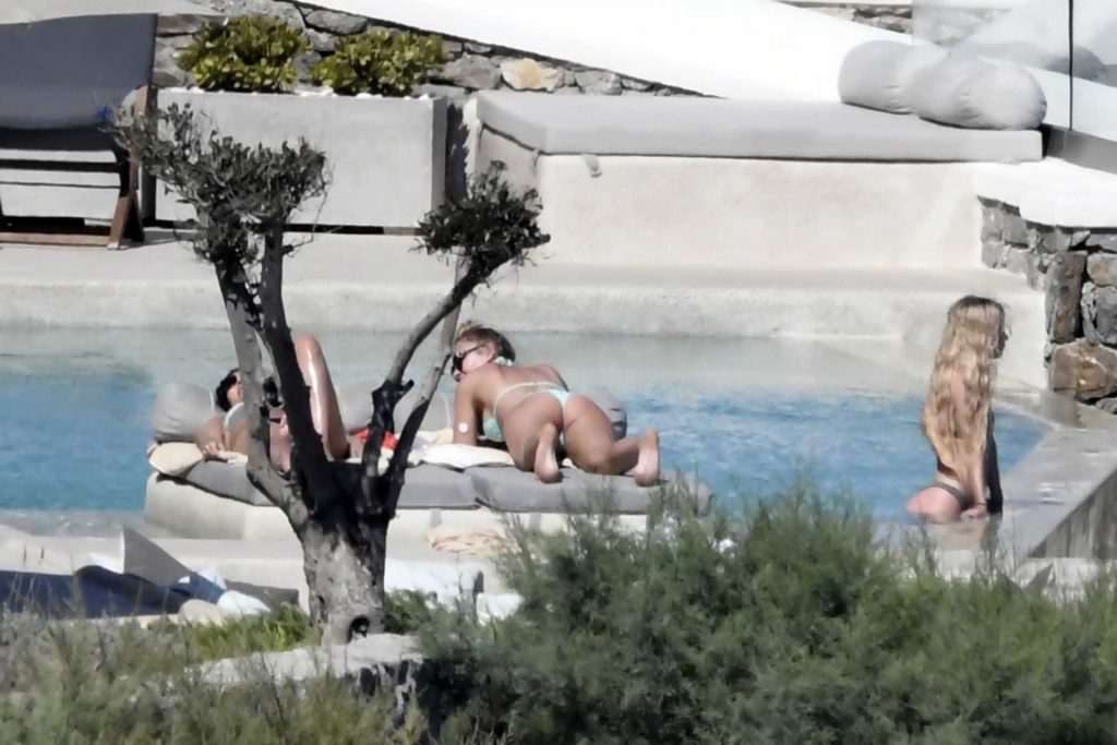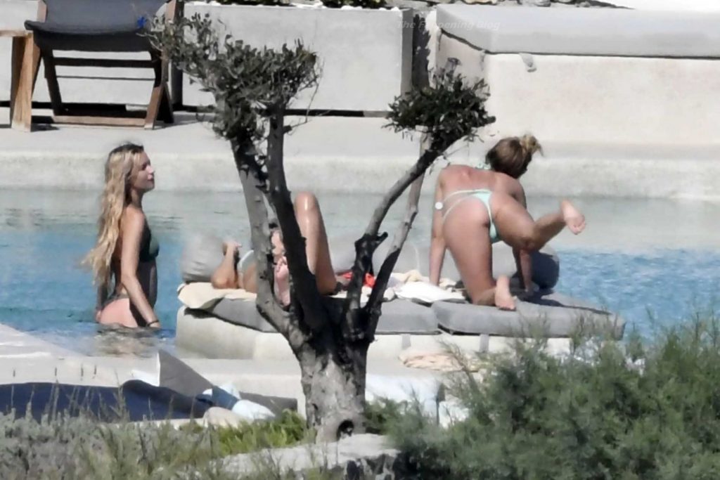 As duas belas em seus biquínis e até topless relaxam e brincam com alguns outros amigos enquanto tomam sol à beira da piscina durante sua estadia de férias em Mykonos.