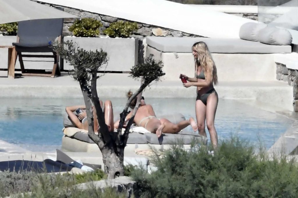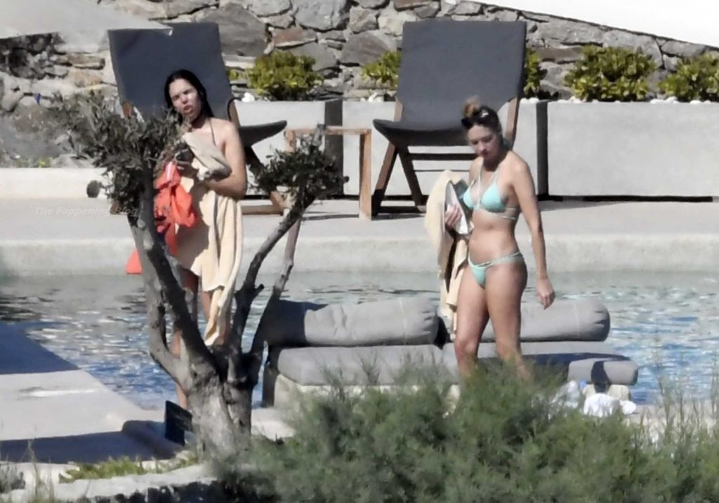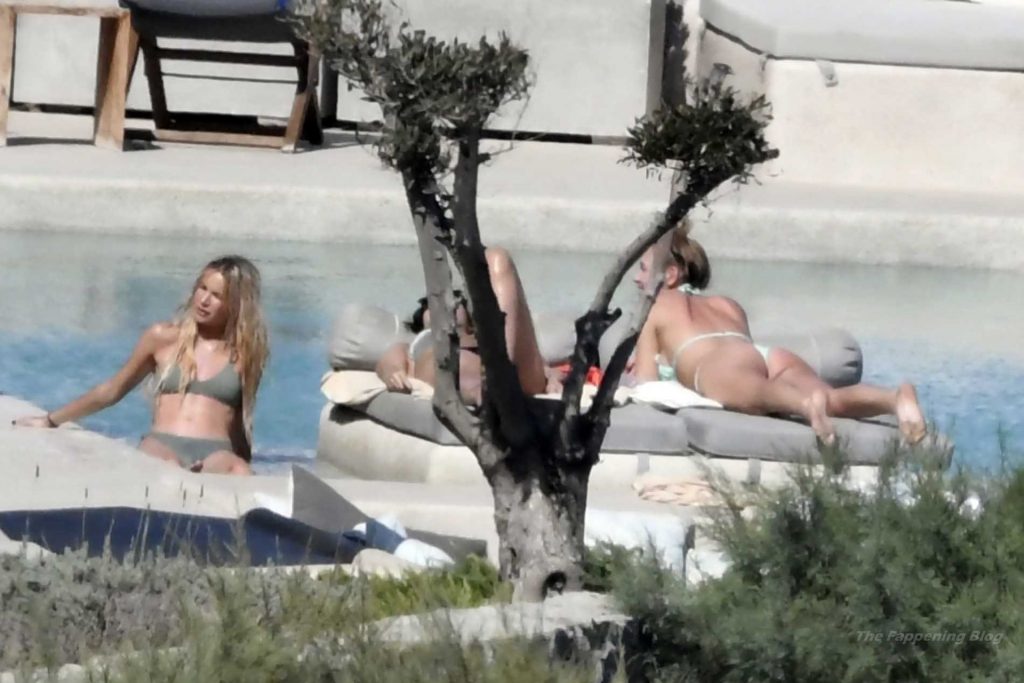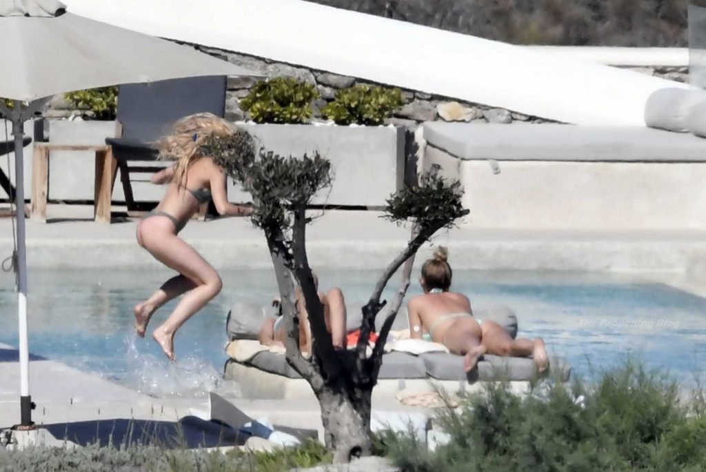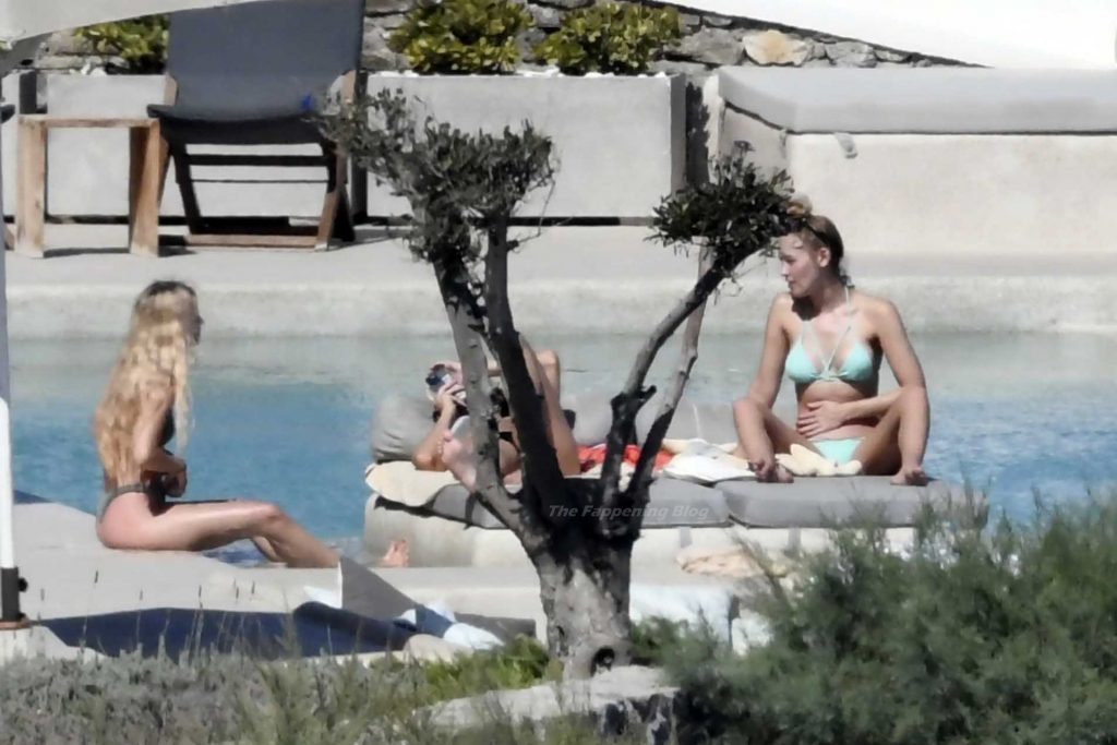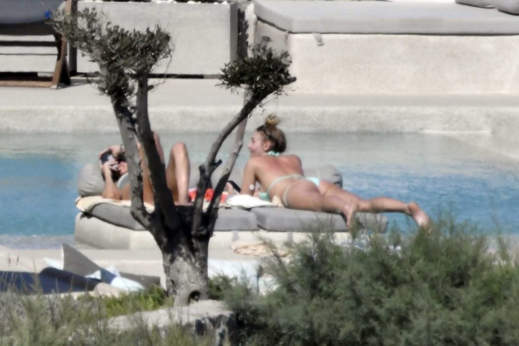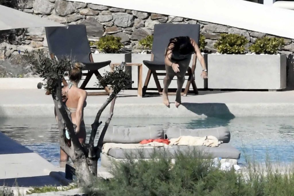 As duas belas em seus biquínis e até topless relaxam e brincam com alguns outros amigos enquanto tomam sol à beira da piscina durante sua estadia de férias em Mykonos.