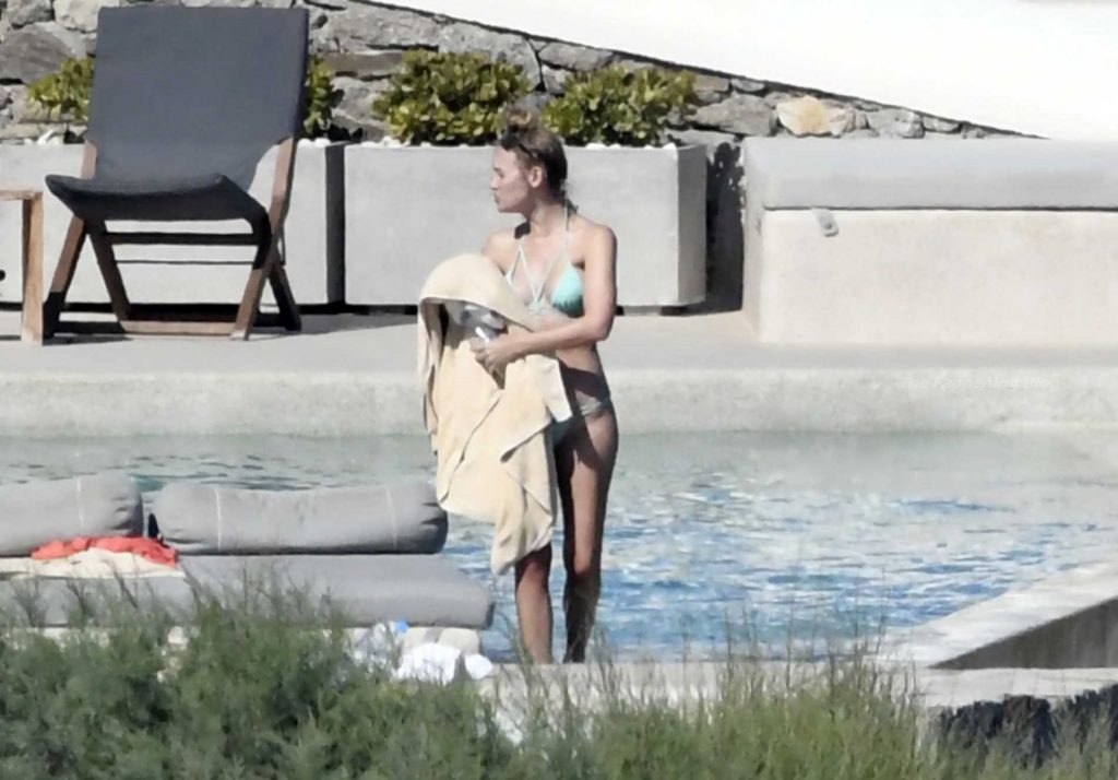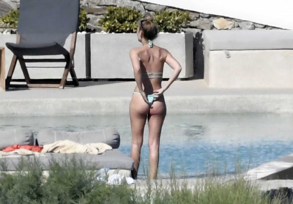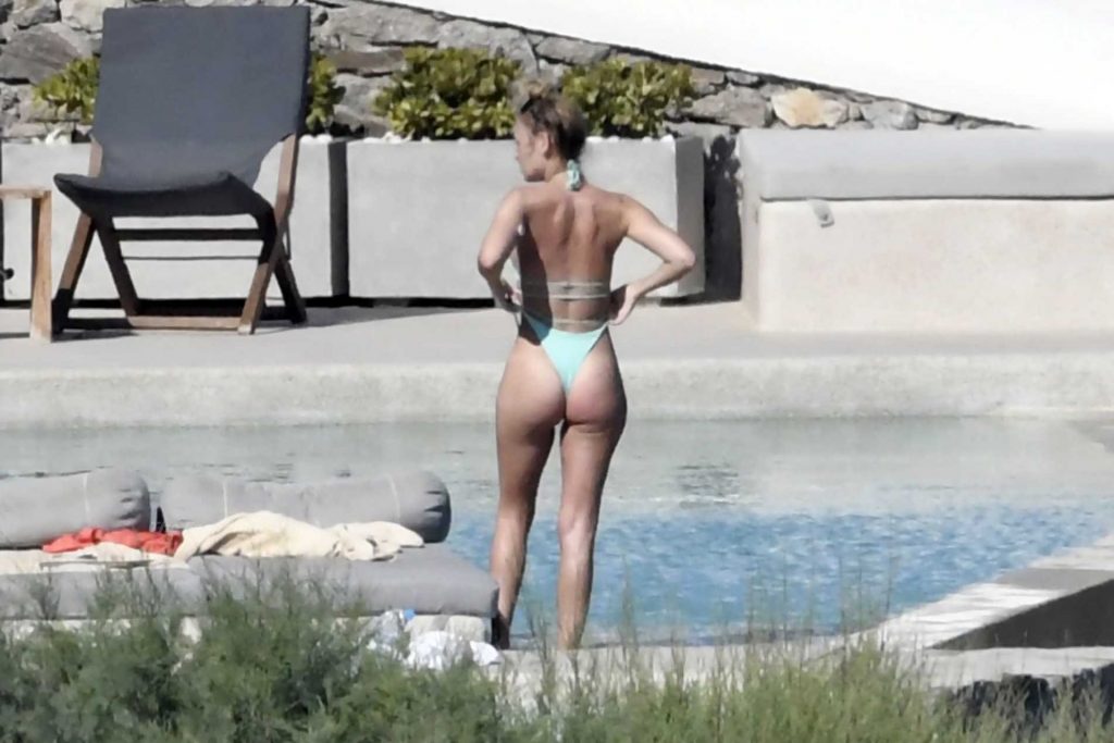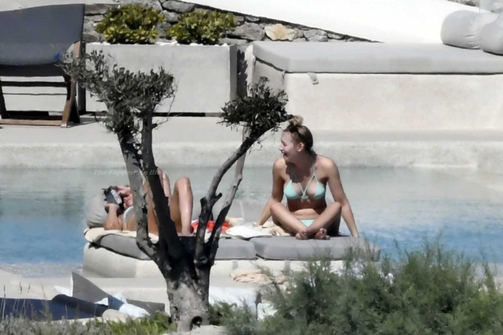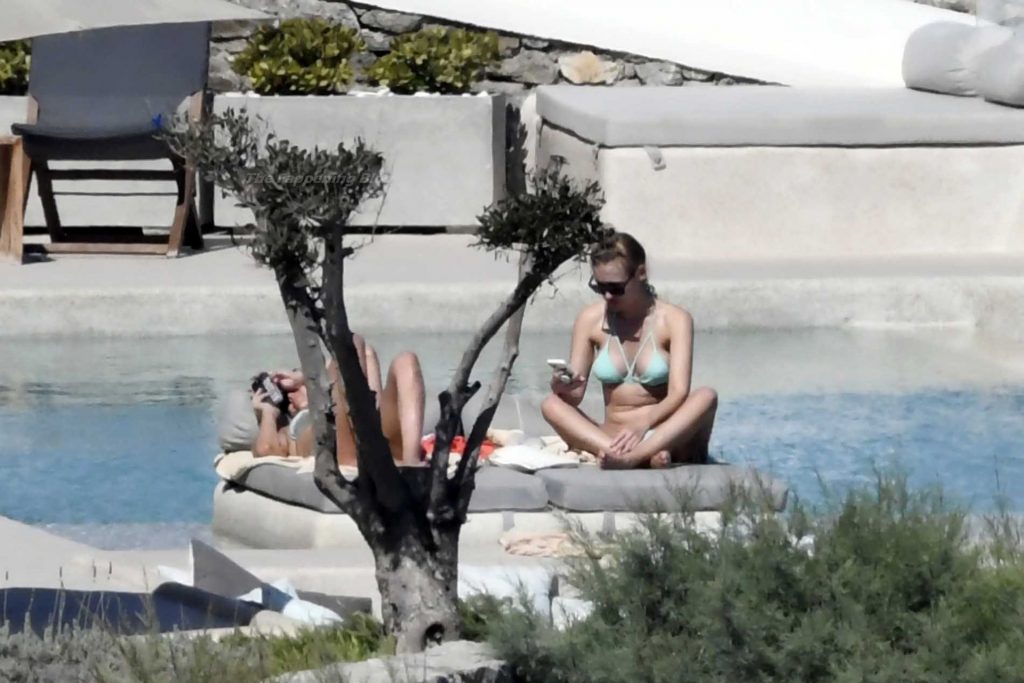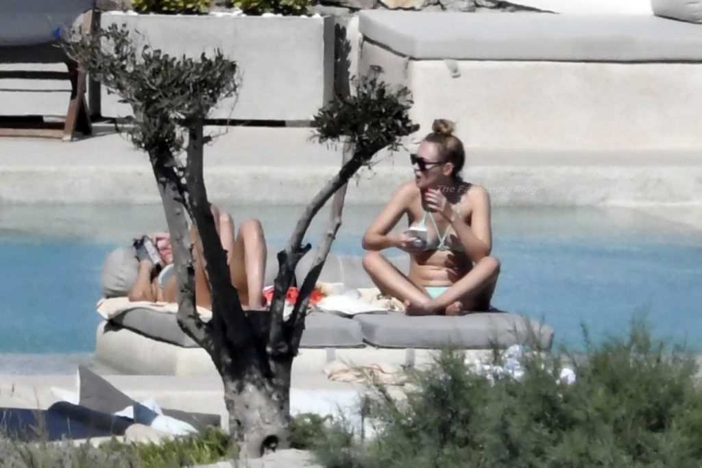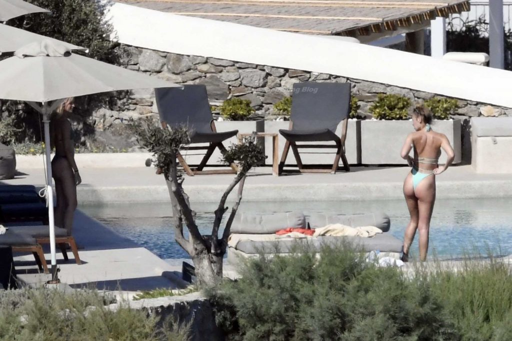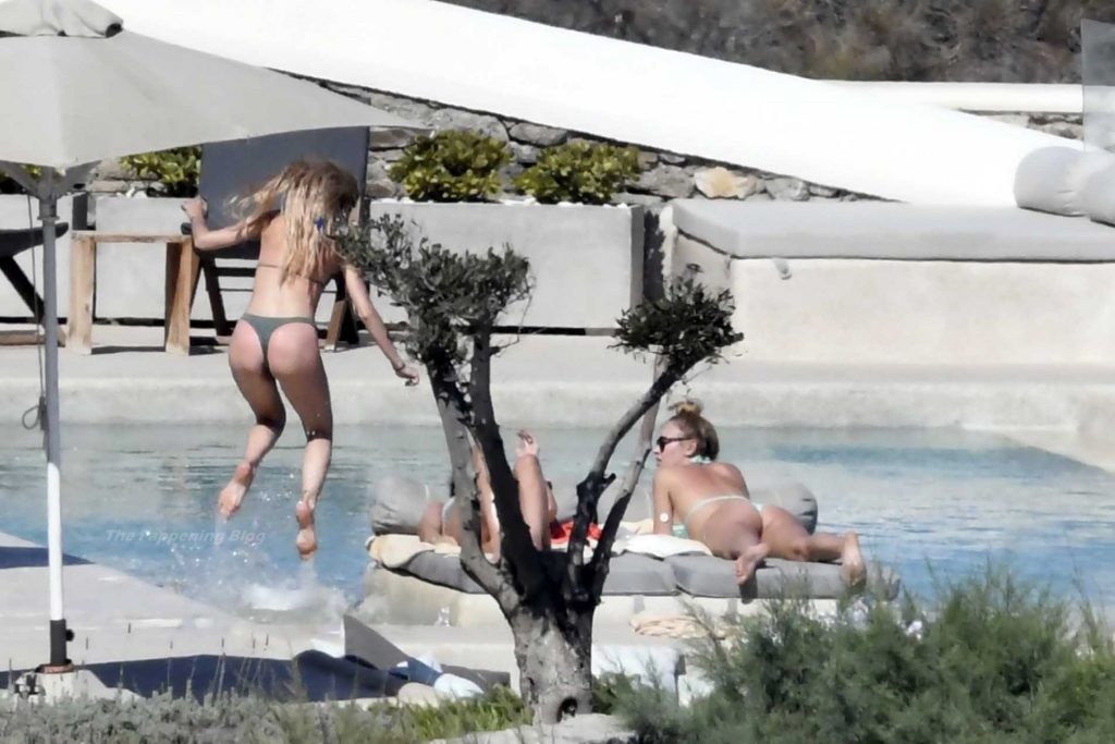 As duas belas em seus biquínis e até topless relaxam e brincam com alguns outros amigos enquanto tomam sol à beira da piscina durante sua estadia de férias em Mykonos.