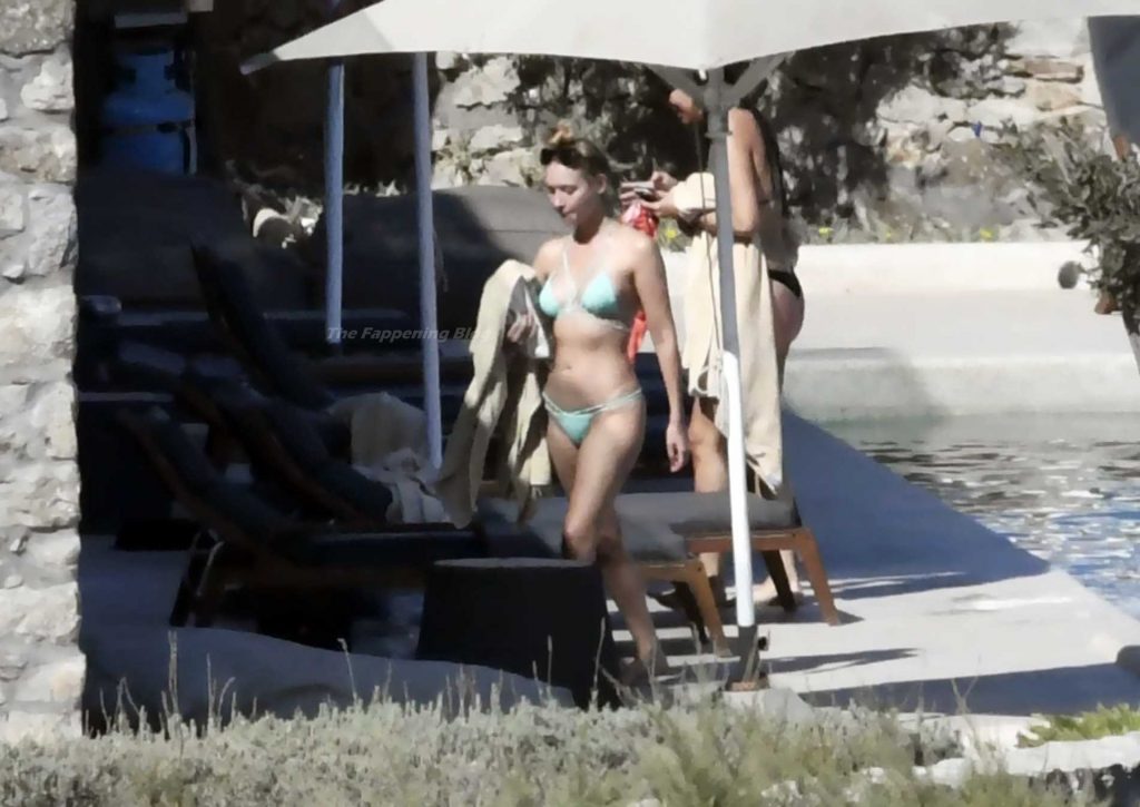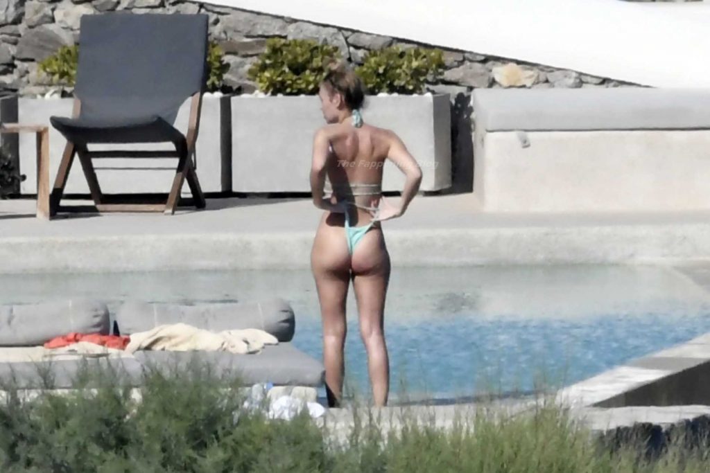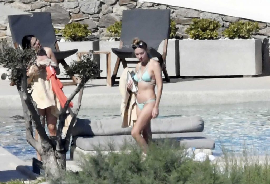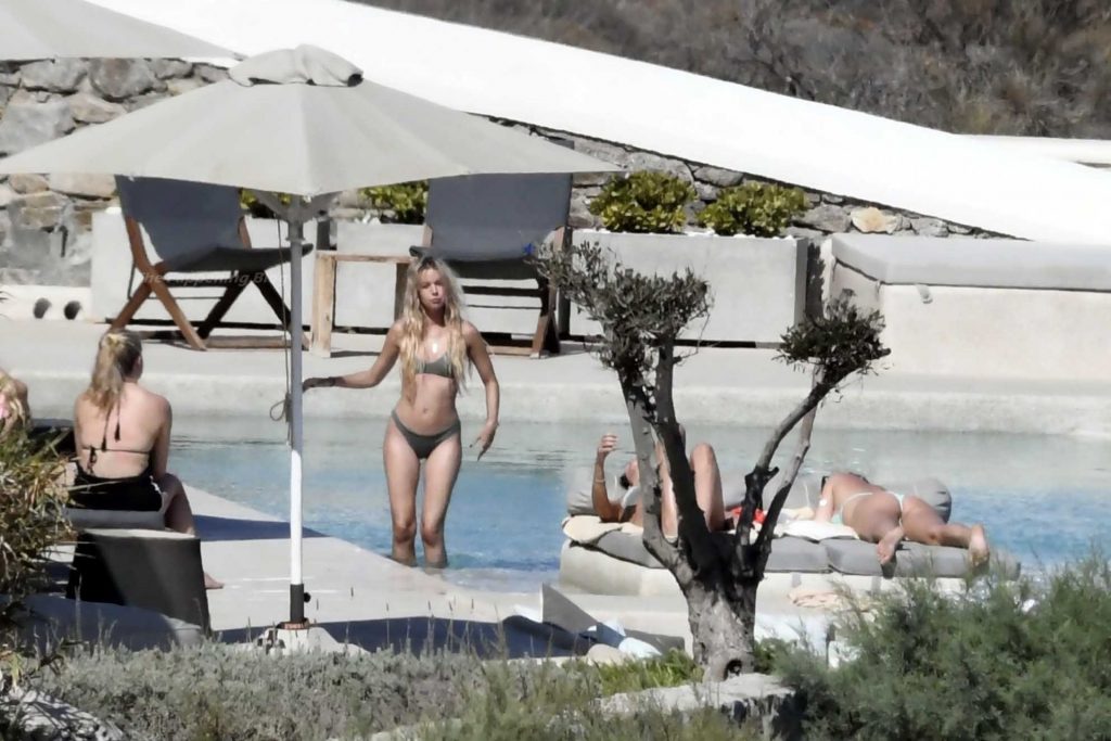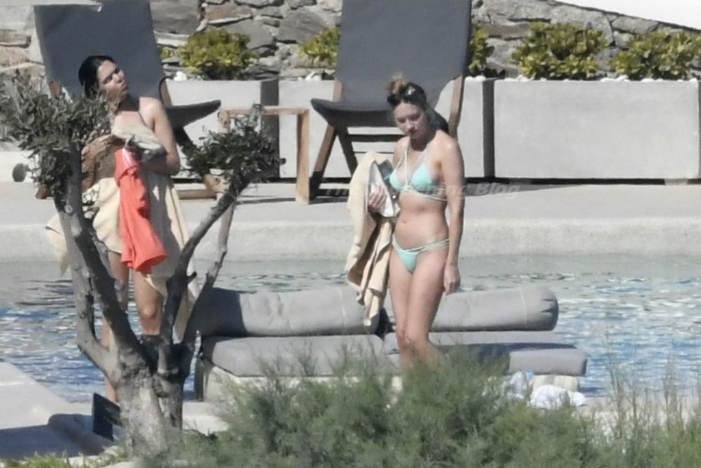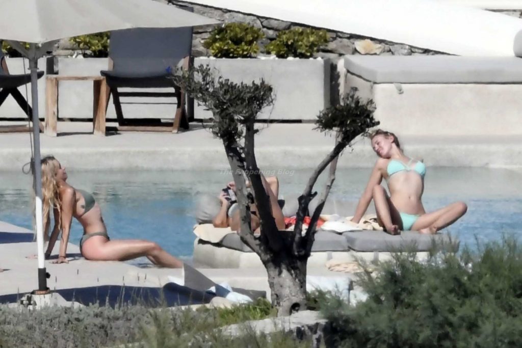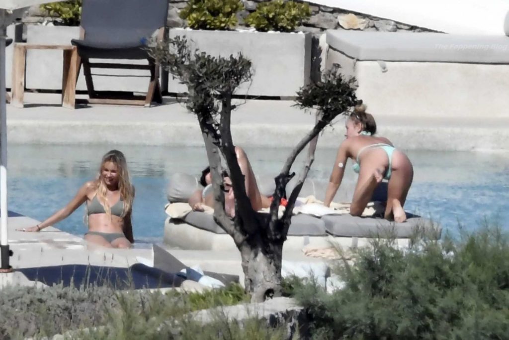 Modelos Roxy Horner, namorada do ator Jack Peter Benedict Whitehall, Sophie Longford e Sarah Elizabeth Lovegrove aproveitam o verão grego à beira da piscina, 16/08/2021.
