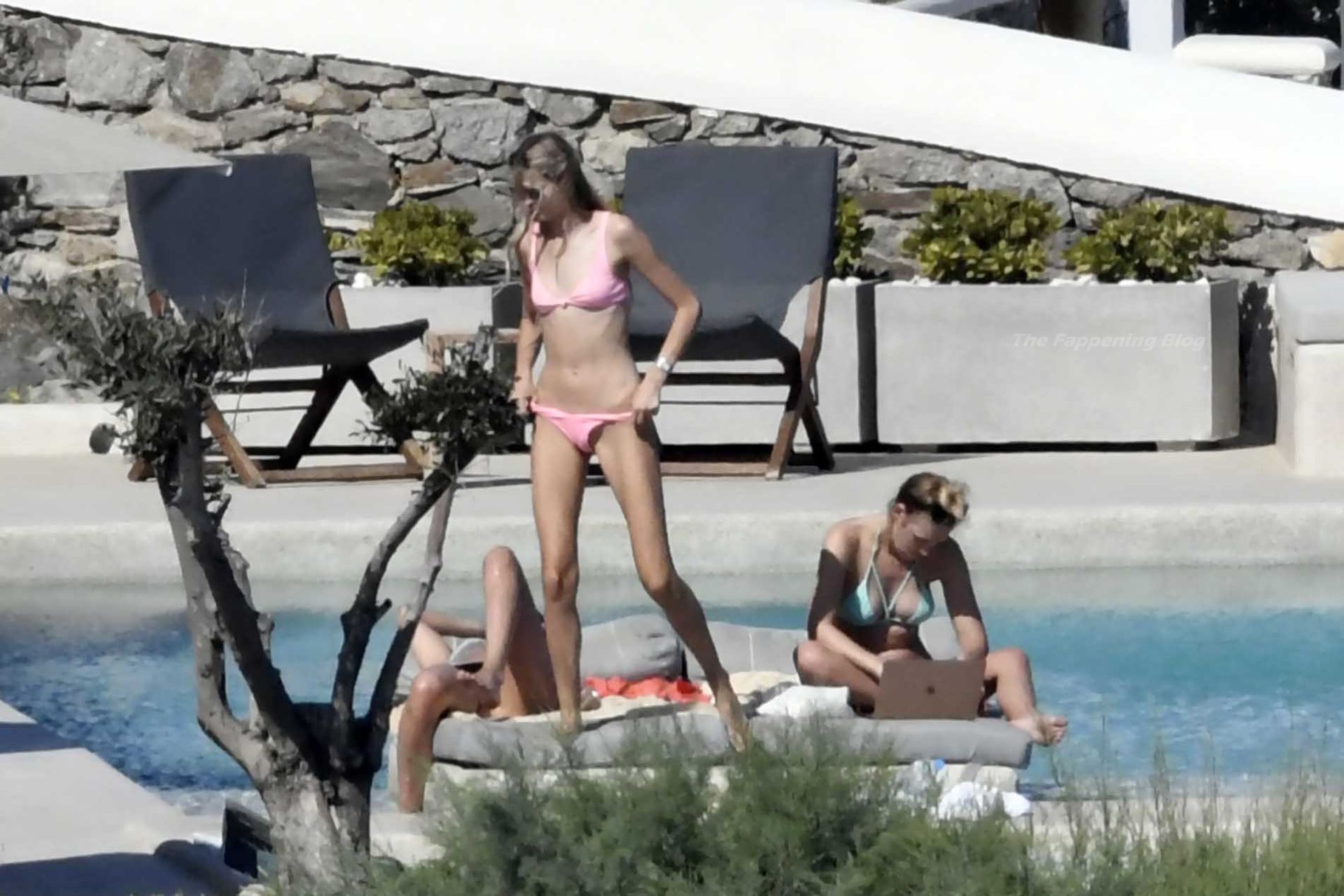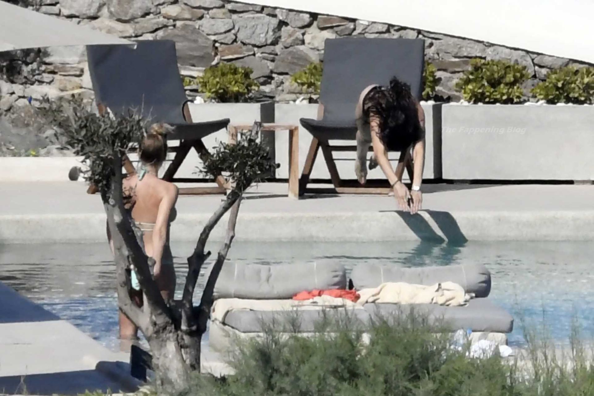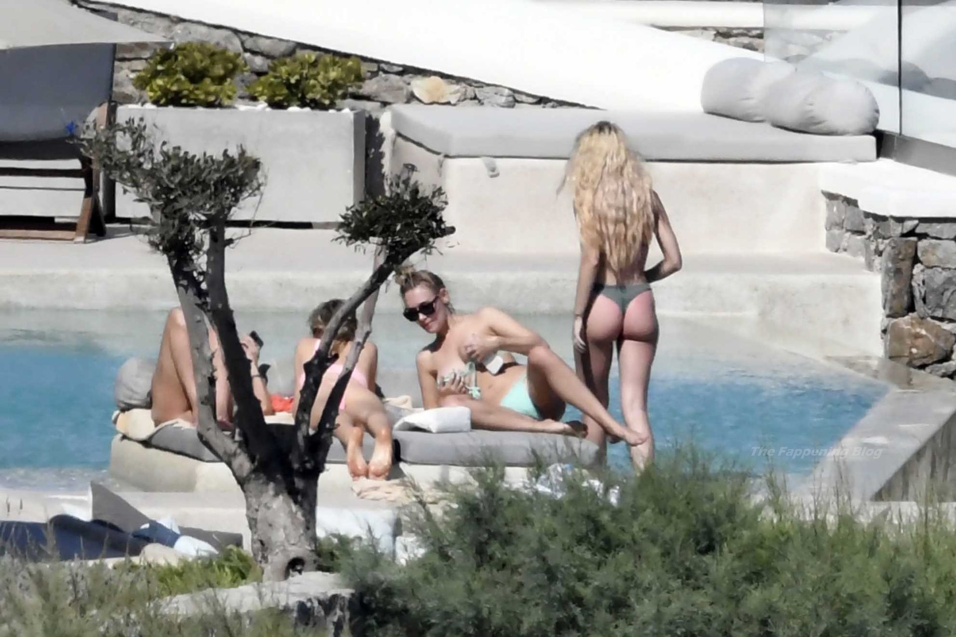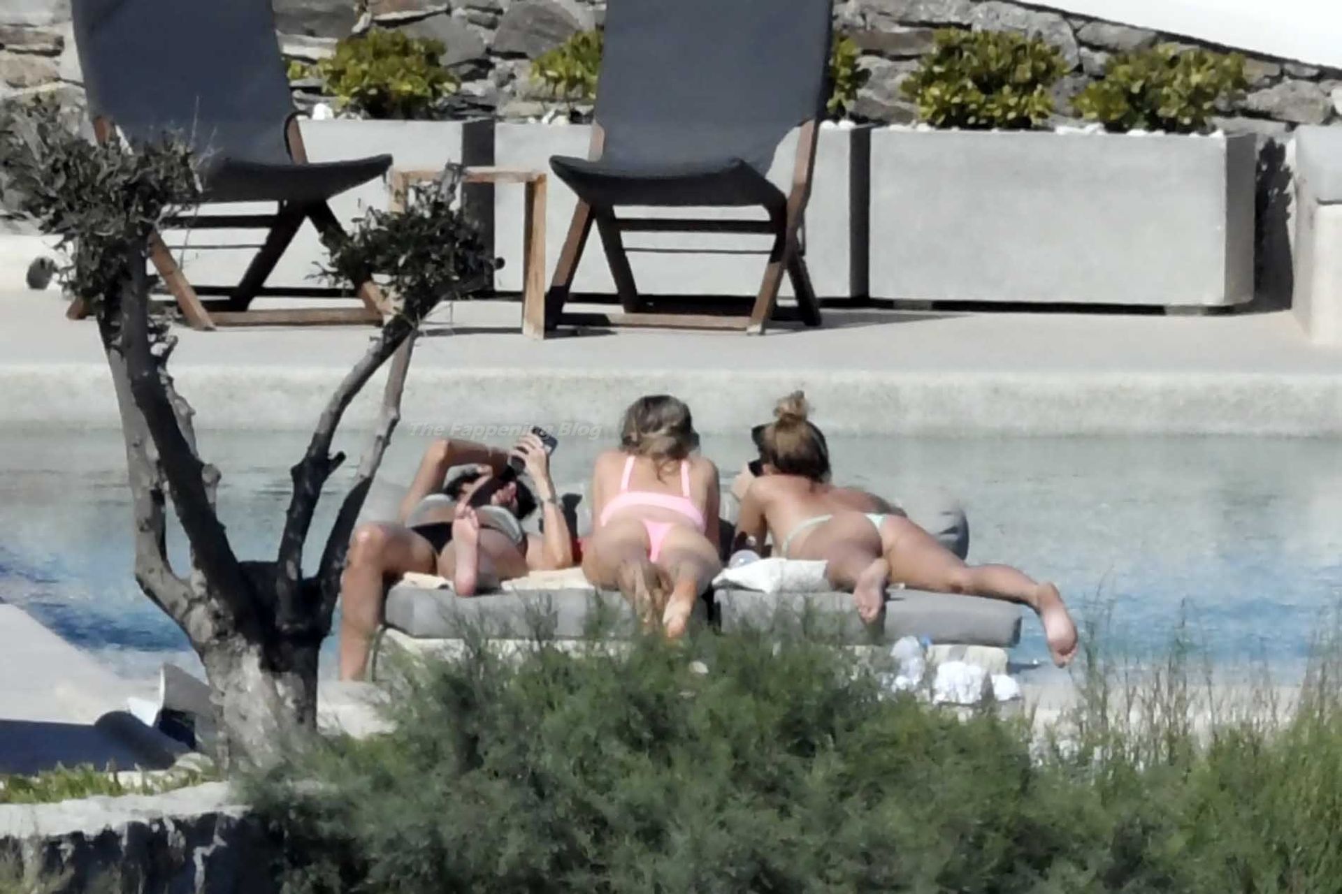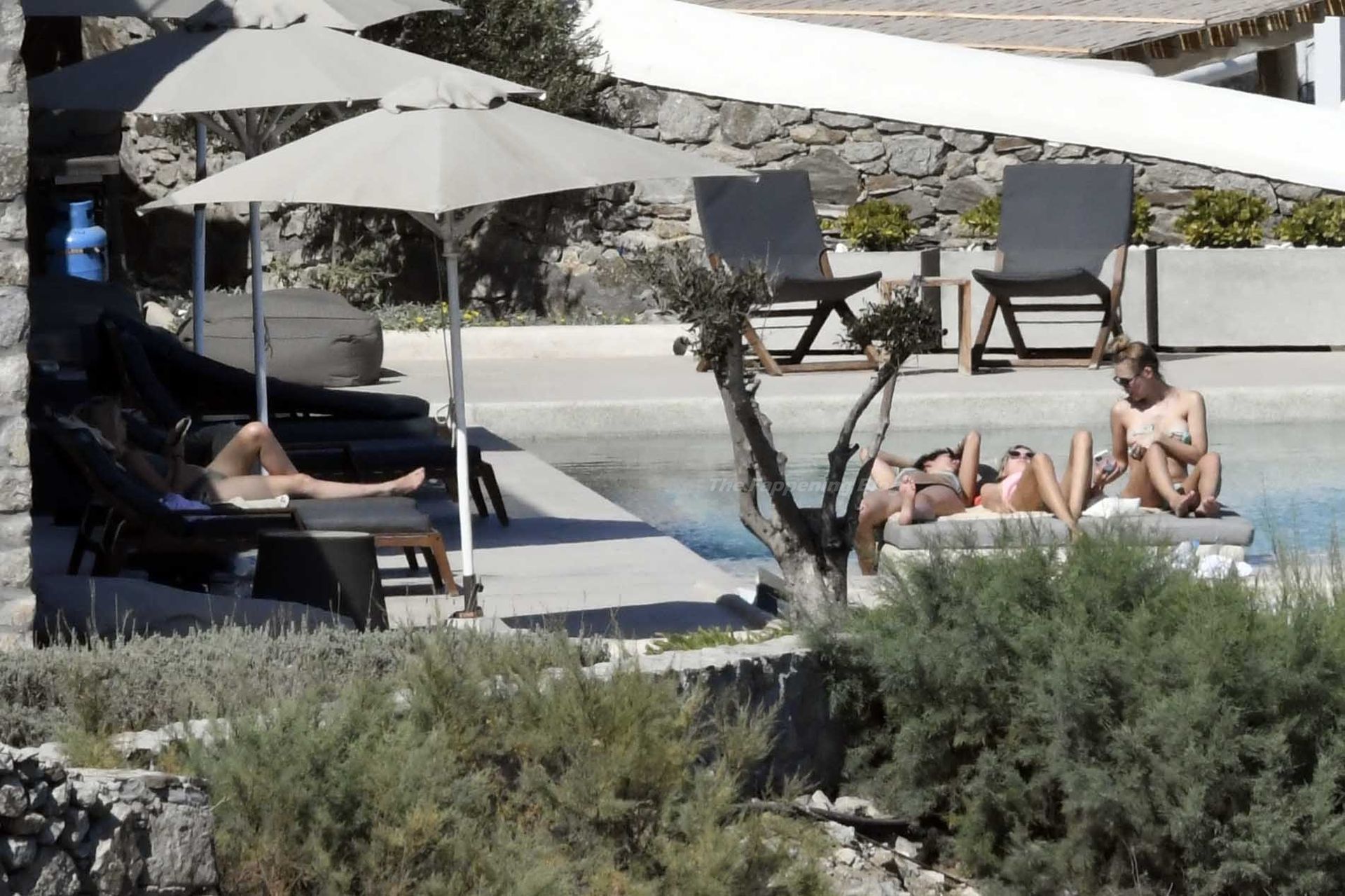 As duas belas em seus biquínis e até topless relaxam e brincam com alguns outros amigos enquanto tomam sol à beira da piscina durante sua estadia de férias em Mykonos.