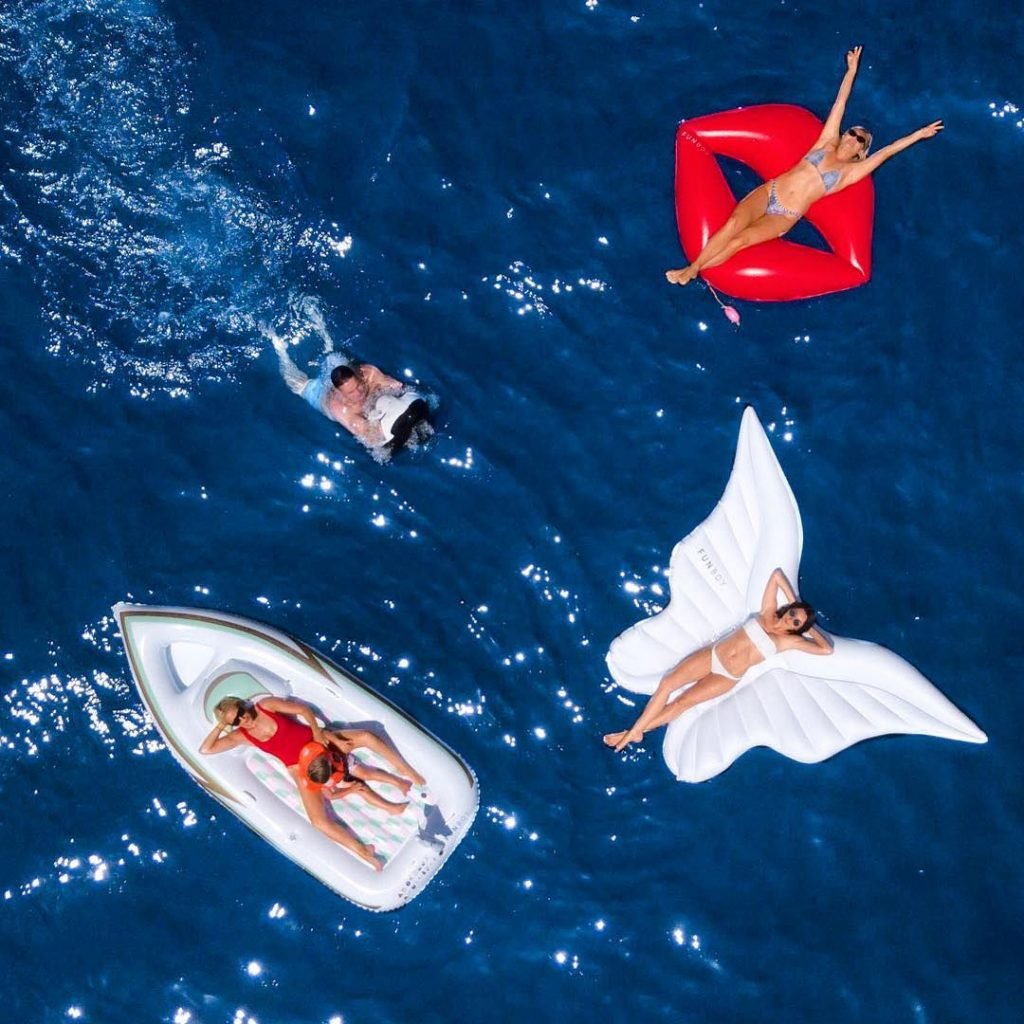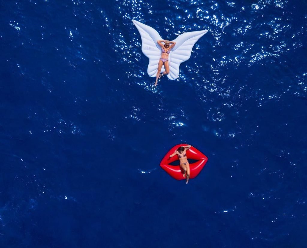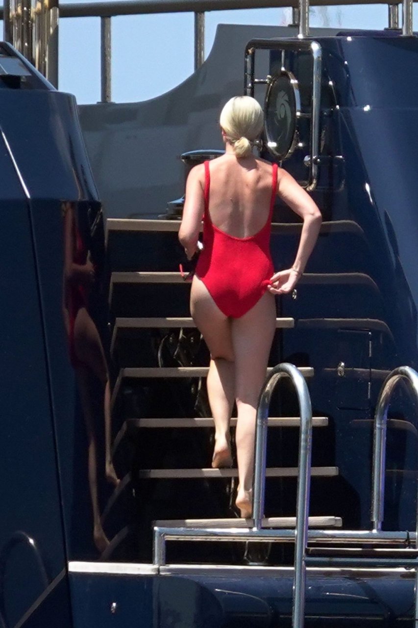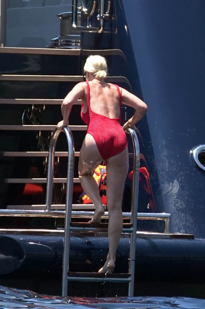 Roxy Jacenko e seu marido Oliver Curtis aproveitam um dia no mar durante as férias em Capri, 20/07/2018. A loira exibiu seu corpo milf usando um maiô vermelho.