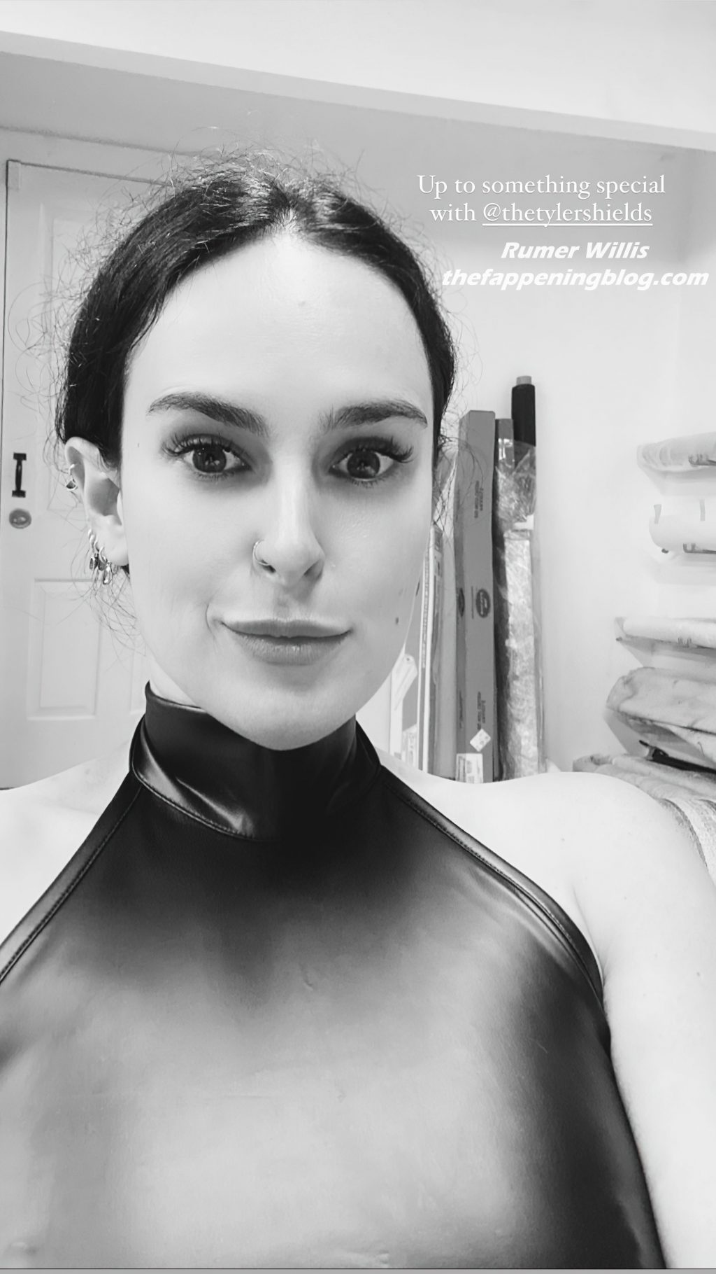 Aqui estão algumas fotos nuas e sexy de Rumer Willis em preto e branco e coloridas + selfie dos bastidores do seu ensaio fotográfico estilo BDSM por Tyler Shields. A atriz posa nua e com um body de látex preto como uma dominadora.