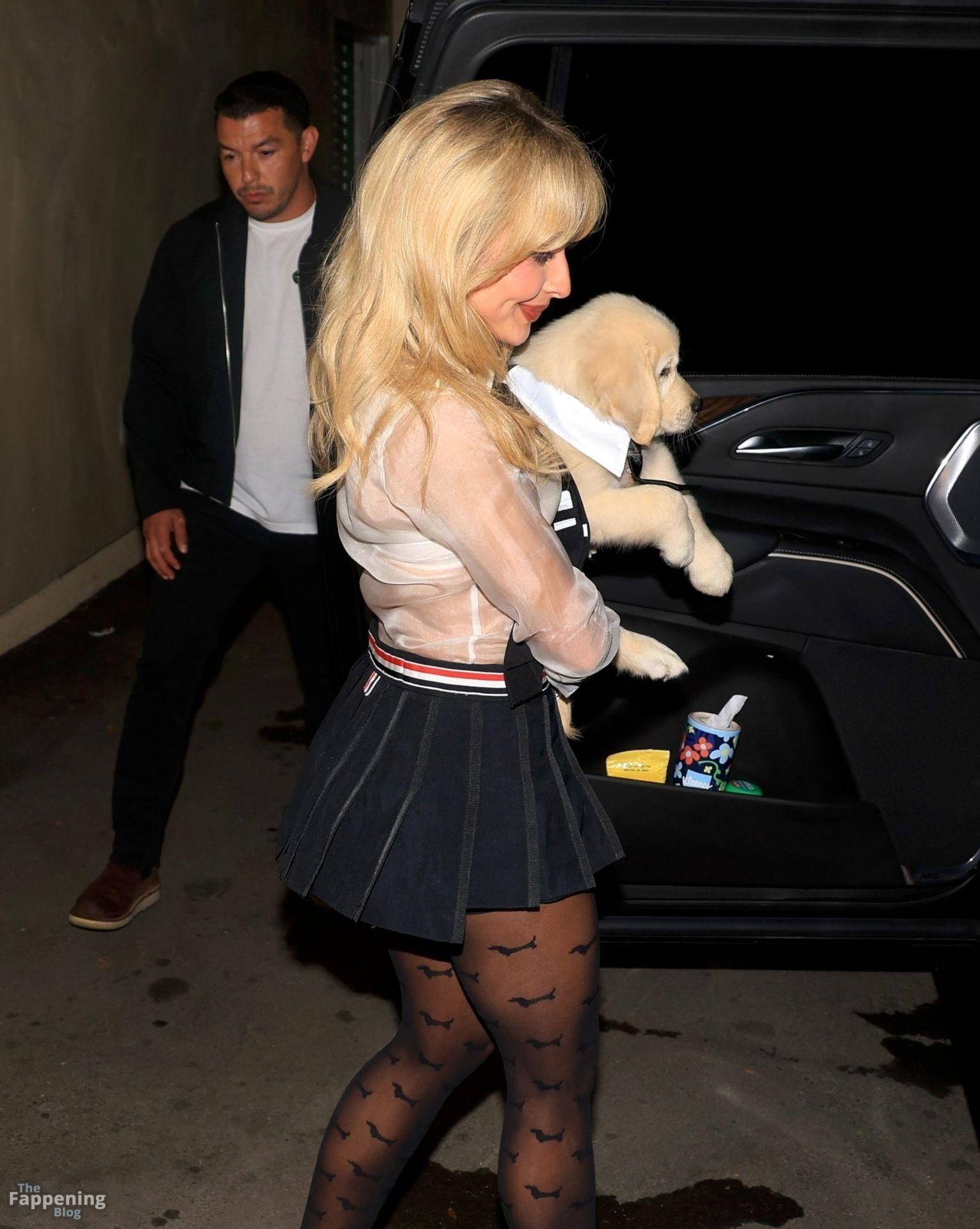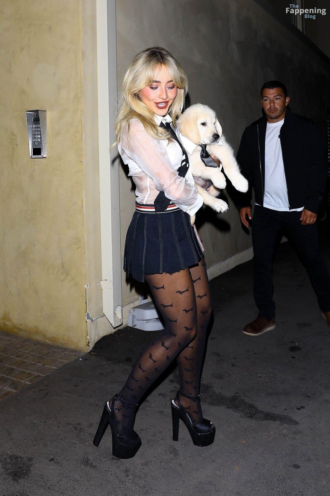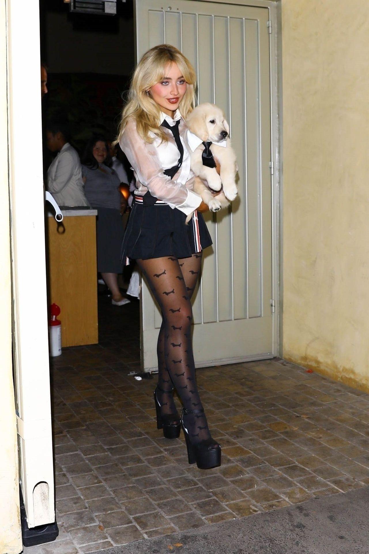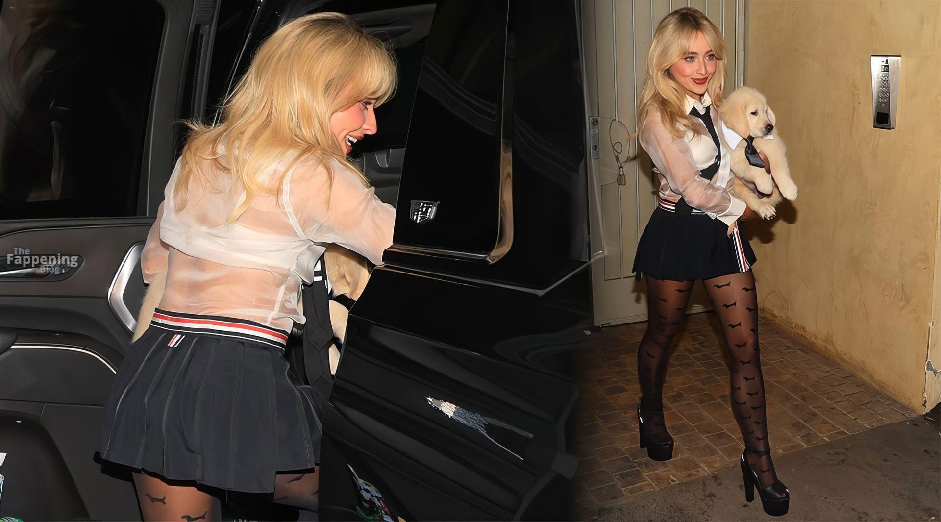 Confira Sabrina Carpenter em LA com uma blusa transparente e minissaia, exibindo suas pernas e bumbum no lançamento do álbum de Alba.