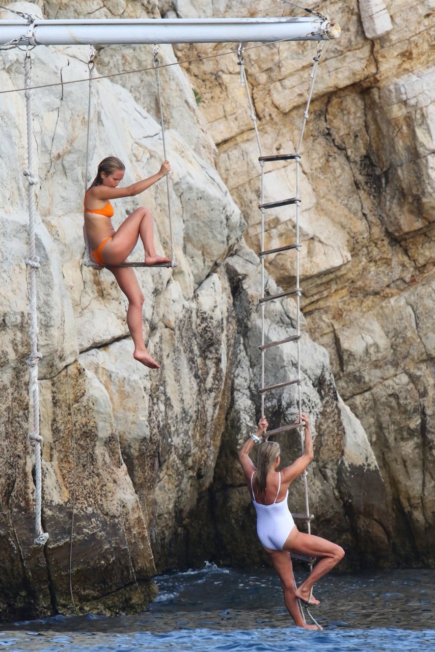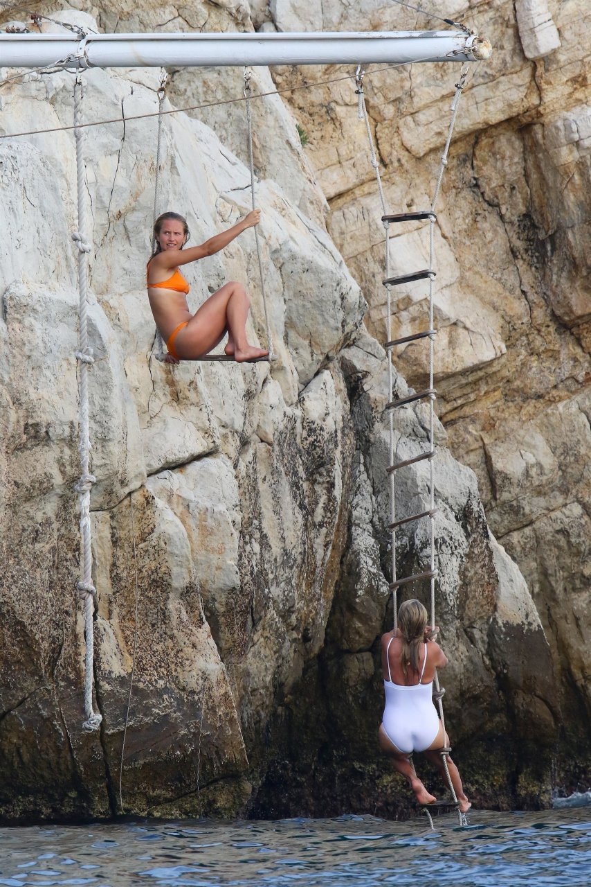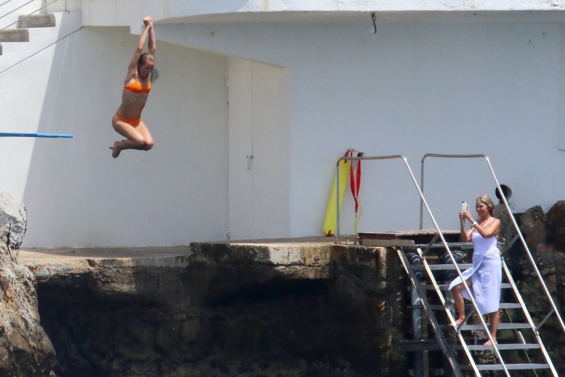 Sailor Lee Brinkley-Cook e sua mãe Christie Brinkley aproveitam uma tarde no Hotel Eden Roc, 10/06/2018. A dupla se diverte subindo em um balanço de corda e mergulhando nas águas azuis e cristalinas fora do hotel.