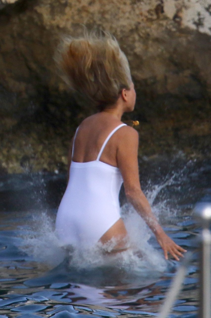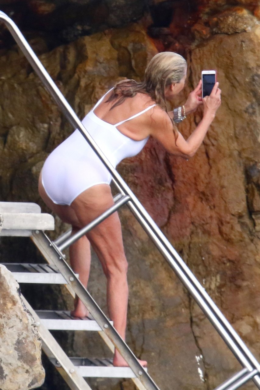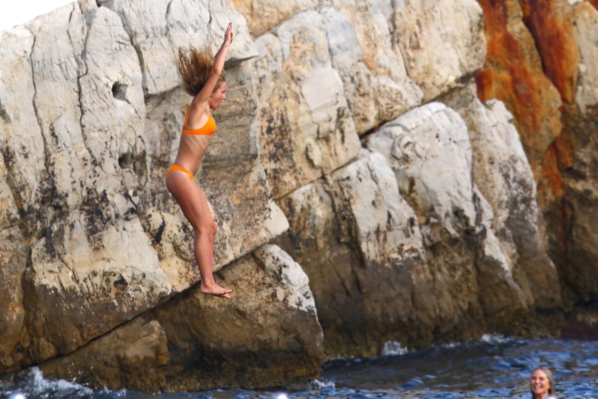 Sailor Lee Brinkley-Cook e sua mãe Christie Brinkley aproveitam uma tarde no Hotel Eden Roc, 10/06/2018. A dupla se diverte subindo em um balanço de corda e mergulhando nas águas azuis e cristalinas fora do hotel.