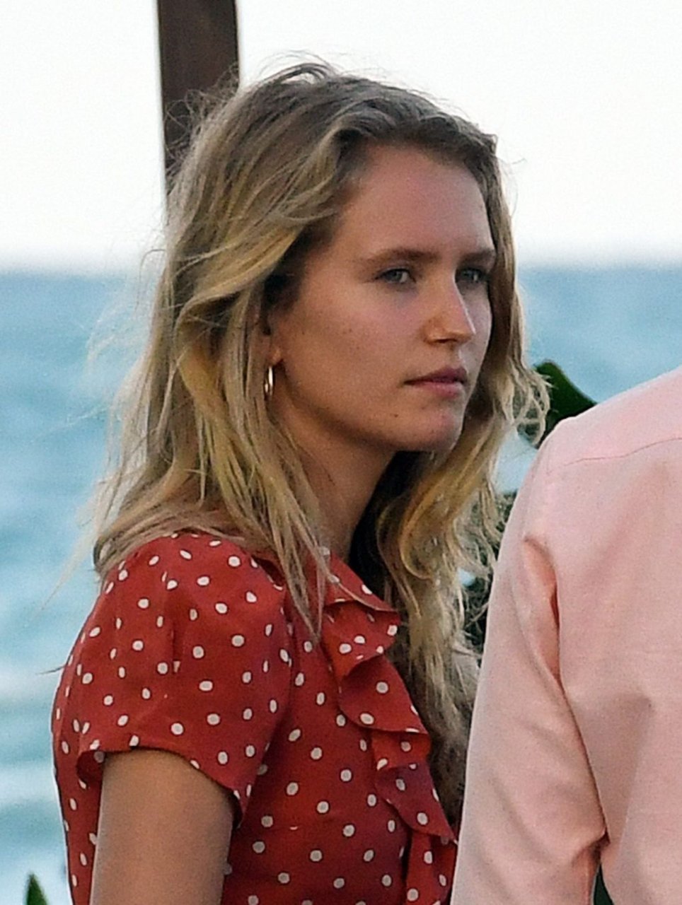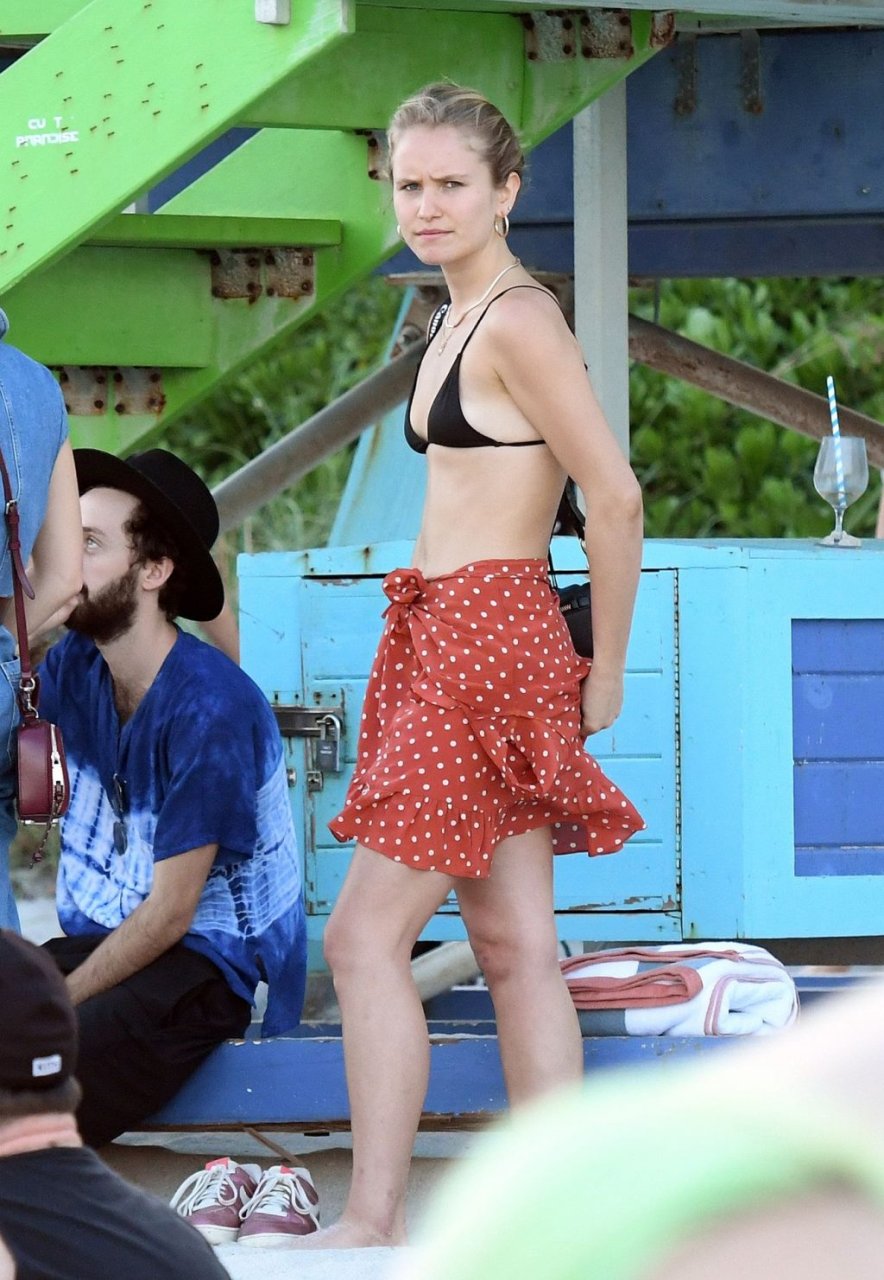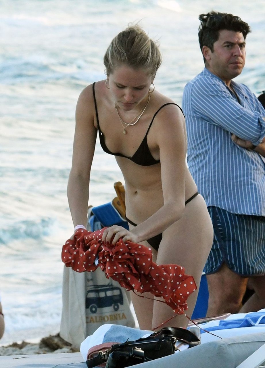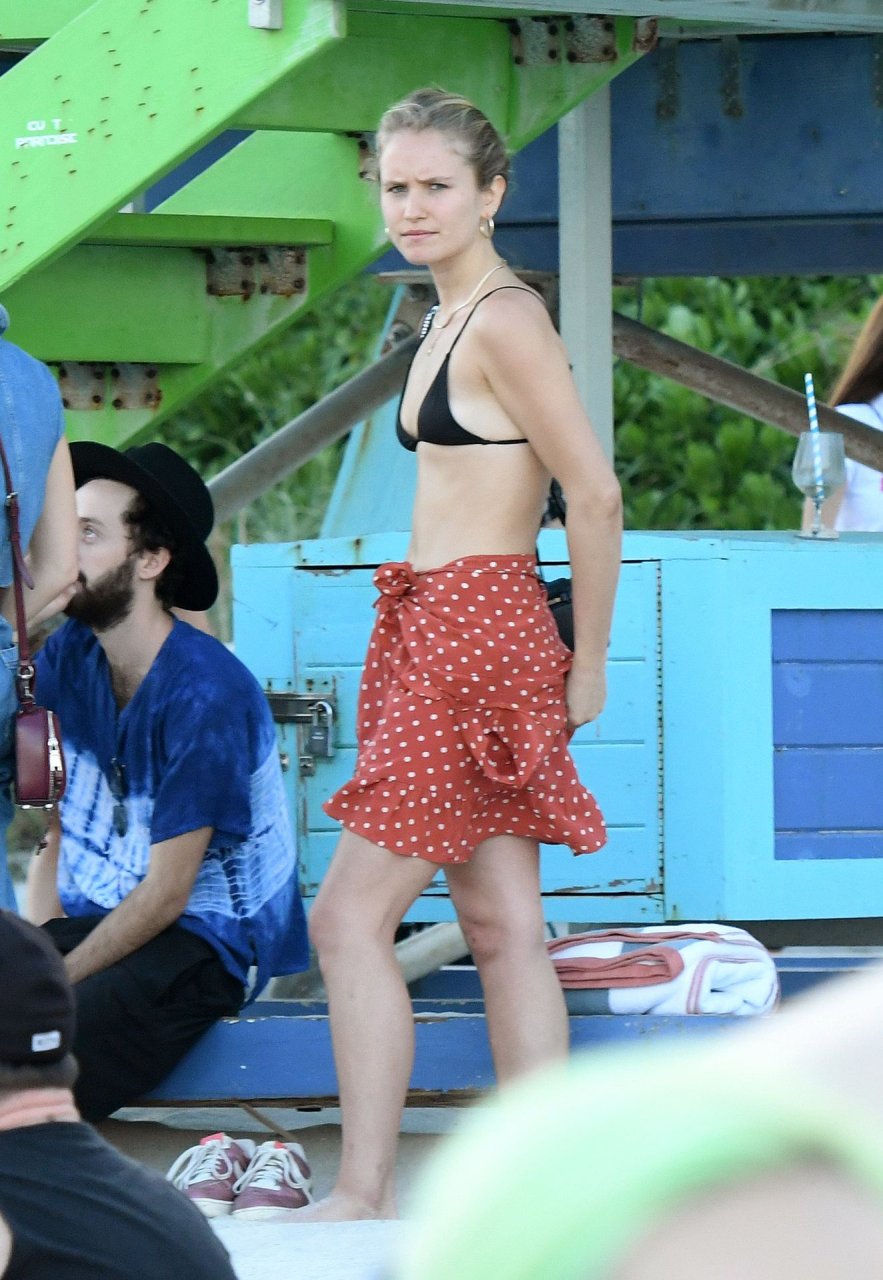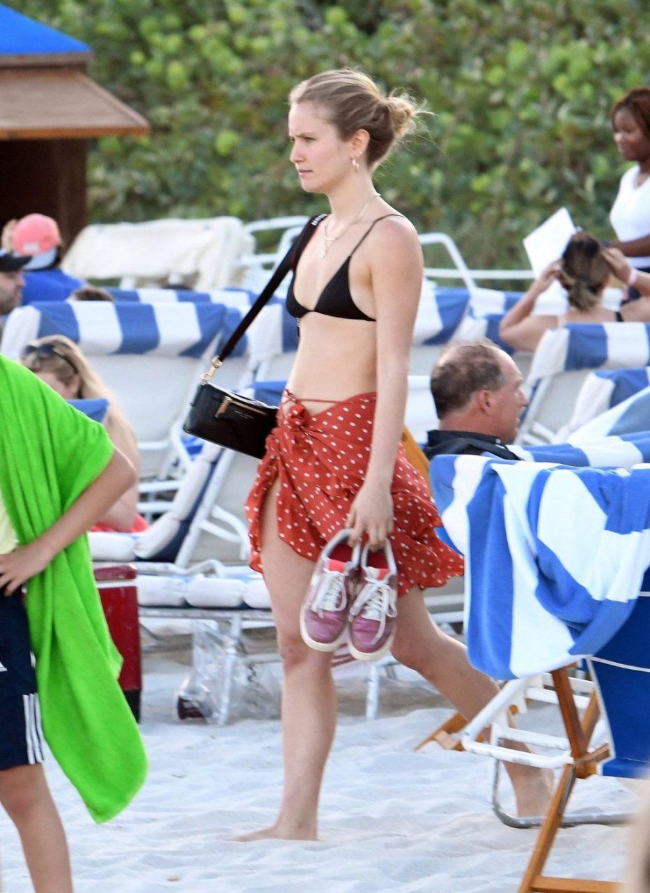 Modelo sem título Sailor Brinkley Cook usa um biquíni preto pequeno enquanto toma um mergulho ao pôr do sol na praia em Miami, 07/12/2018.