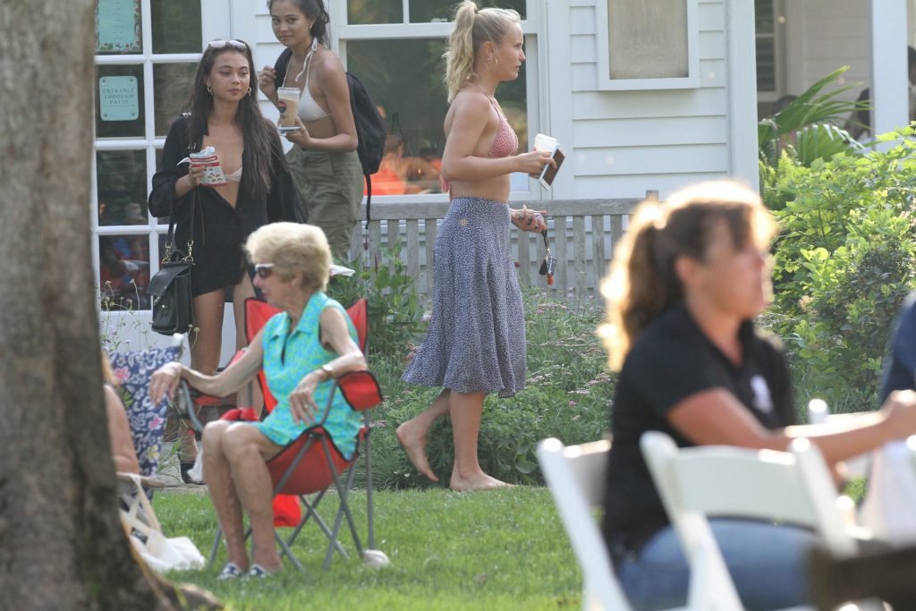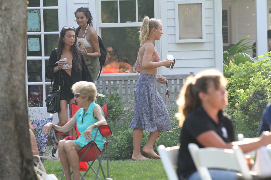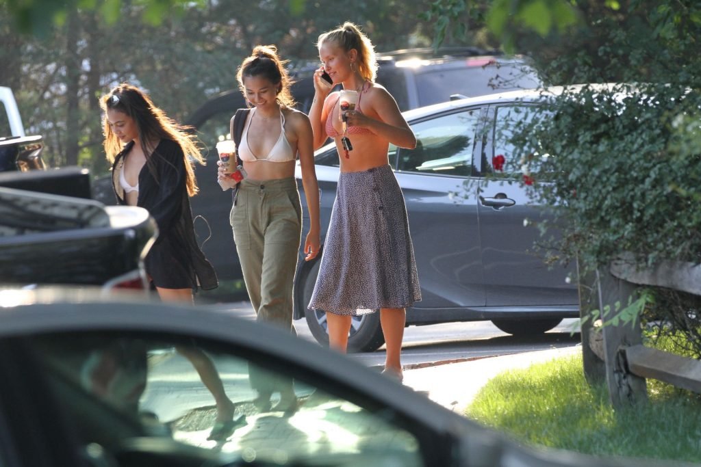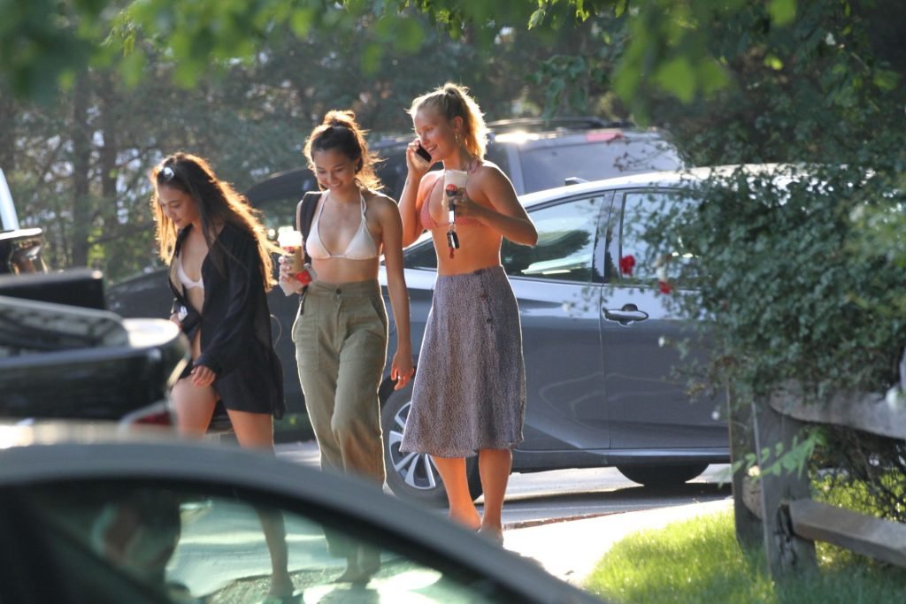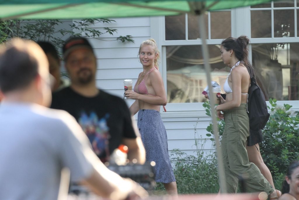 Sailor Brinkley usa um top de biquíni e um vestido azul enquanto estava nos Hamptons no fim de semana com amigos, 22/07/2019.