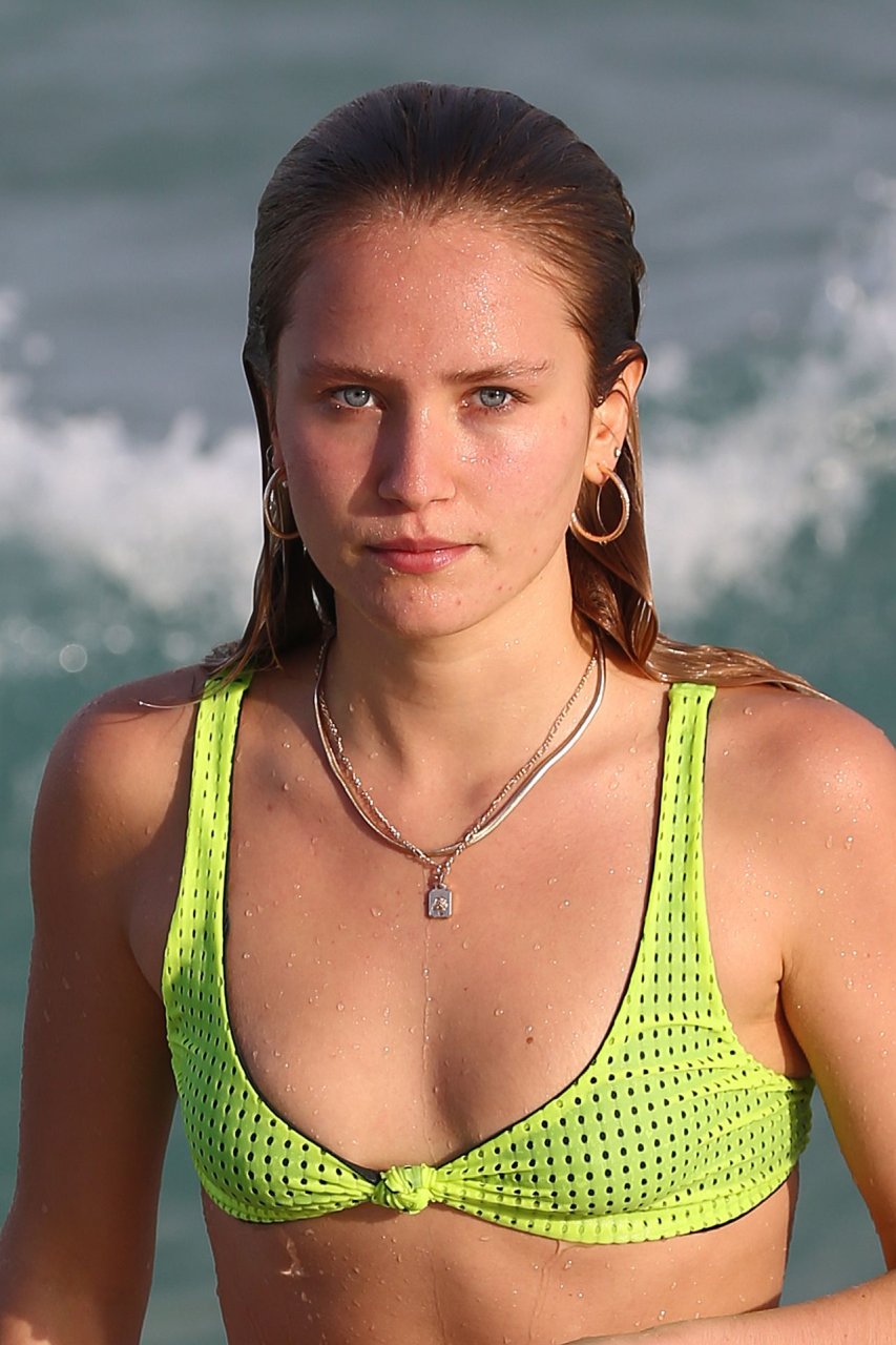 Model Sailor Lee Brinkley-Cook (20) está ótima em um biquíni amarelo neon na praia em Miami, 12/08/2018.