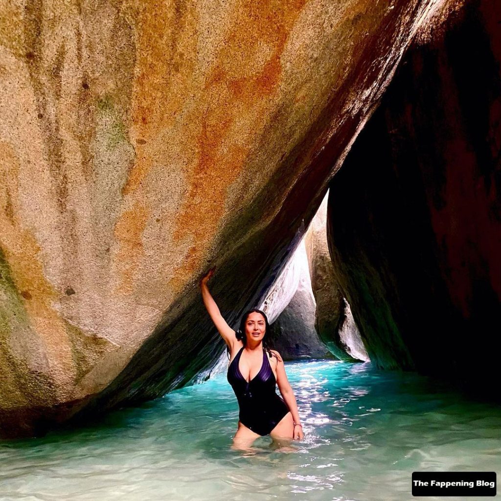Atriz Salma Hayek exibe suas curvas deslumbrantes enquanto posa de maiô para seus seguidores no Instagram (janeiro de 2022).
