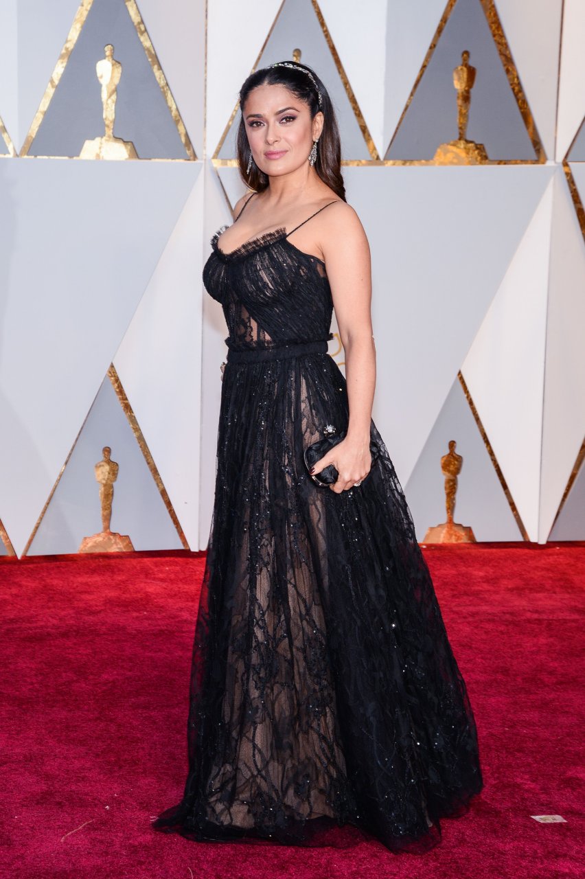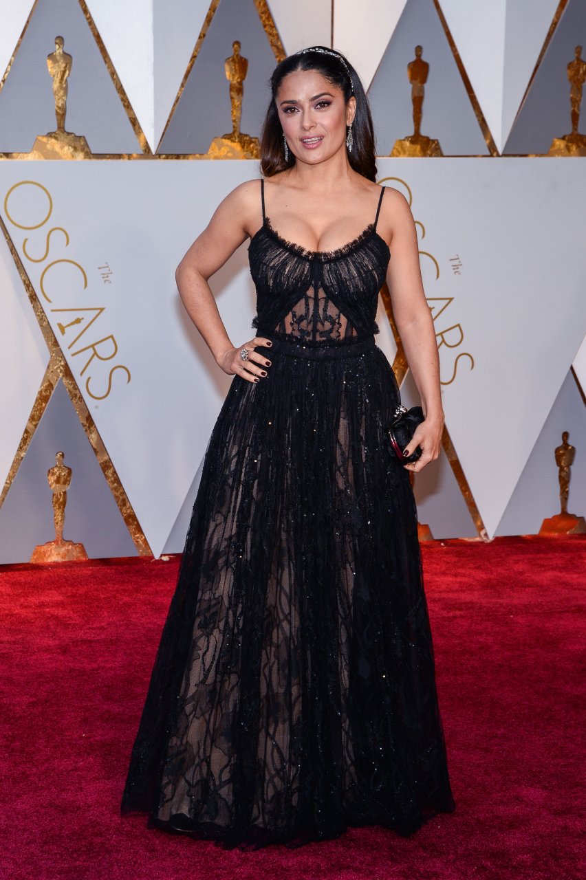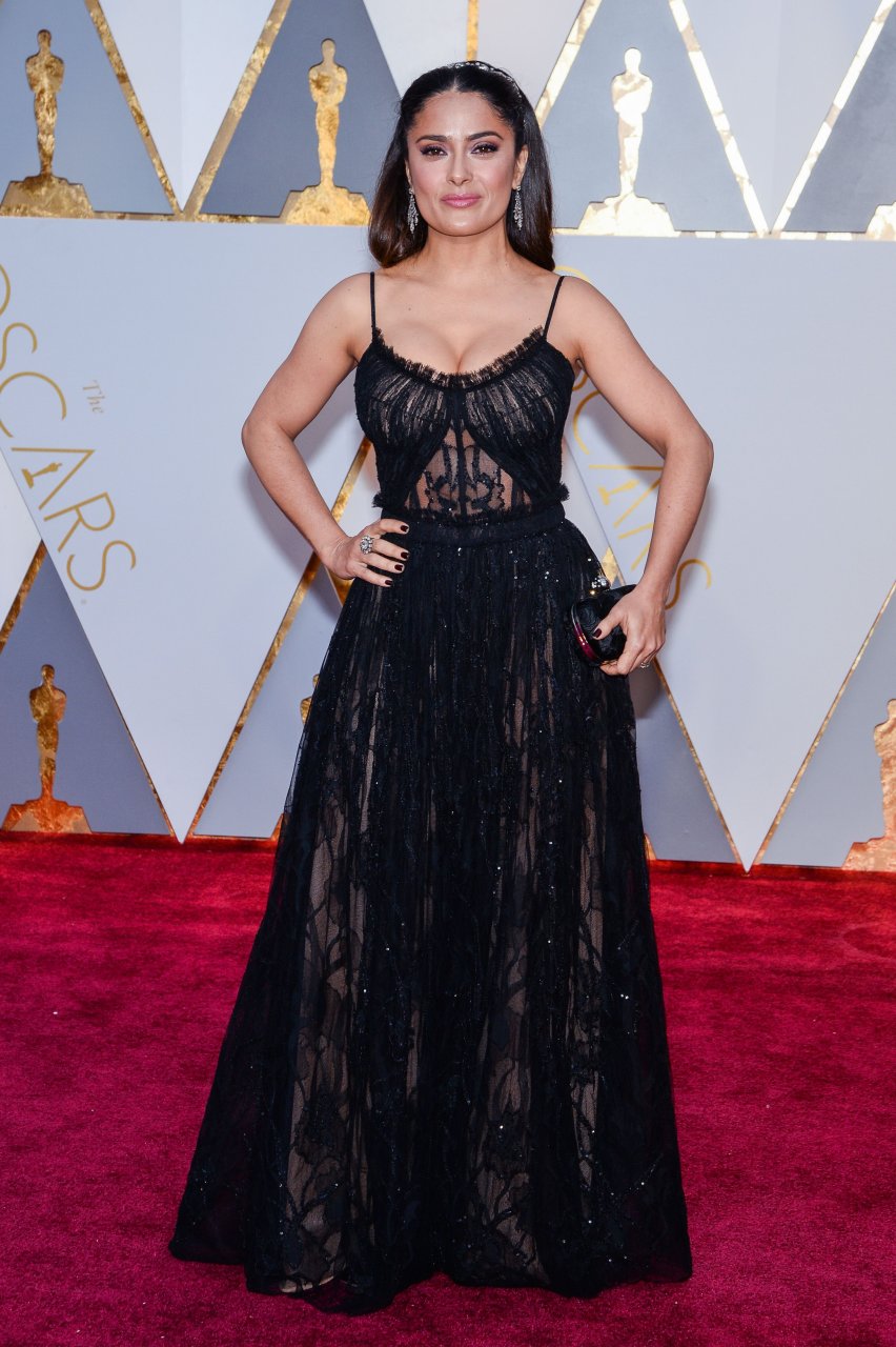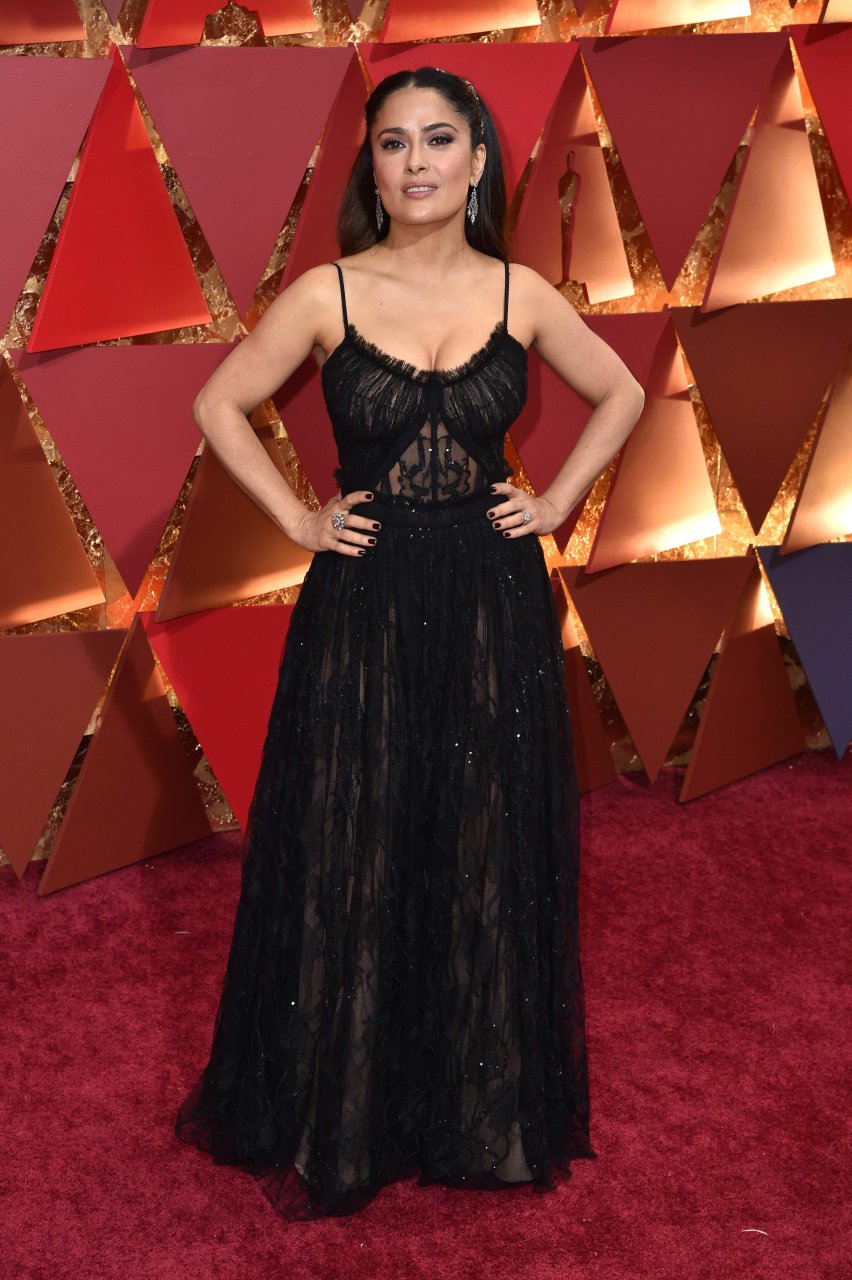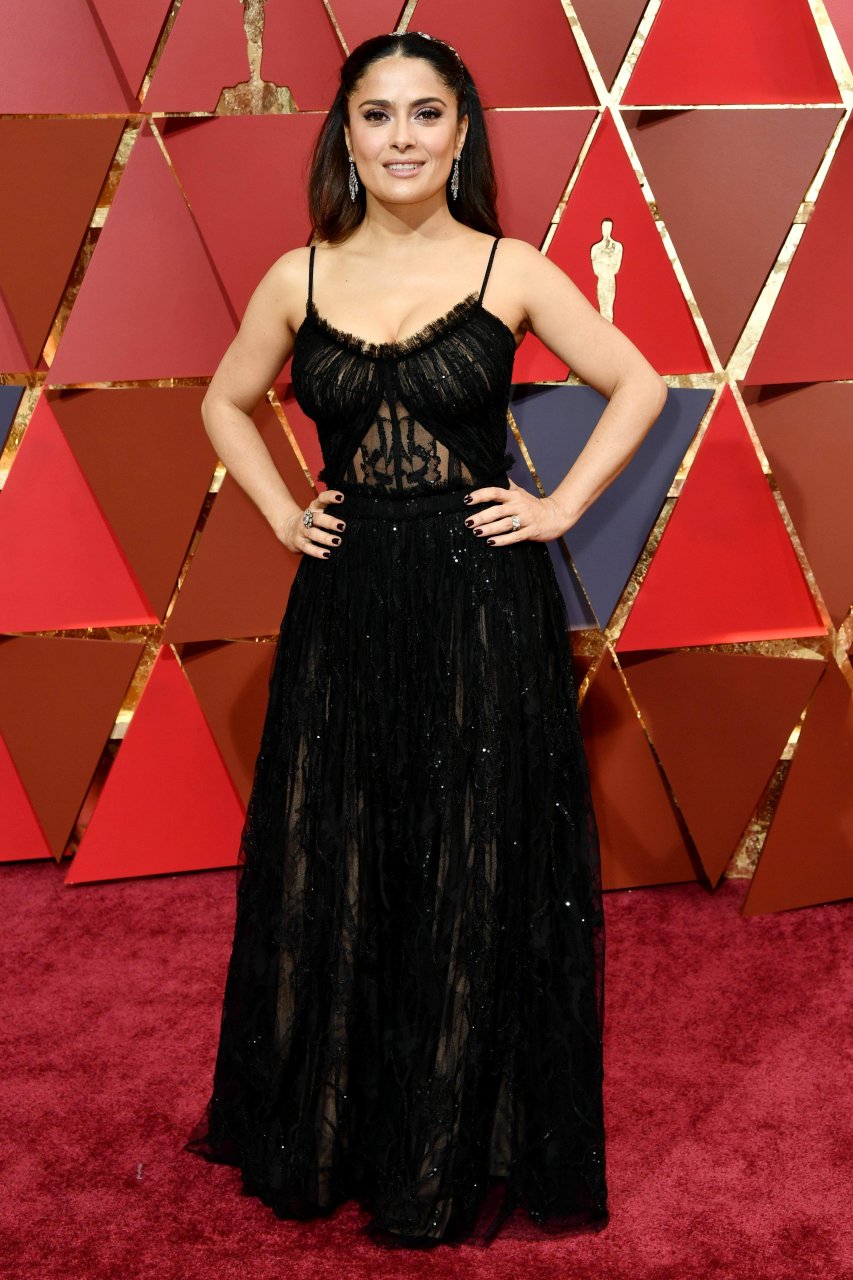 Salma Hayek usa um vestido preto sexy transparente no 89º Oscar em Hollywood, 26/02/17. Salma Hayek Pinault é uma atriz mexicano-americana (Frida (2002)), diretora e produtora. Idade: 50 (nascida em 2 de setembro de 1966).