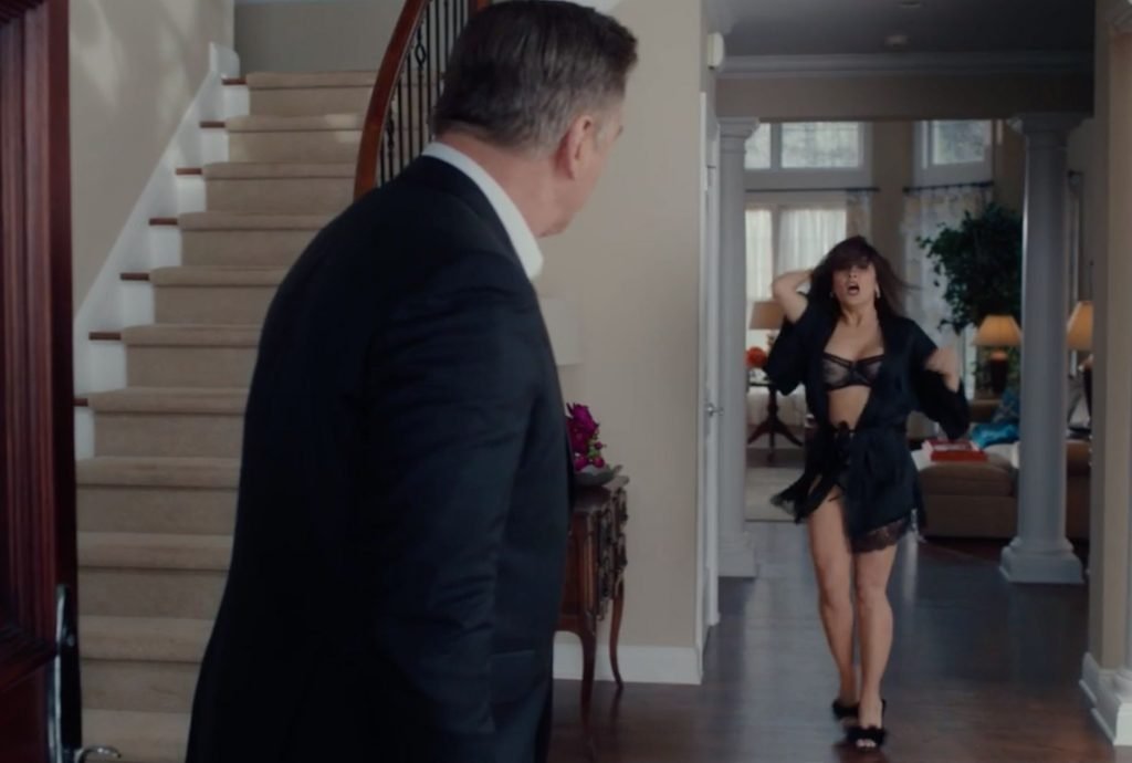 Salma Hayek leva um susto ao ser pega usando lingerie sexy em uma nova comédia cinematográfica. A atriz é vista de salto alto e roupa íntima ao ser surpreendida pelo co-estrela Alec Baldwin em “Drunk Parents.”