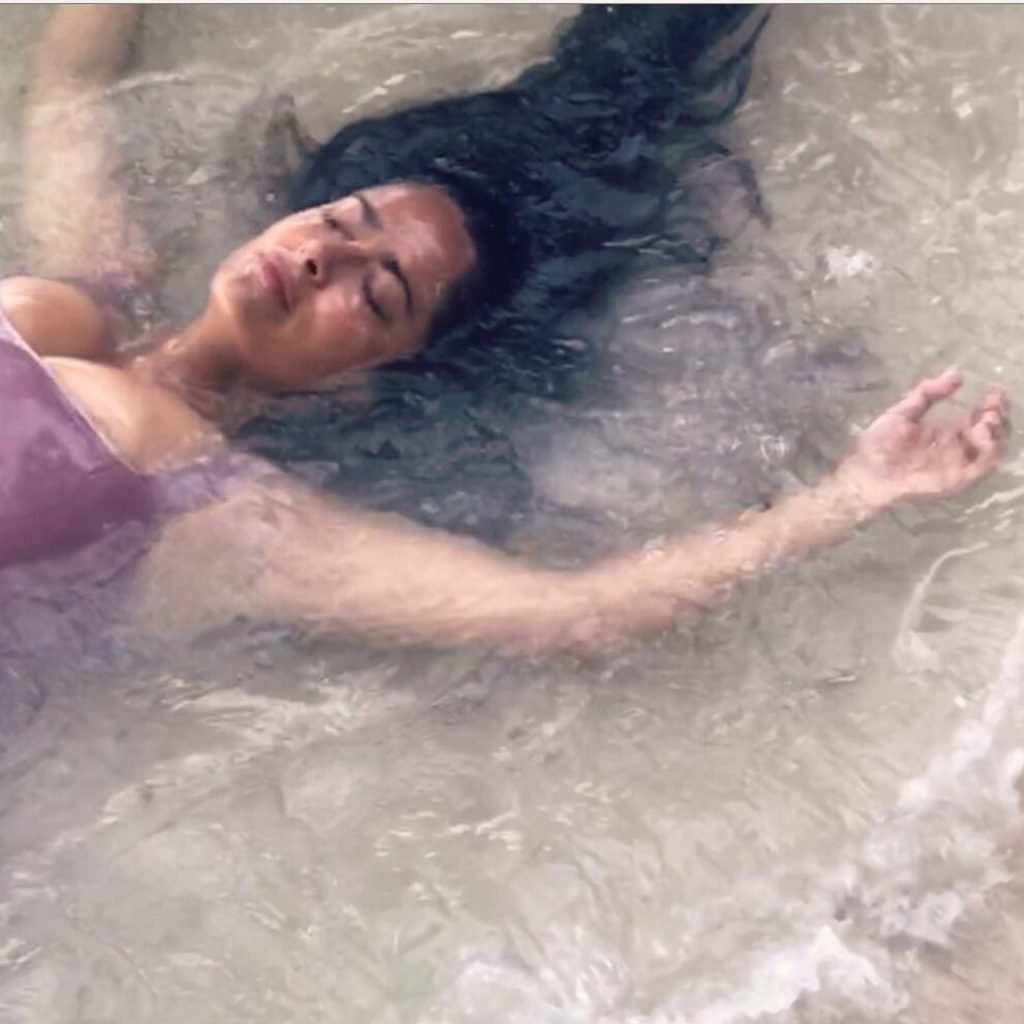Salma Hayek exibe um visual voluptuoso enquanto quase se afoga debaixo d’água – Instagram, 20/08/2019. A atriz mexicano-americana, de 52 anos, compartilhou várias imagens dela deitada na espuma do mar enquanto as ondas a envolvem, vestindo um maiô roxo.