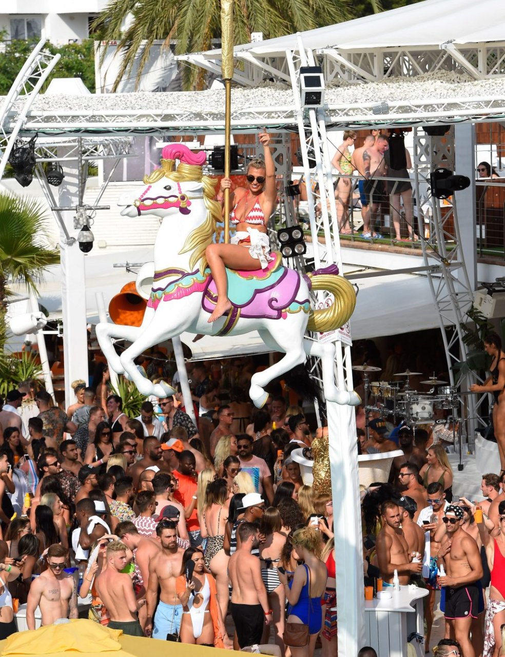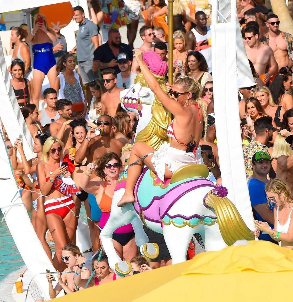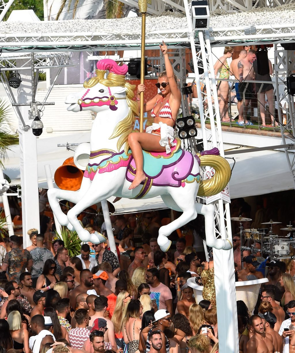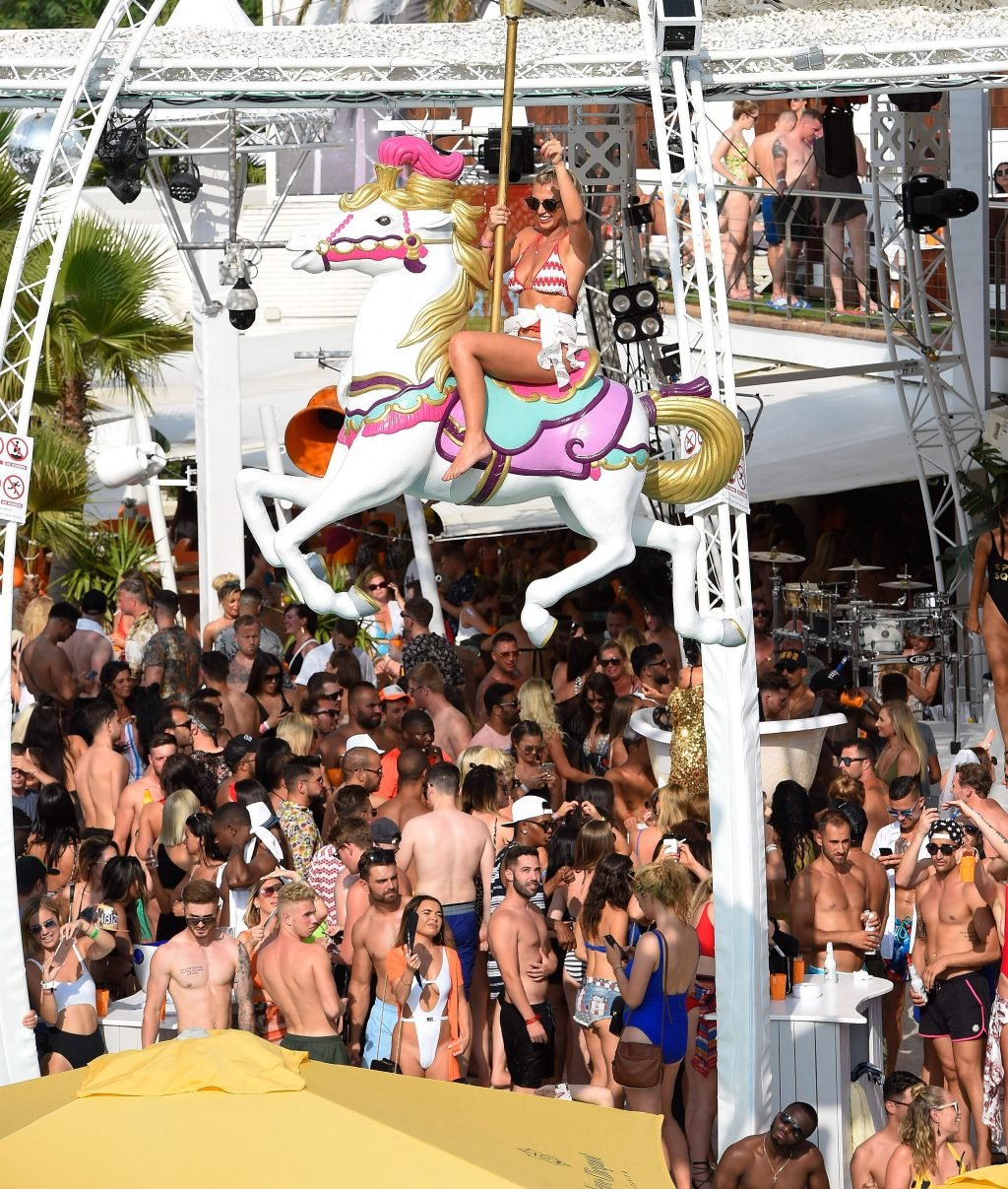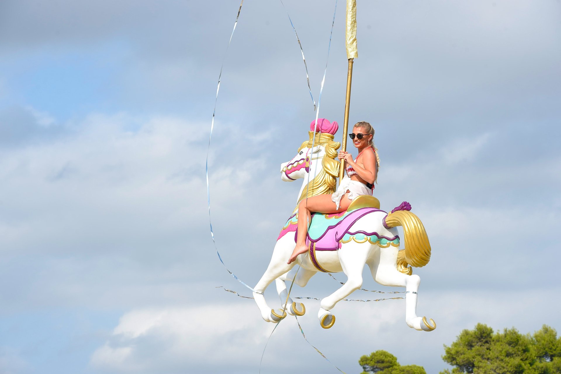 Billie Faiers impressiona a multidão do Ocean Beach em Ibiza ao ser baixada para a pista de dança por um guindaste com um cavalo branco. Ela foi acompanhada pelas colegas estrelas de TOWIE, a irmã Sam e Ferne McCann, 26/08/2018.