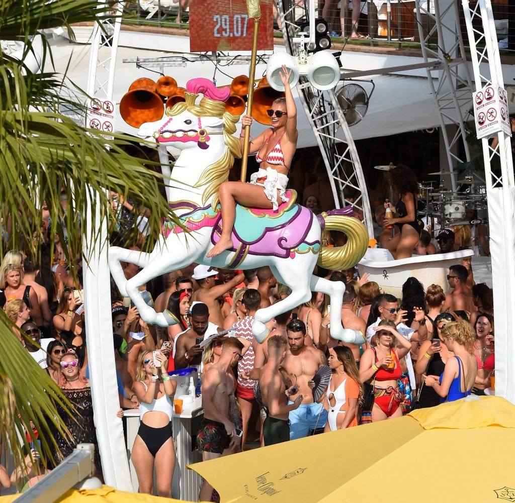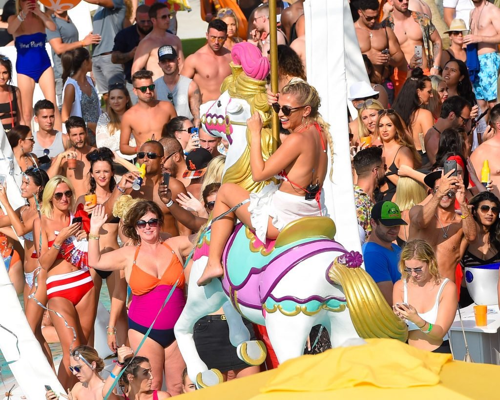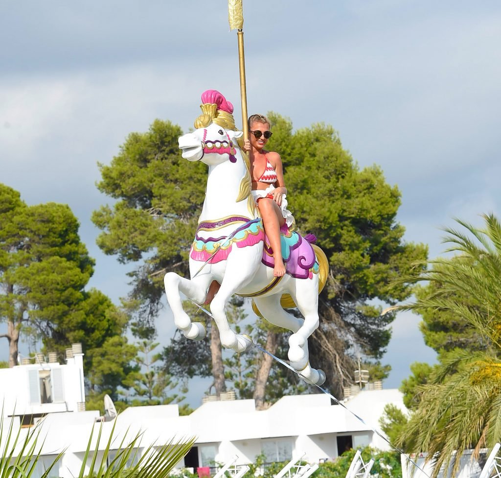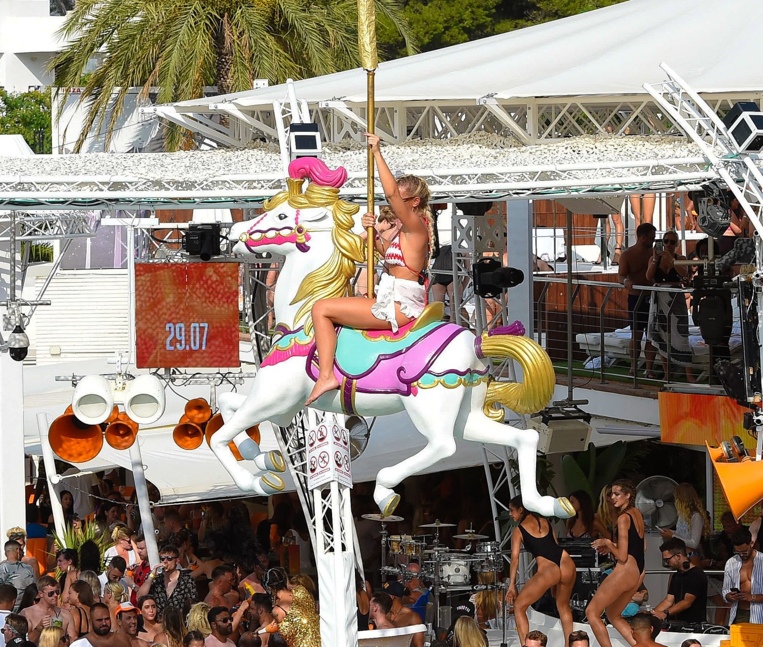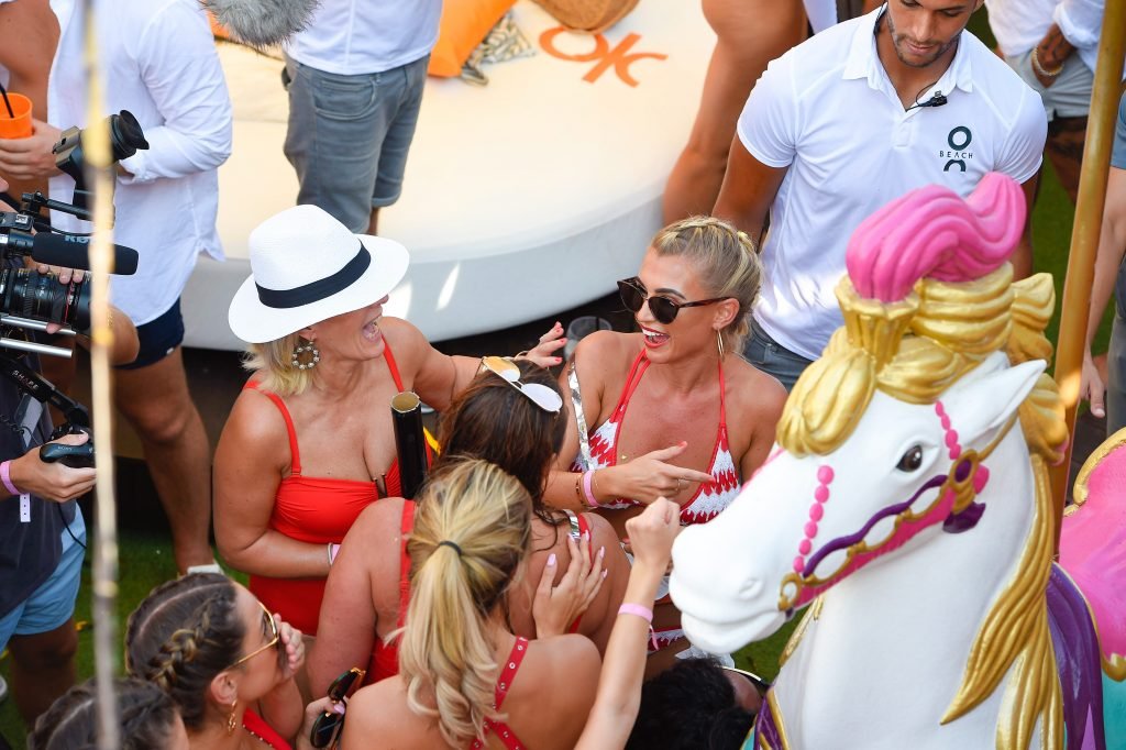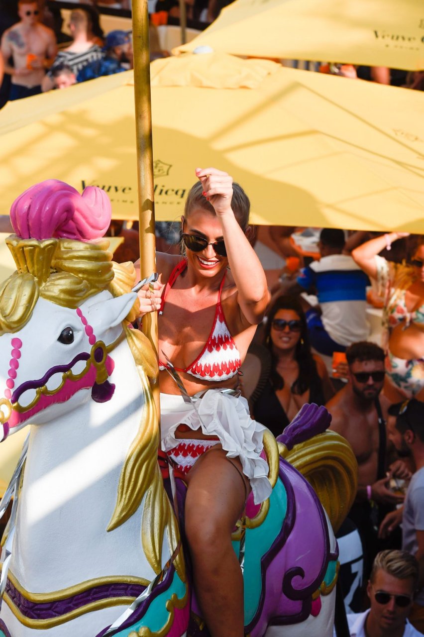 Billie Faiers impressiona a multidão do Ocean Beach em Ibiza ao ser baixada para a pista de dança por um guindaste com um cavalo branco. Ela foi acompanhada pelas colegas estrelas de TOWIE, a irmã Sam e Ferne McCann, 26/08/2018.