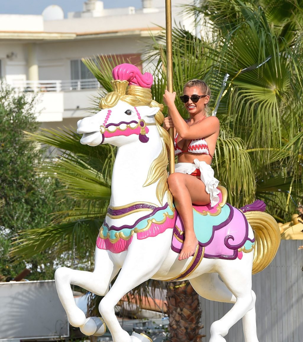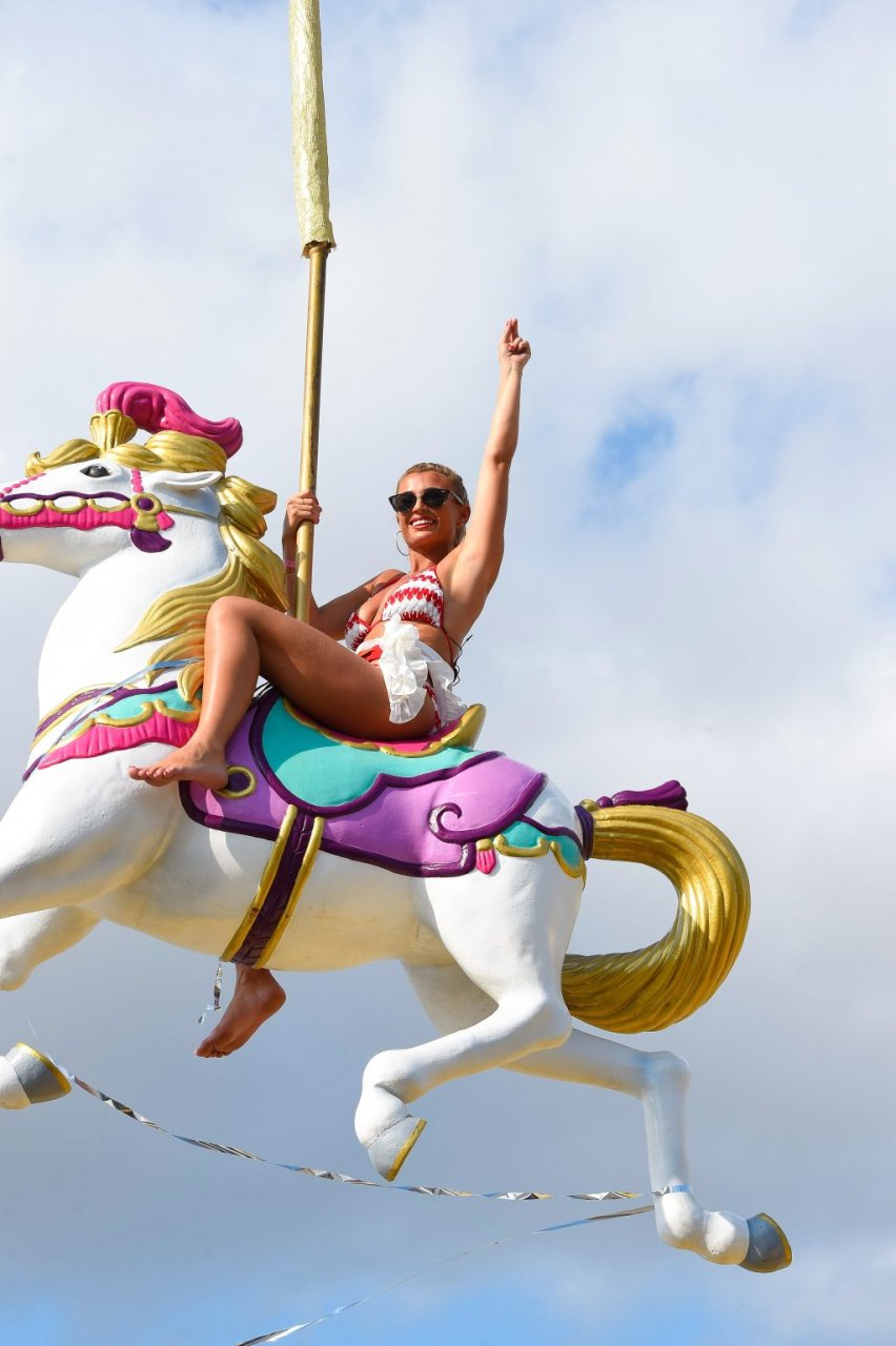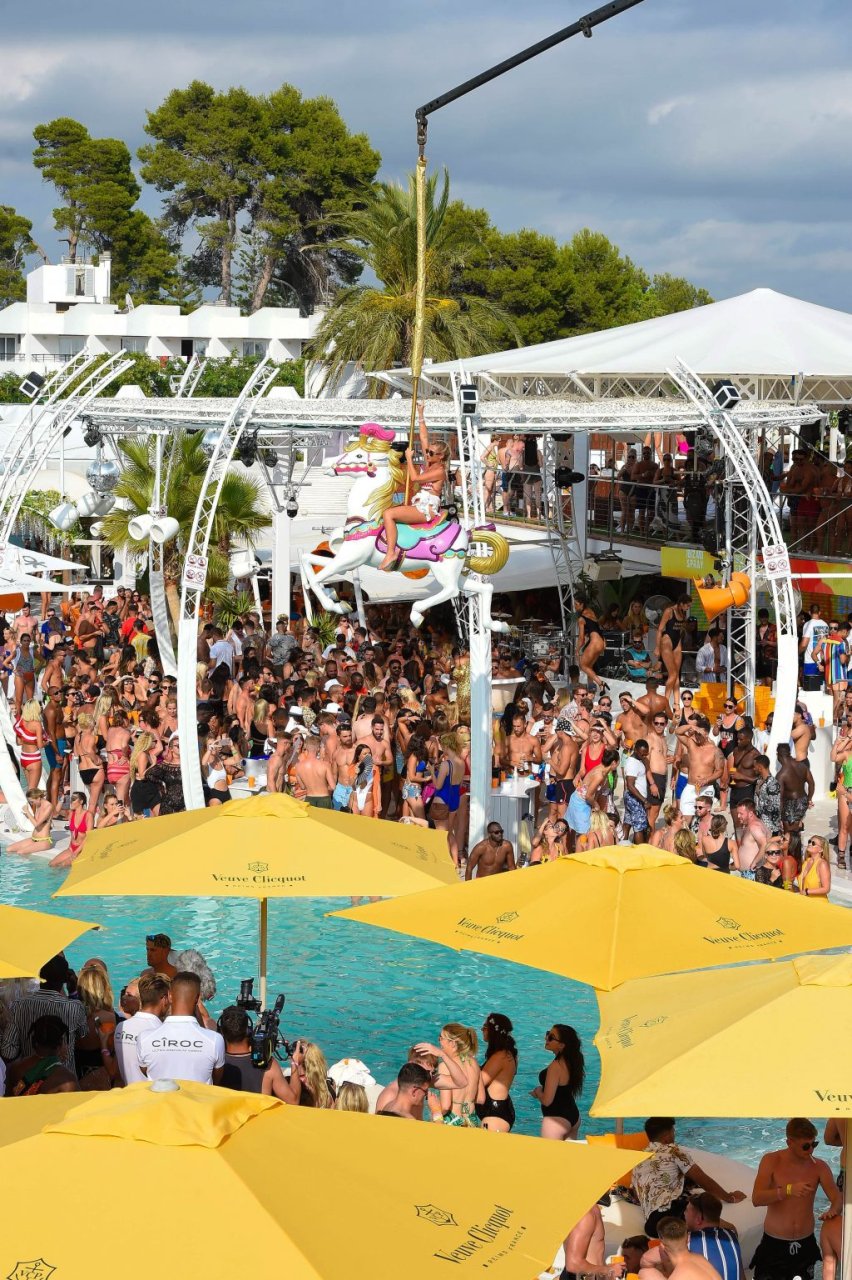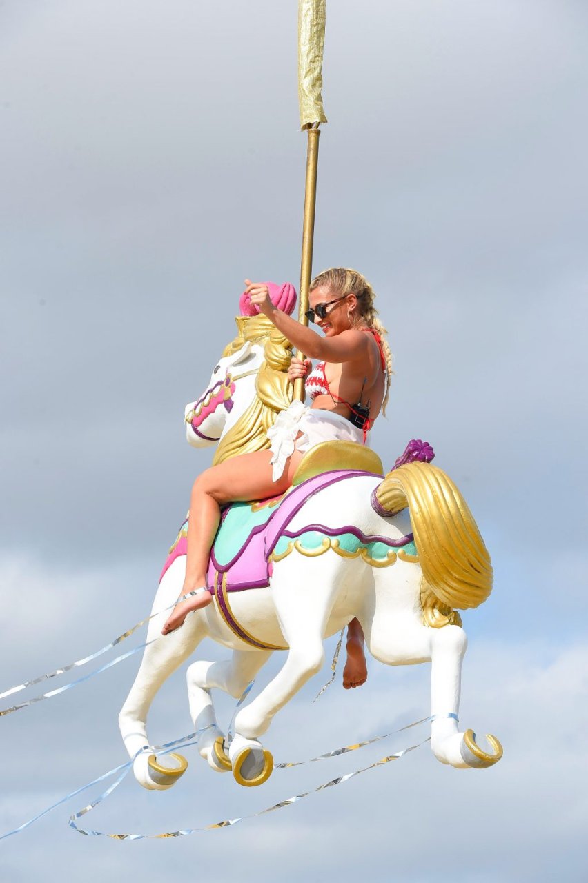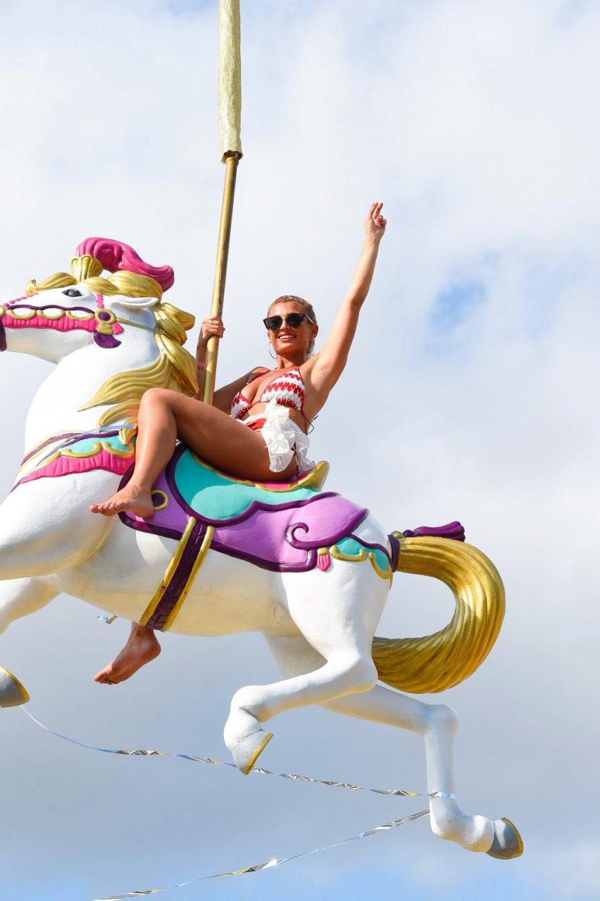 Billie Faiers impressiona a multidão do Ocean Beach em Ibiza ao ser baixada para a pista de dança por um guindaste com um cavalo branco. Ela foi acompanhada pelas colegas estrelas de TOWIE, a irmã Sam e Ferne McCann, 26/08/2018.