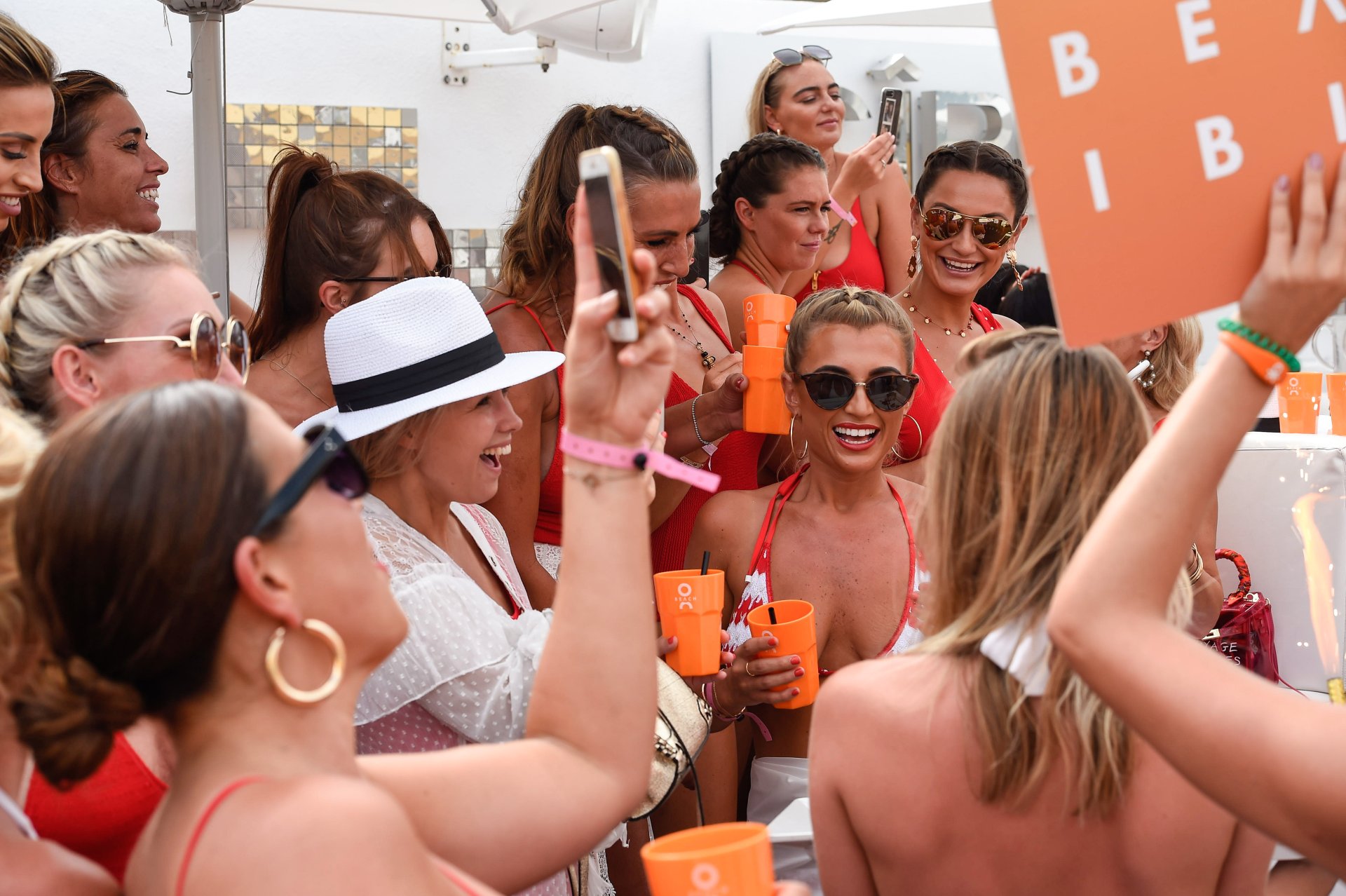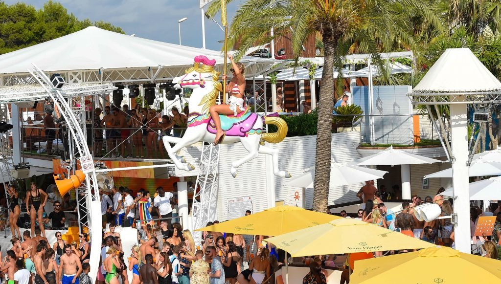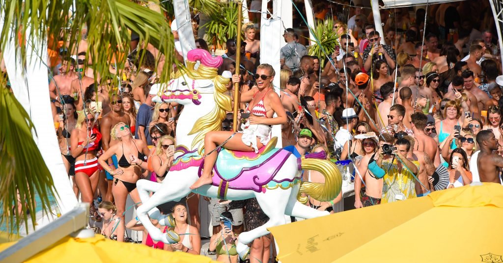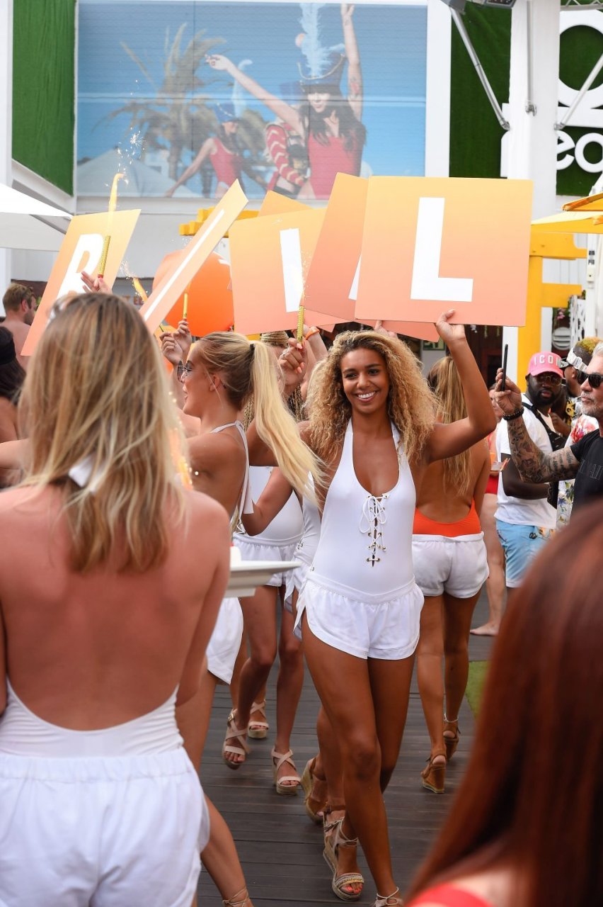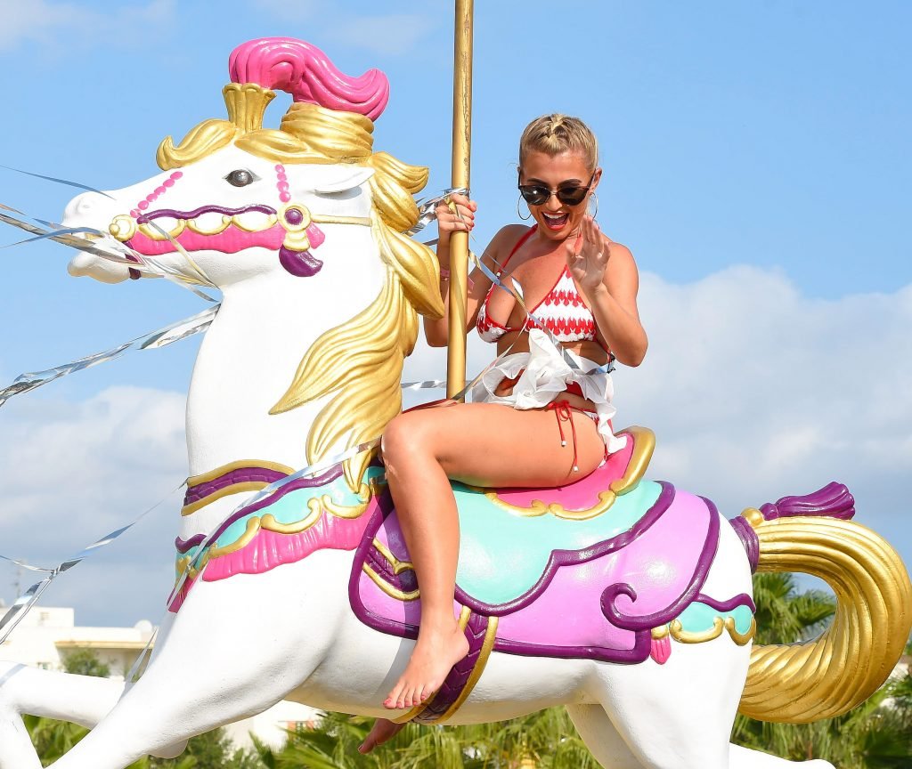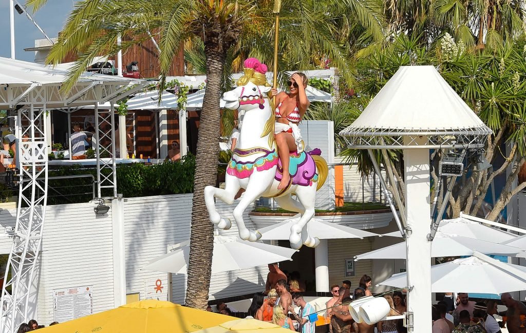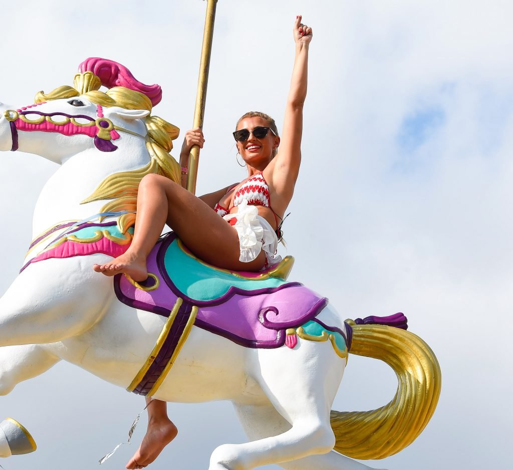 Billie Faiers impressiona a multidão do Ocean Beach em Ibiza ao ser baixada para a pista de dança por um guindaste com um cavalo branco. Ela foi acompanhada pelas colegas estrelas de TOWIE, a irmã Sam e Ferne McCann, 26/08/2018.