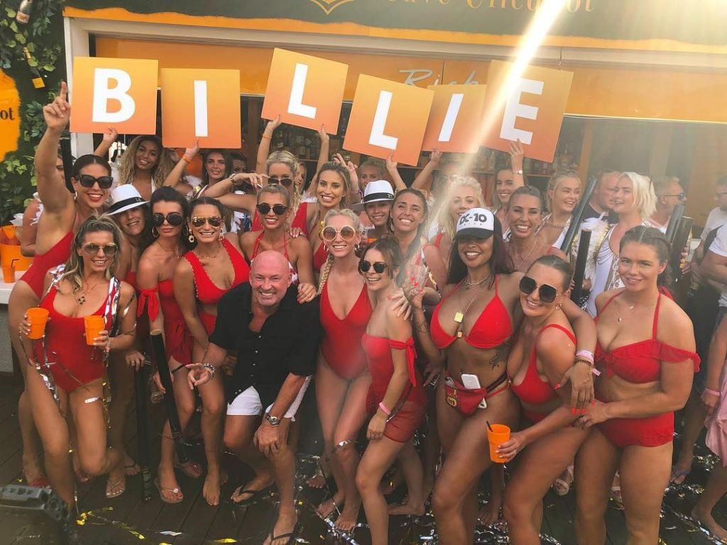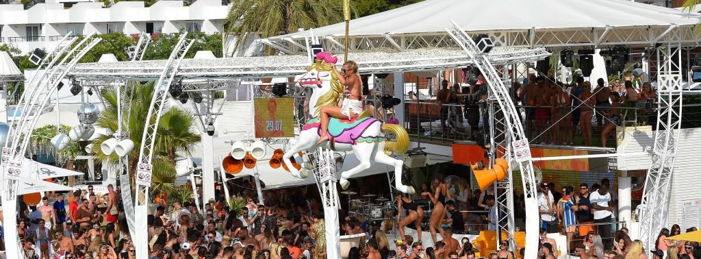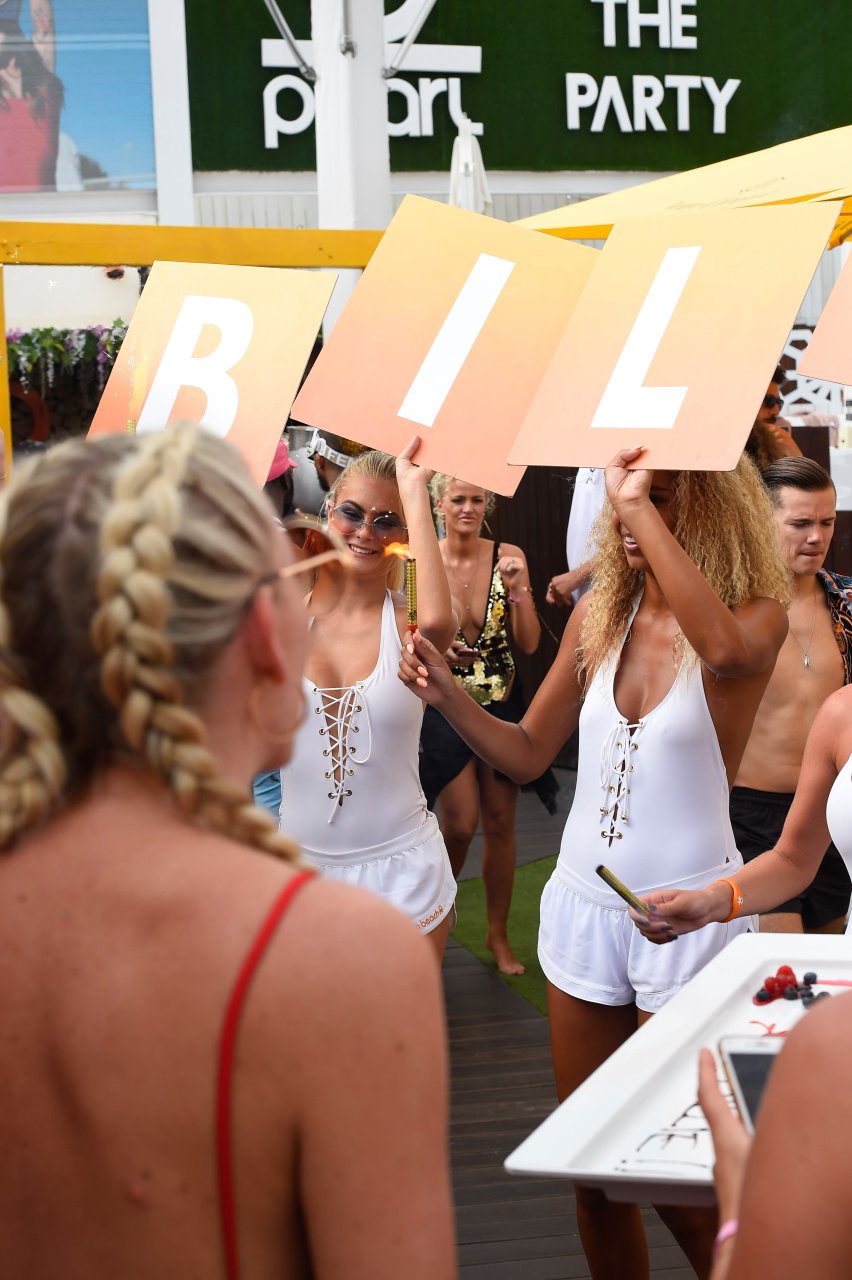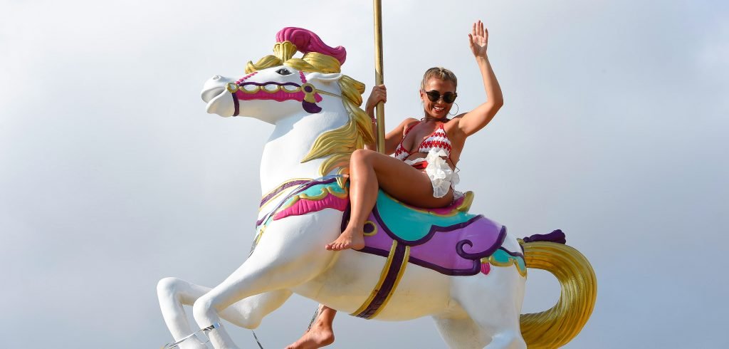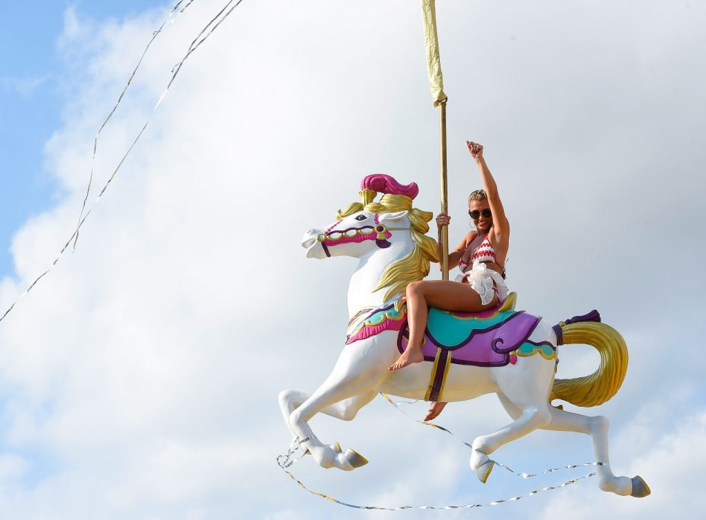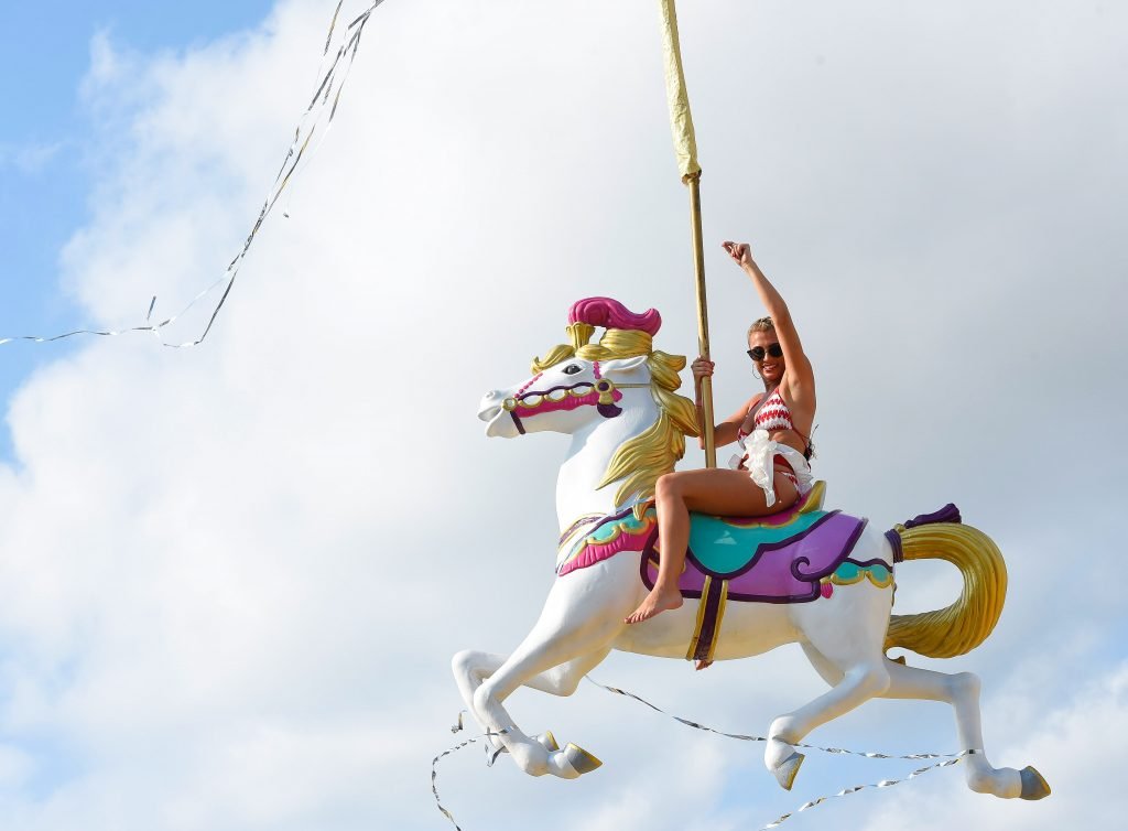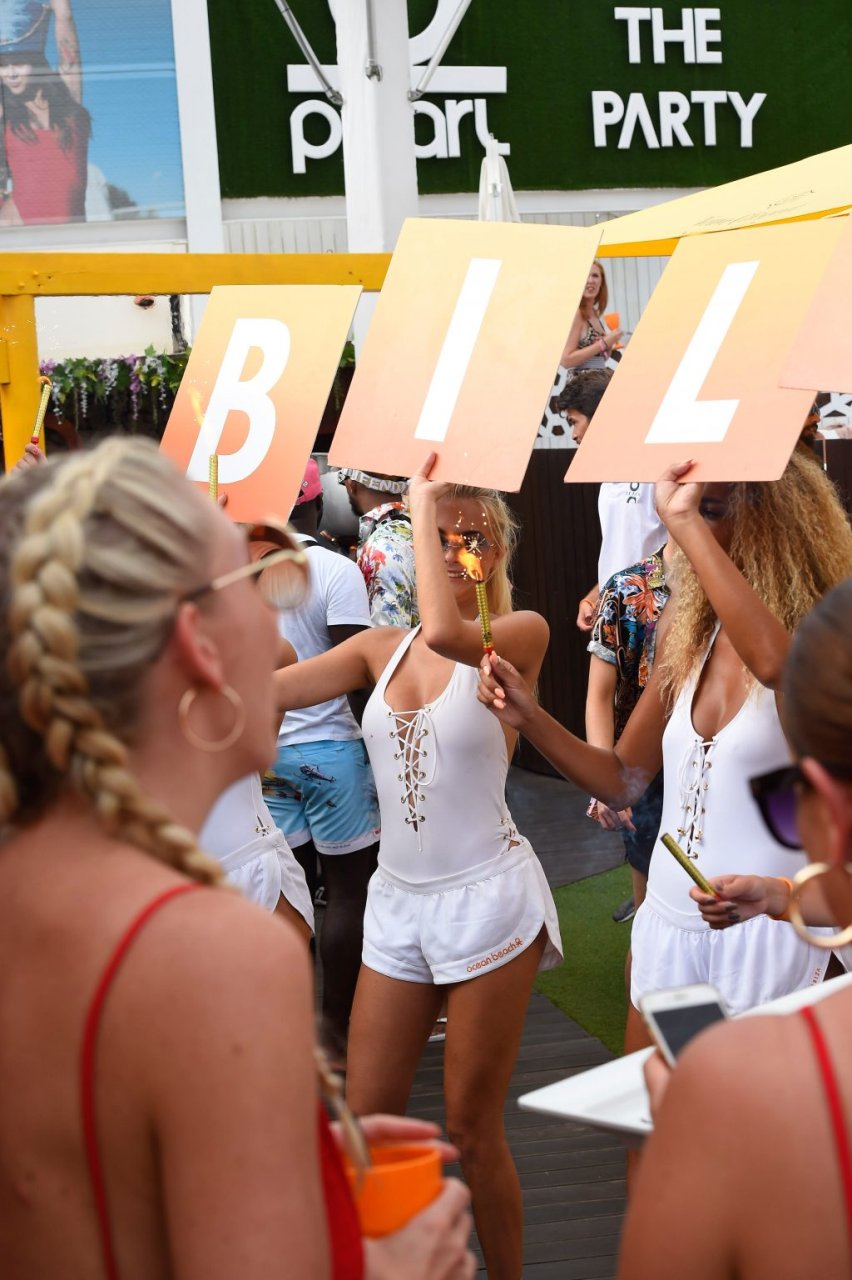 Billie Faiers impressiona a multidão do Ocean Beach em Ibiza ao ser baixada para a pista de dança por um guindaste com um cavalo branco. Ela foi acompanhada pelas colegas estrelas de TOWIE, a irmã Sam e Ferne McCann, 26/08/2018.