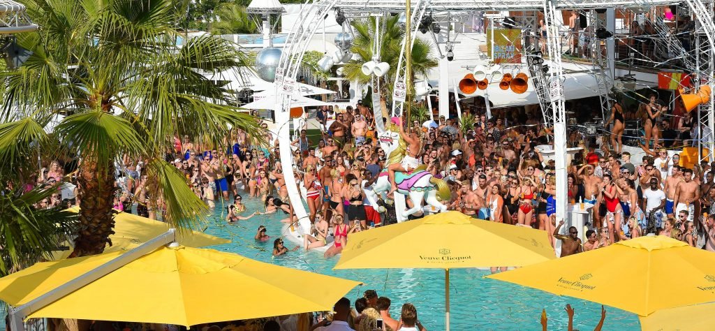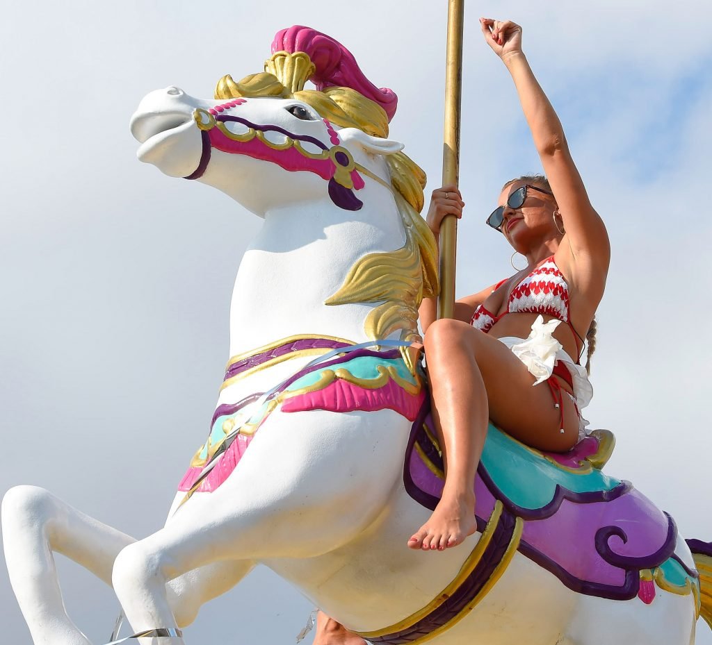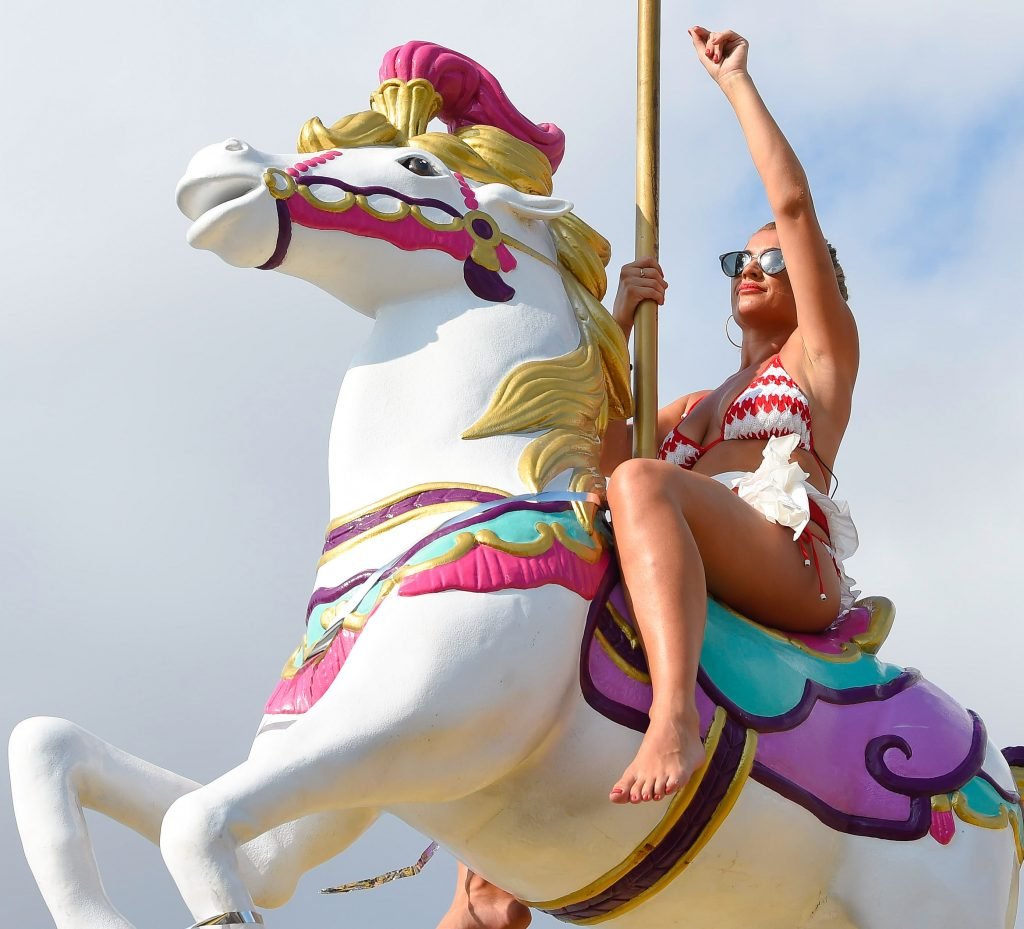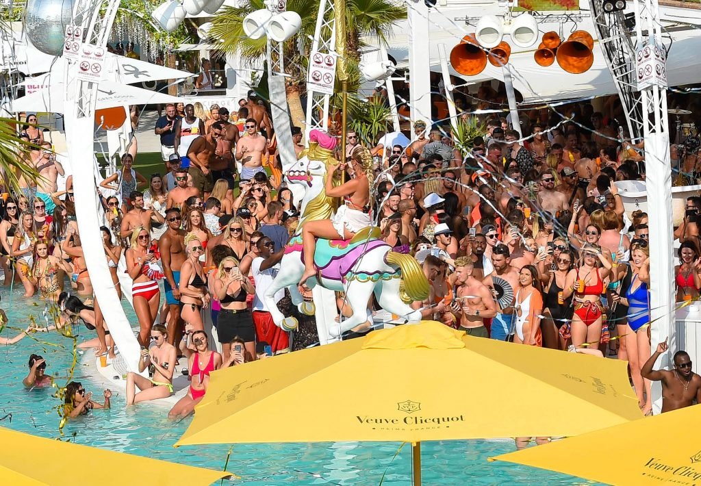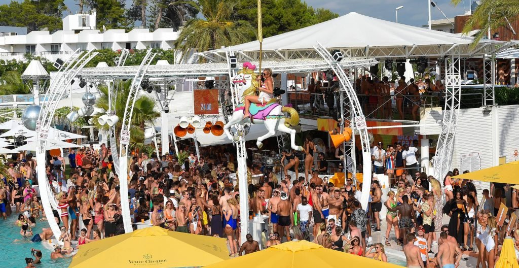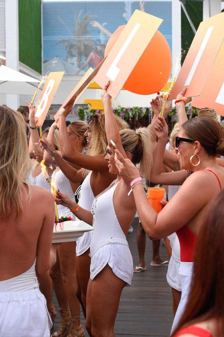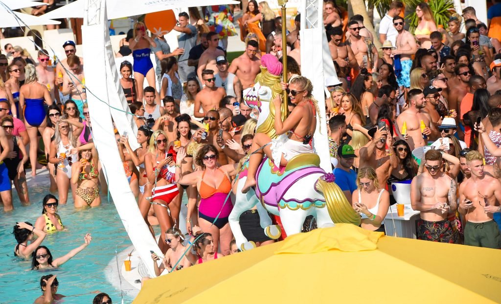 Billie Faiers impressiona a multidão do Ocean Beach em Ibiza ao ser baixada para a pista de dança por um guindaste com um cavalo branco. Ela foi acompanhada pelas colegas estrelas de TOWIE, a irmã Sam e Ferne McCann, 26/08/2018.