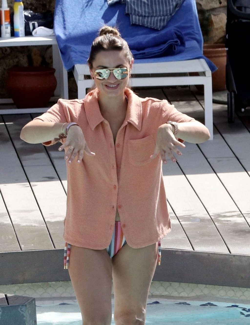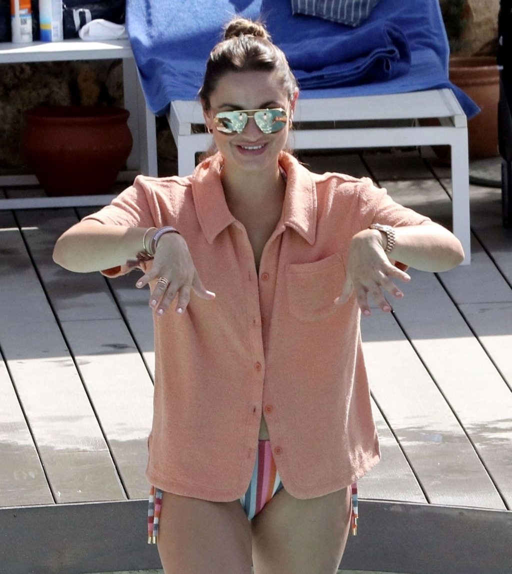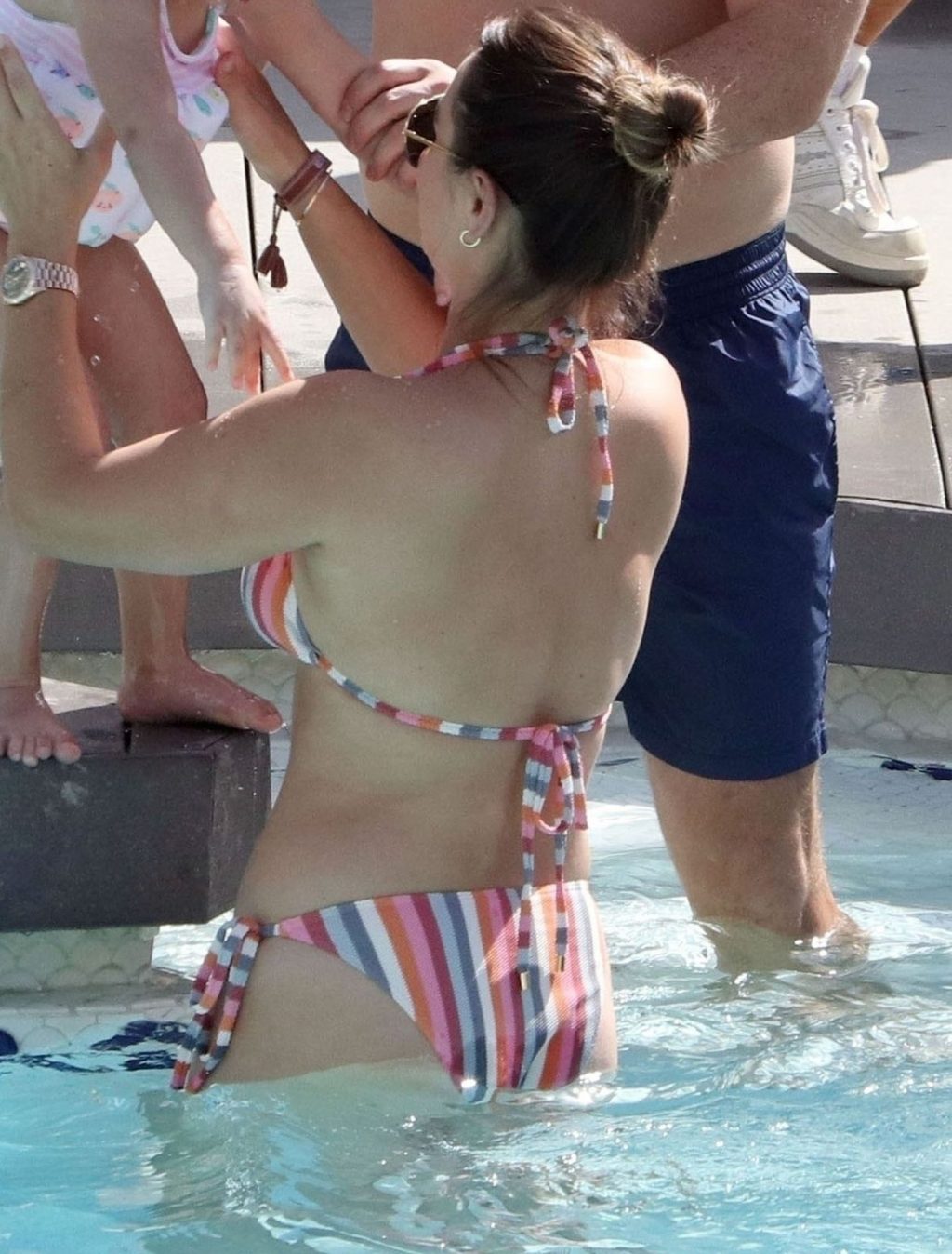 Sam usou um biquíni listrado sexy enquanto o marido Paul ficou sem camisa se divertindo em sua escapada espanhola, fazendo splash na piscina e aproveitando um tempo em família.