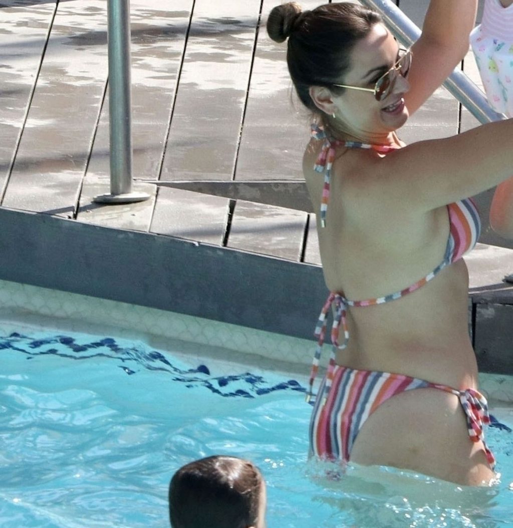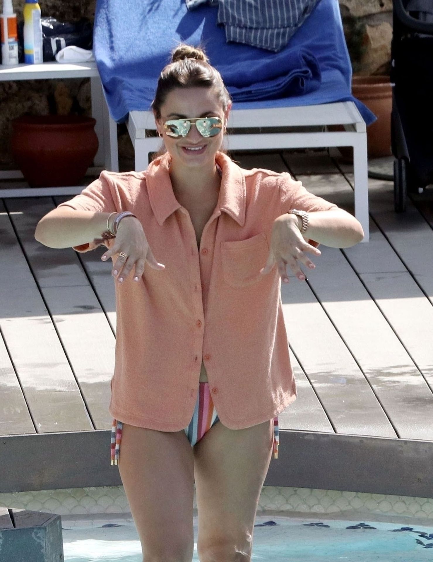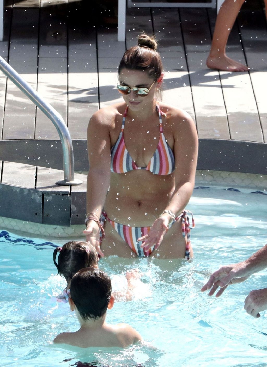 Sam usou um biquíni listrado sexy enquanto o marido Paul ficou sem camisa se divertindo em sua escapada espanhola, fazendo splash na piscina e aproveitando um tempo em família.