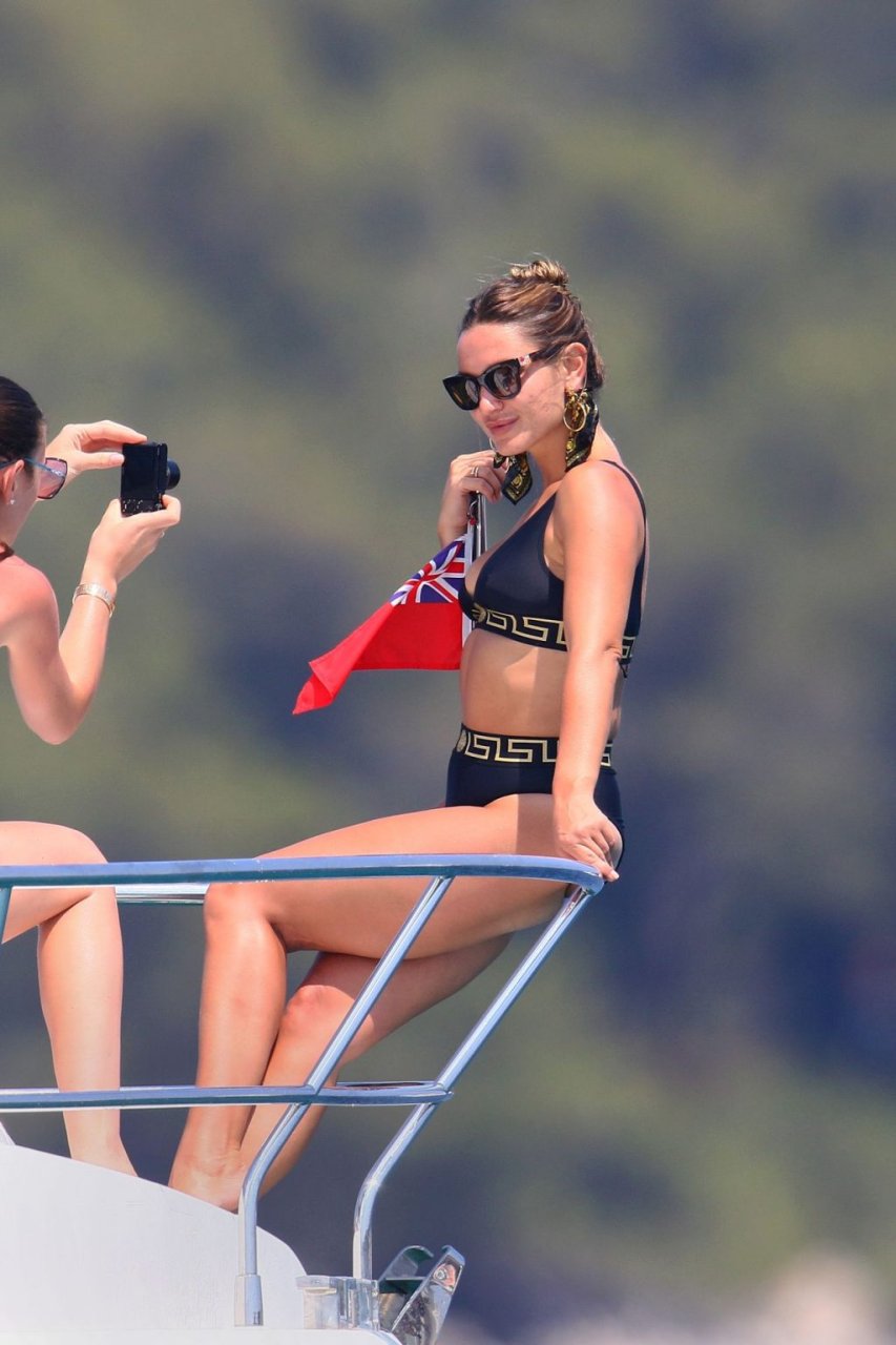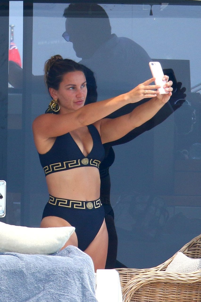 Sam Faiers parece sensacional exibindo seu físico tonificado em um biquíni preto Versace decotado durante uma luxuosa viagem de garotas em Cannes, 19/07/2019.