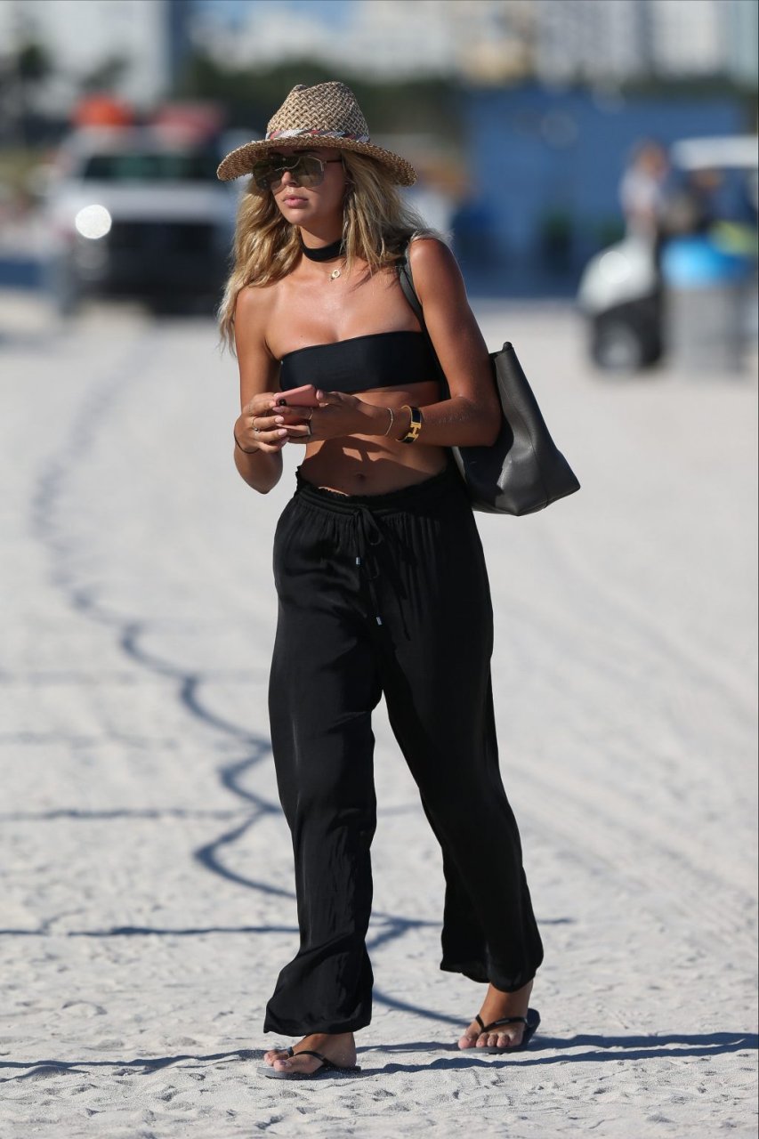 Recém-solteira, a modelo polonesa Sandra Kubicka exibe seus incríveis abdômenes em um top de biquíni tipo bandeau e calças largas enquanto passa um tempo na Miami Beach, 21/10/2018.
