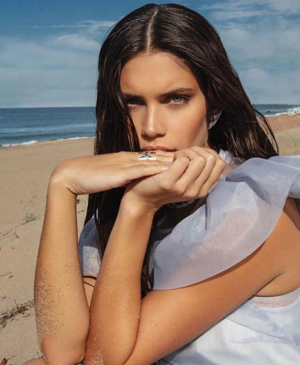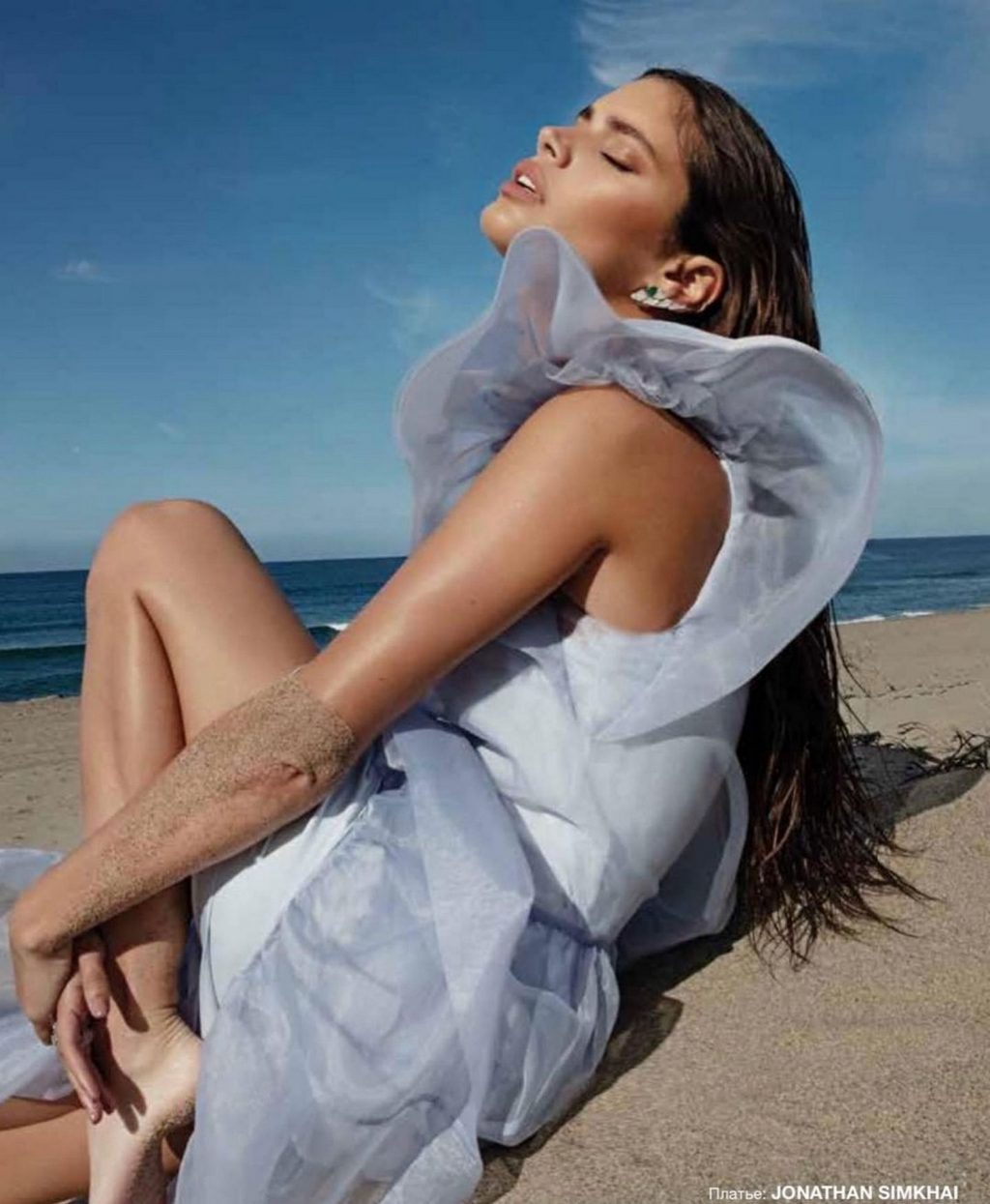 A modelo impressiona na praia como um dos elementos, mostrando seu corpo em um biquíni azul e belos vestidos.