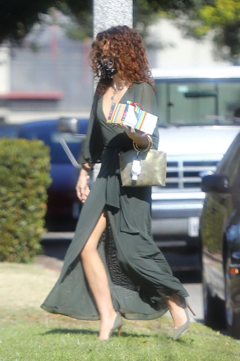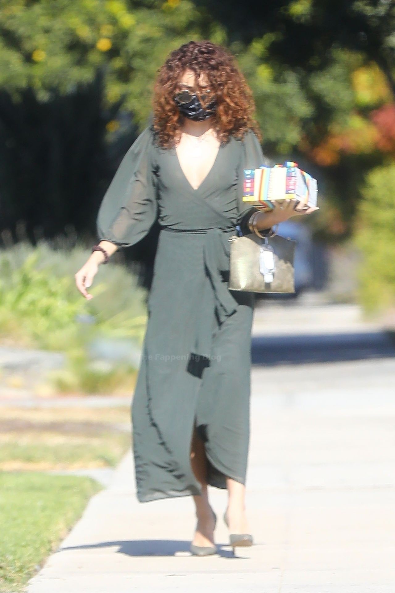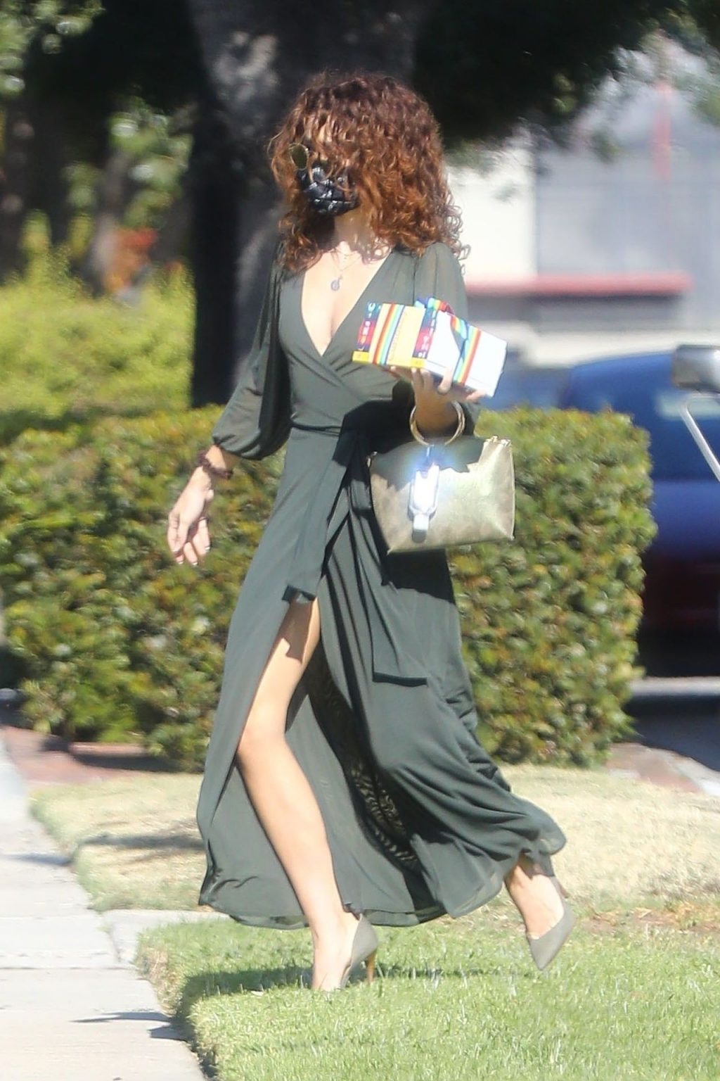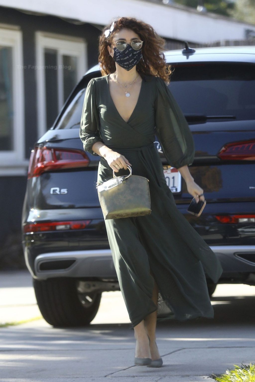 A ex-estrela de Modern Family estava elegante sem sutiã, usando um vestido envelope de cor oliva e sapatos de camurça. Sarah acessorizou com um boina de cabelo com borboleta e uma bolsa verde com alça dourada, com seu desinfetante para as mãos convenientemente preso a ela. A atriz se certificou de se manter segura usando uma máscara Vote da MASKC.