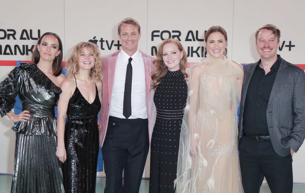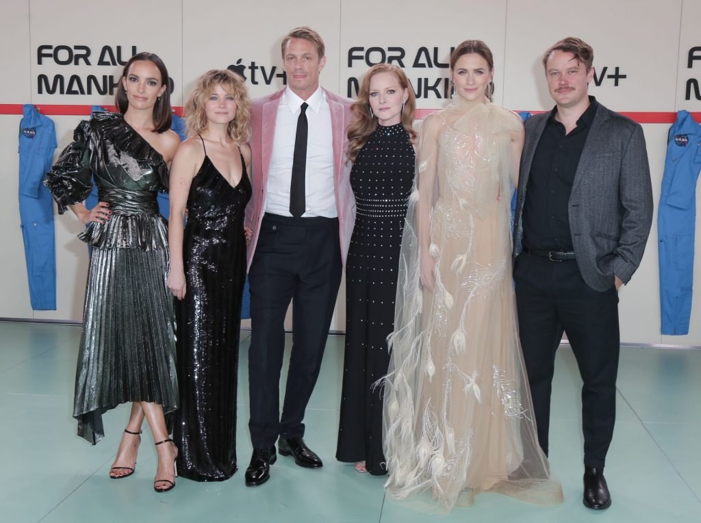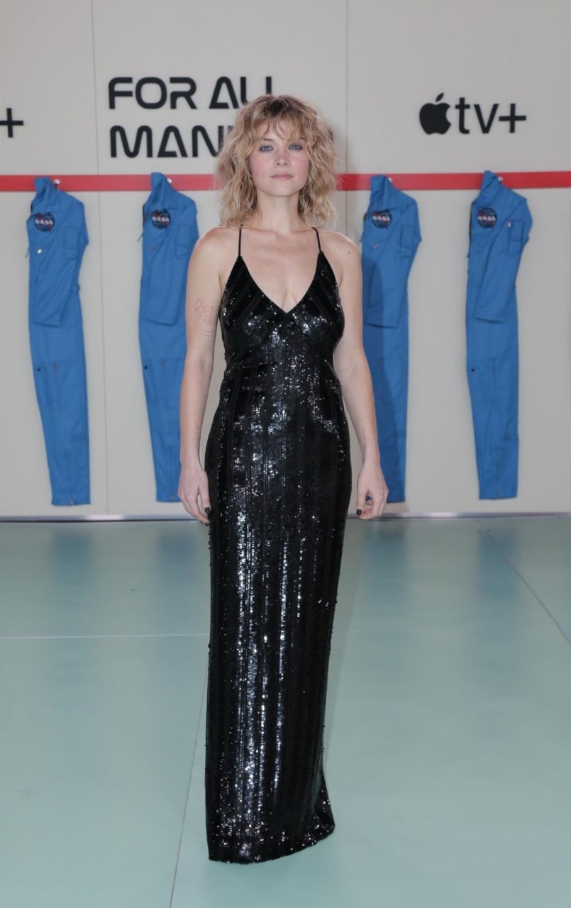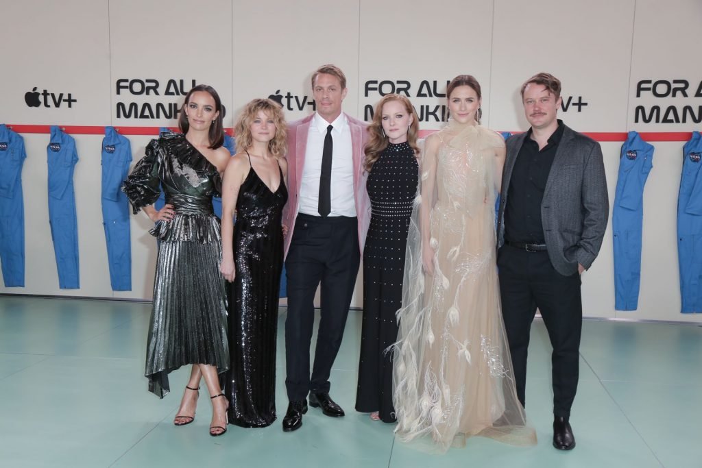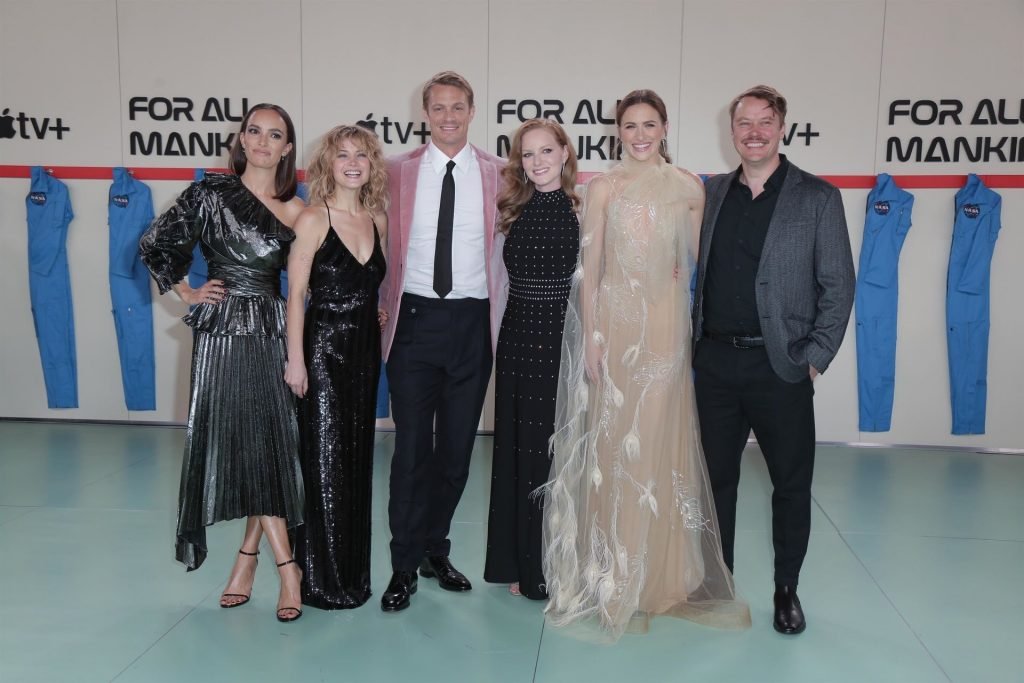 A atriz americana Sarah Jones foi vista sem sutiã junto com Jodi Balfour, Joel Kinnaman, Wrenn Schmidt, Shantel VanSanten, Michael Dorman e Krys Marshall na estreia mundial de “For All Mankind” da Apple TV+ no Regency Village Theatre em Westwood, 15/10/2019.