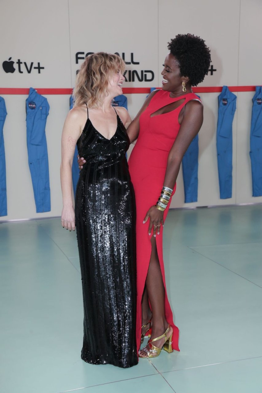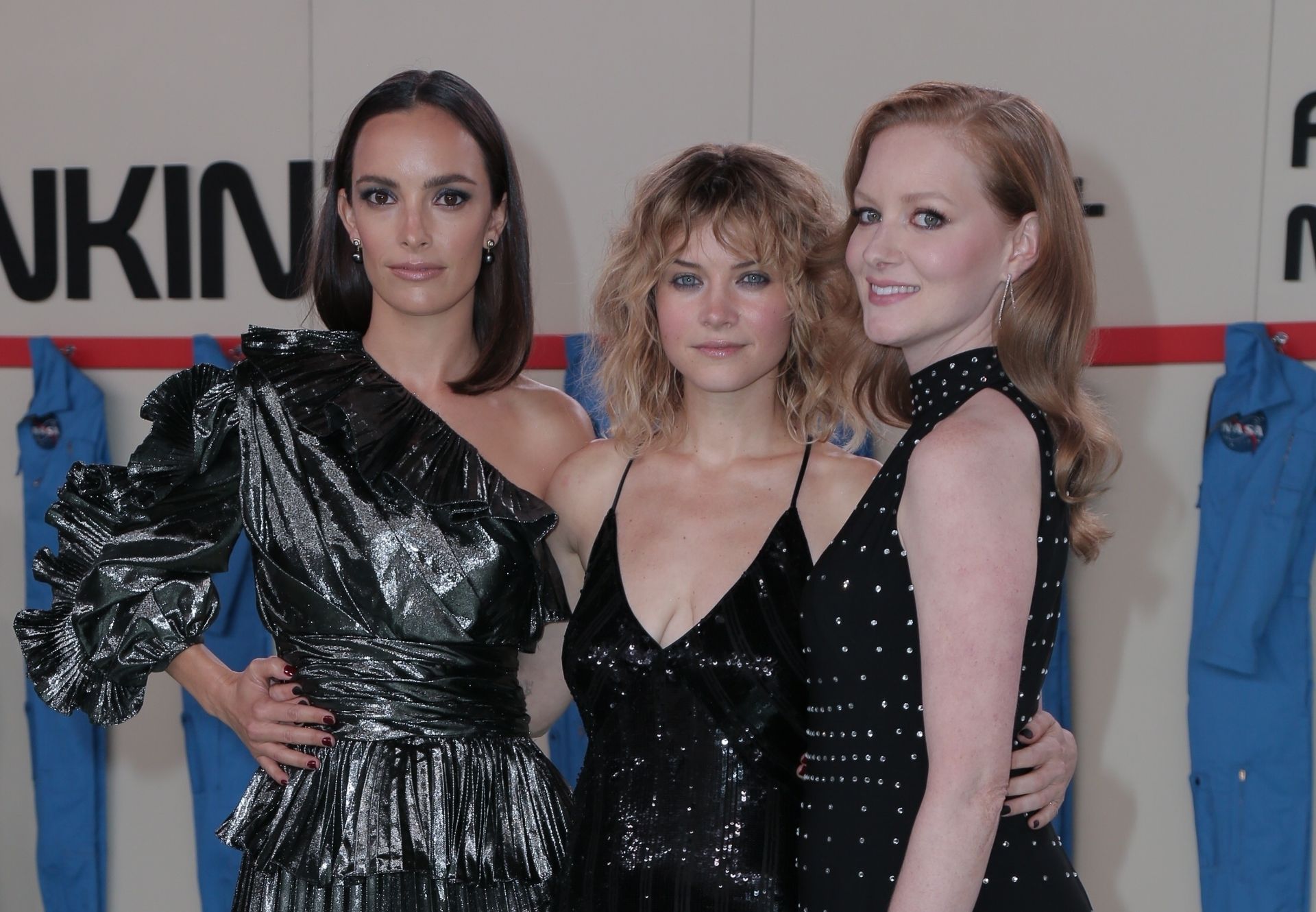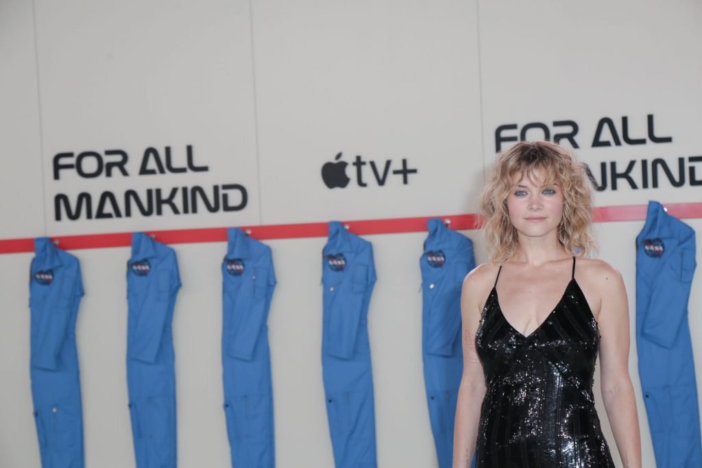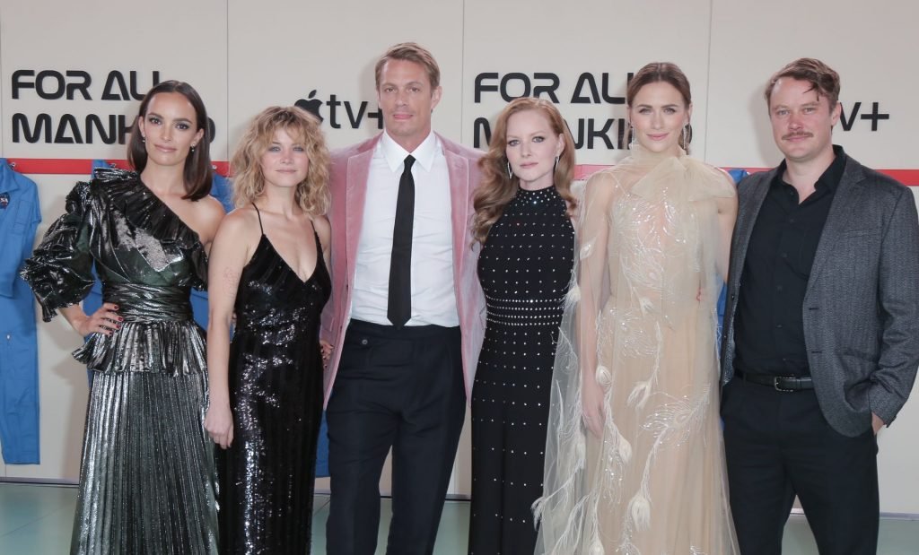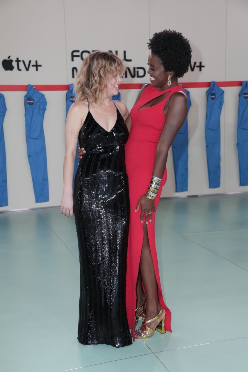 A atriz americana Sarah Jones foi vista sem sutiã junto com Jodi Balfour, Joel Kinnaman, Wrenn Schmidt, Shantel VanSanten, Michael Dorman e Krys Marshall na estreia mundial de “For All Mankind” da Apple TV+ no Regency Village Theatre em Westwood, 15/10/2019.