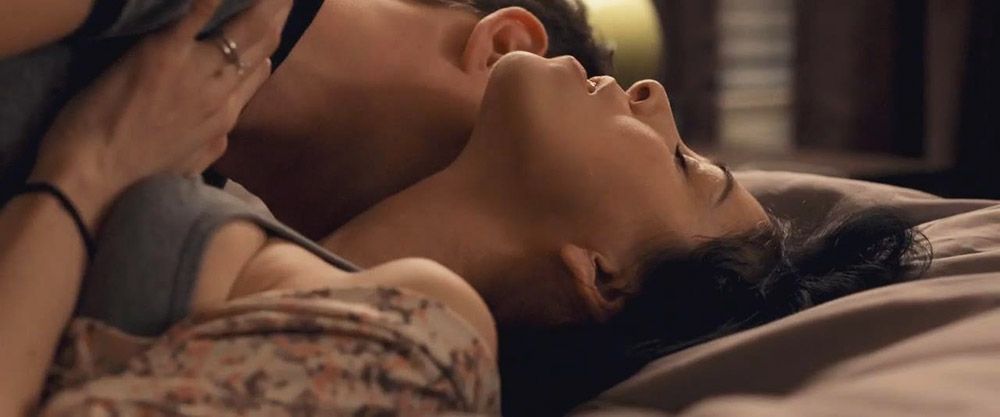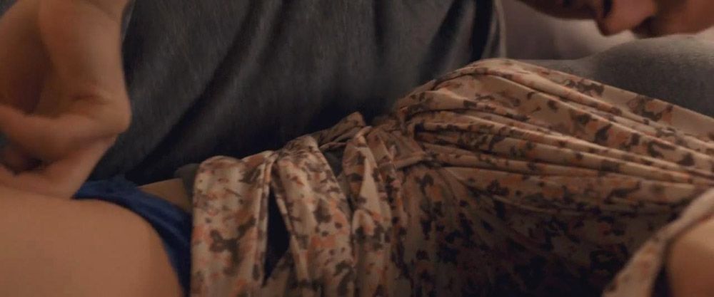 Sarah Silverman is lying on her back on a bed as a guy kisses her. Her robe is pulled open, and the guy is reaching down to pull down her panties. She and the guy then have sex for a bit before she distracts him by talking.