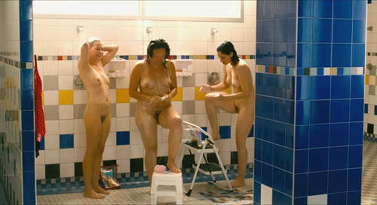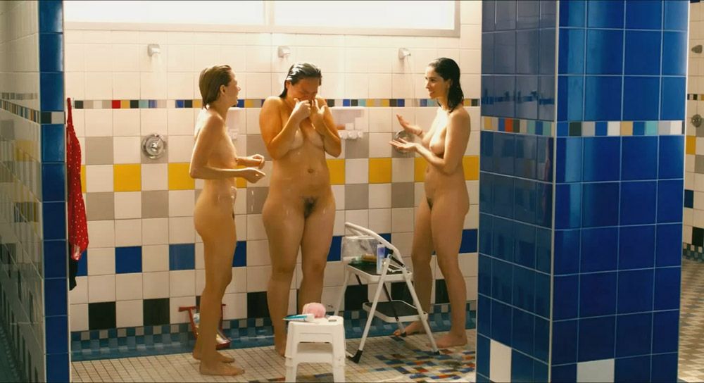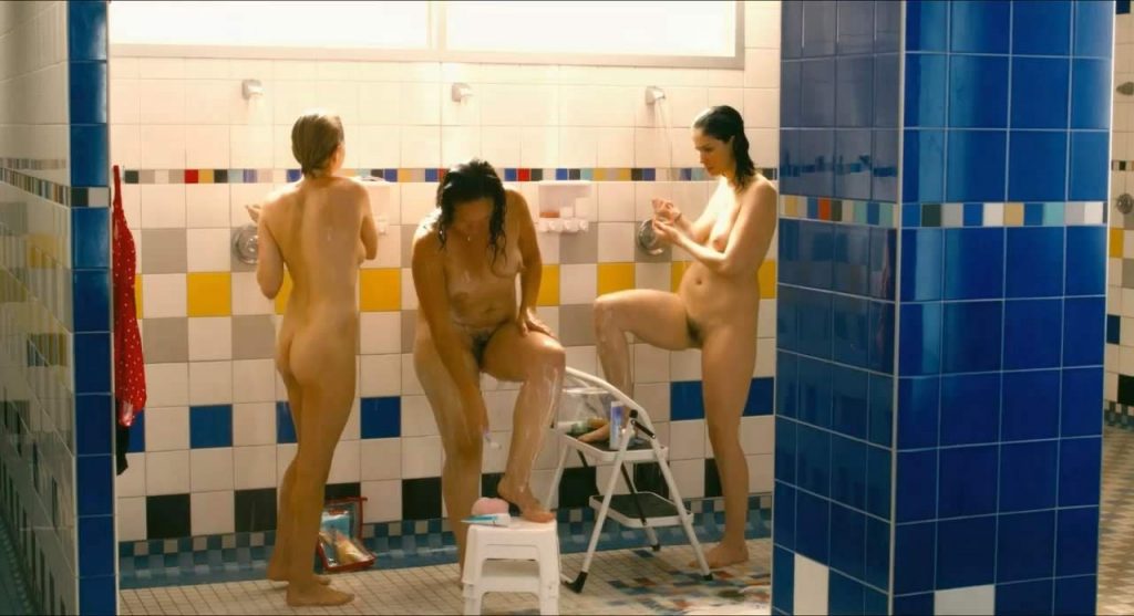 Sarah Silverman, Michelle Williams, and Jennifer Podemski are showing full-frontal nudity. They stand next to each other in a group shower, all three girls showing bush and boobs while talking. Sarah puts her leg up on a stool to wash it, as does Jennifer. Michelle turns around a few times to show her bare butt, as well. Meanwhile, many other fully nude women are seen in the shower. Sarah on the right, just in case you didn’t catch her!
