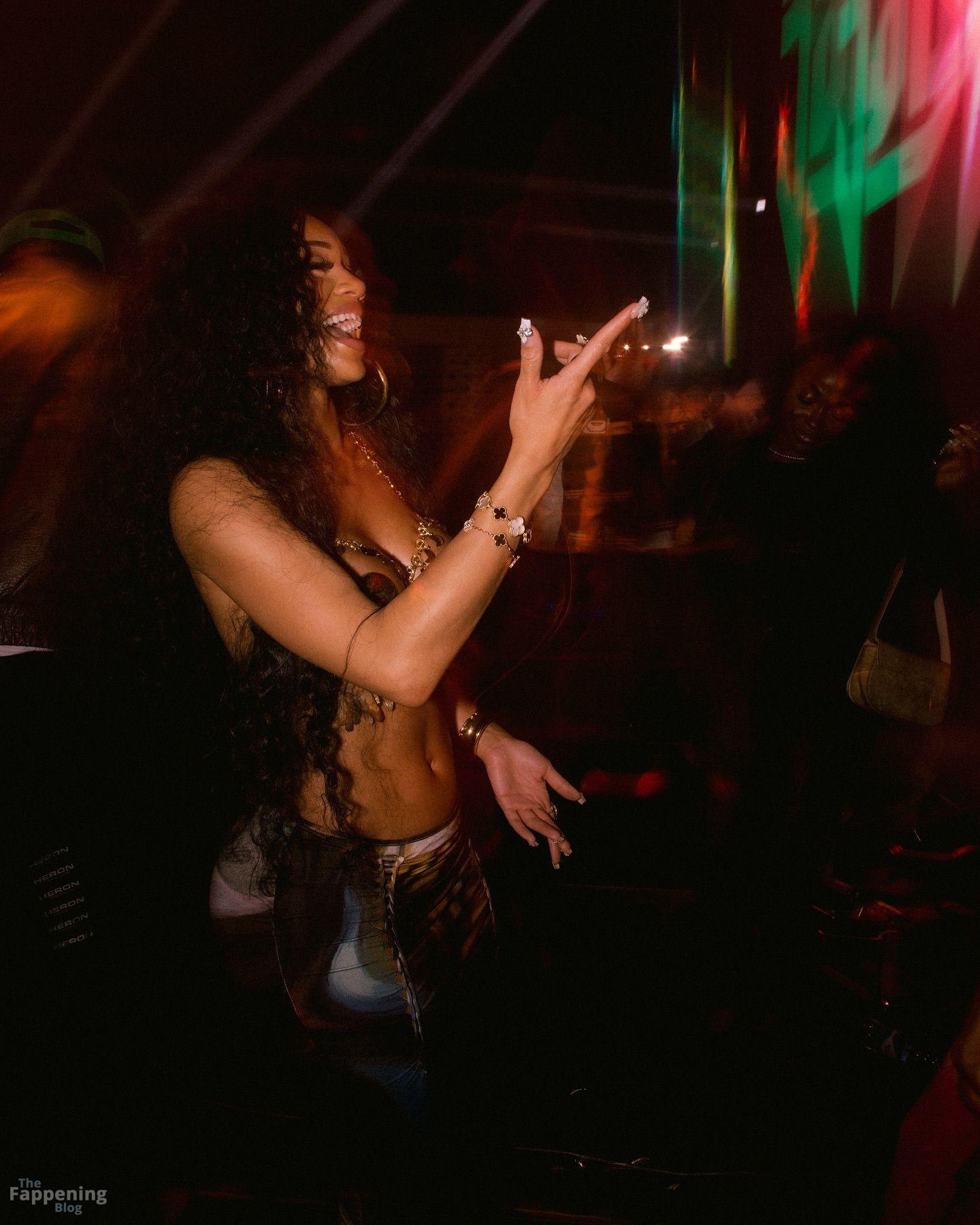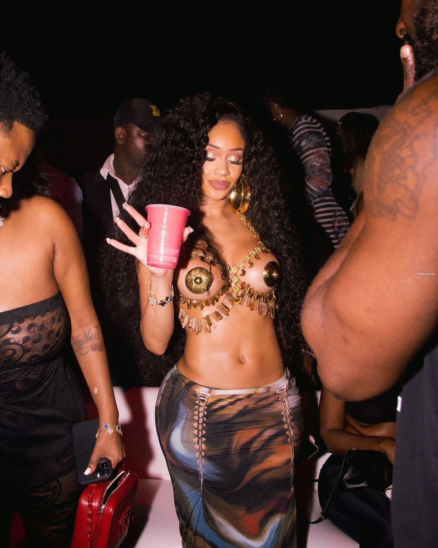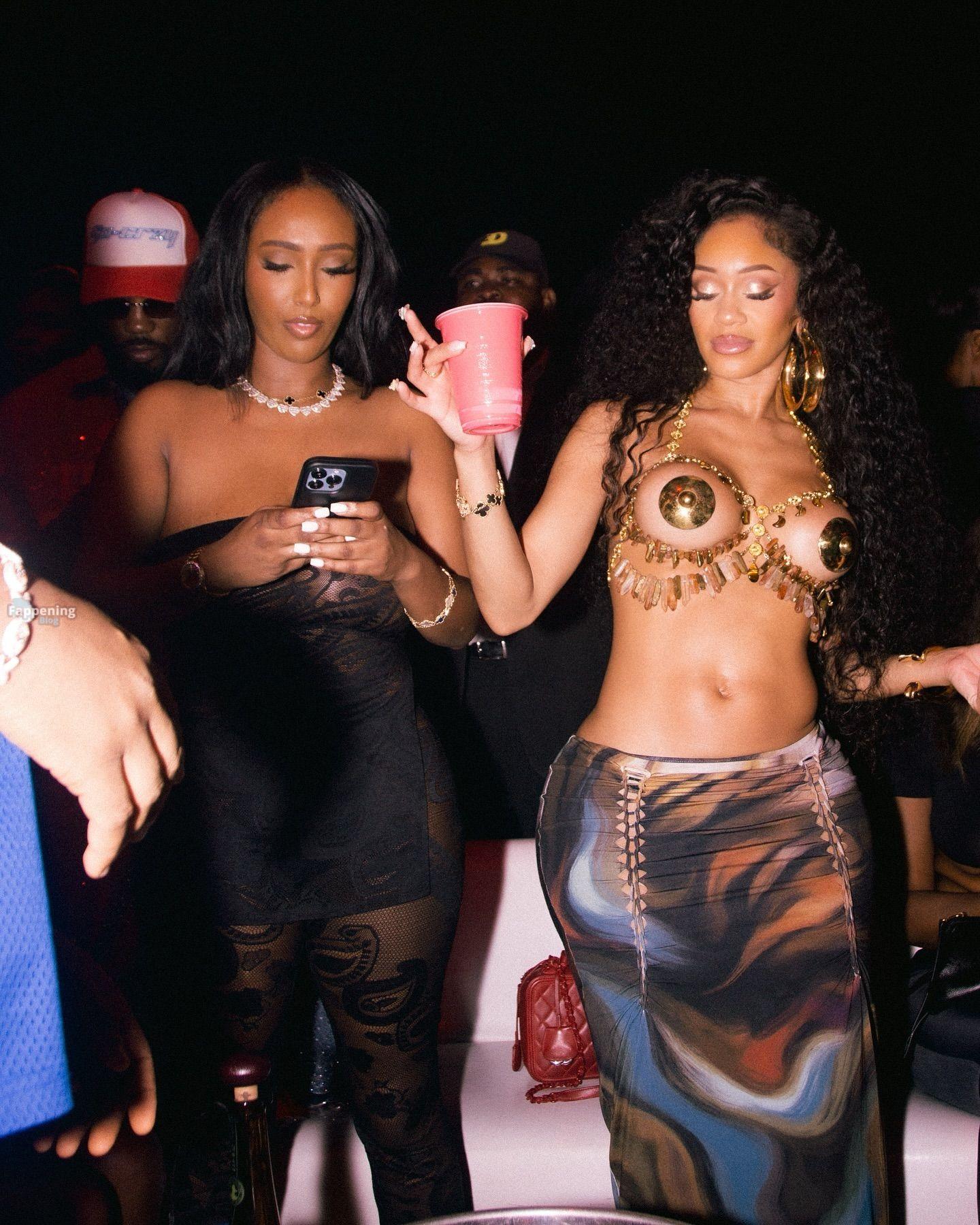 A rapper Saweetie exibe seus seios grandes e sensuais em um look ousado enquanto se diverte com amigos.
