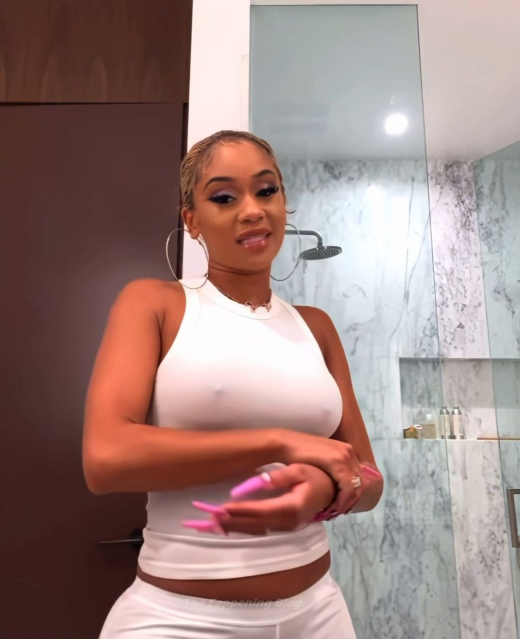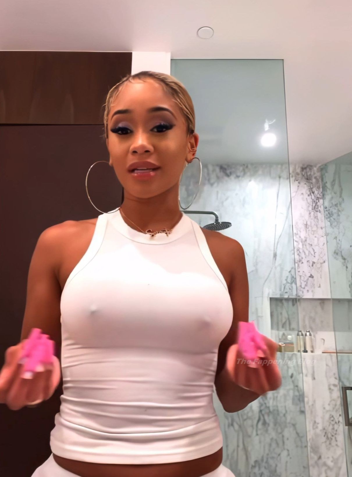 A cantora Saweetie apresenta cosméticos, usando uma regata transparente, mostrando os mamilos no novo vídeo do Instagram, 10/05/2021.