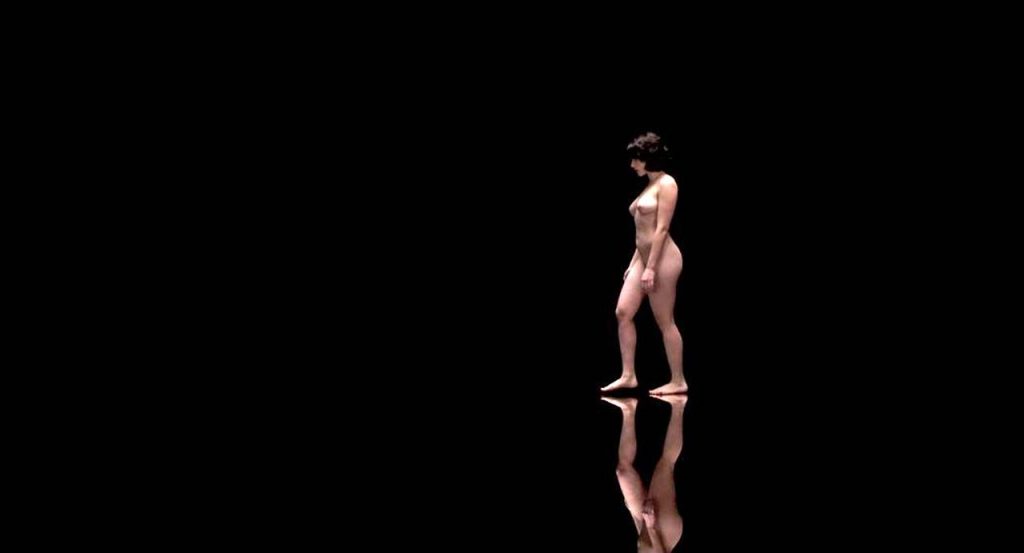 Check out a little bit of strange hot Scarlett Johansson naked scene from the movie ‘Under The Skin’. Where she is walking backward with a completely black background, utterly nude, while she steps slowly away from a guy and then stops, and her tits and butt are here visible from the side!