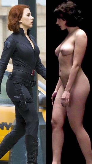 Here folks, is a photo collage of two Scarlett Johansson photos! On the left one, she is dressed up in a tight bodysuit costume, and on the other one, she’s fully naked! This is a test to see which photo will turn you on more? You’d think the answer is easy – the nude photo. Well, not necessarily! So, take a look for yourself!