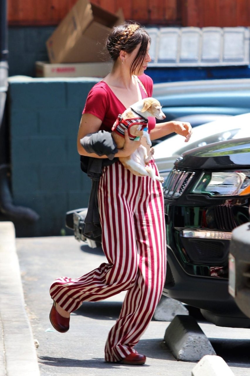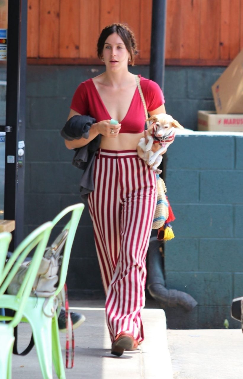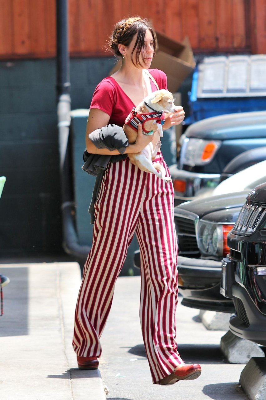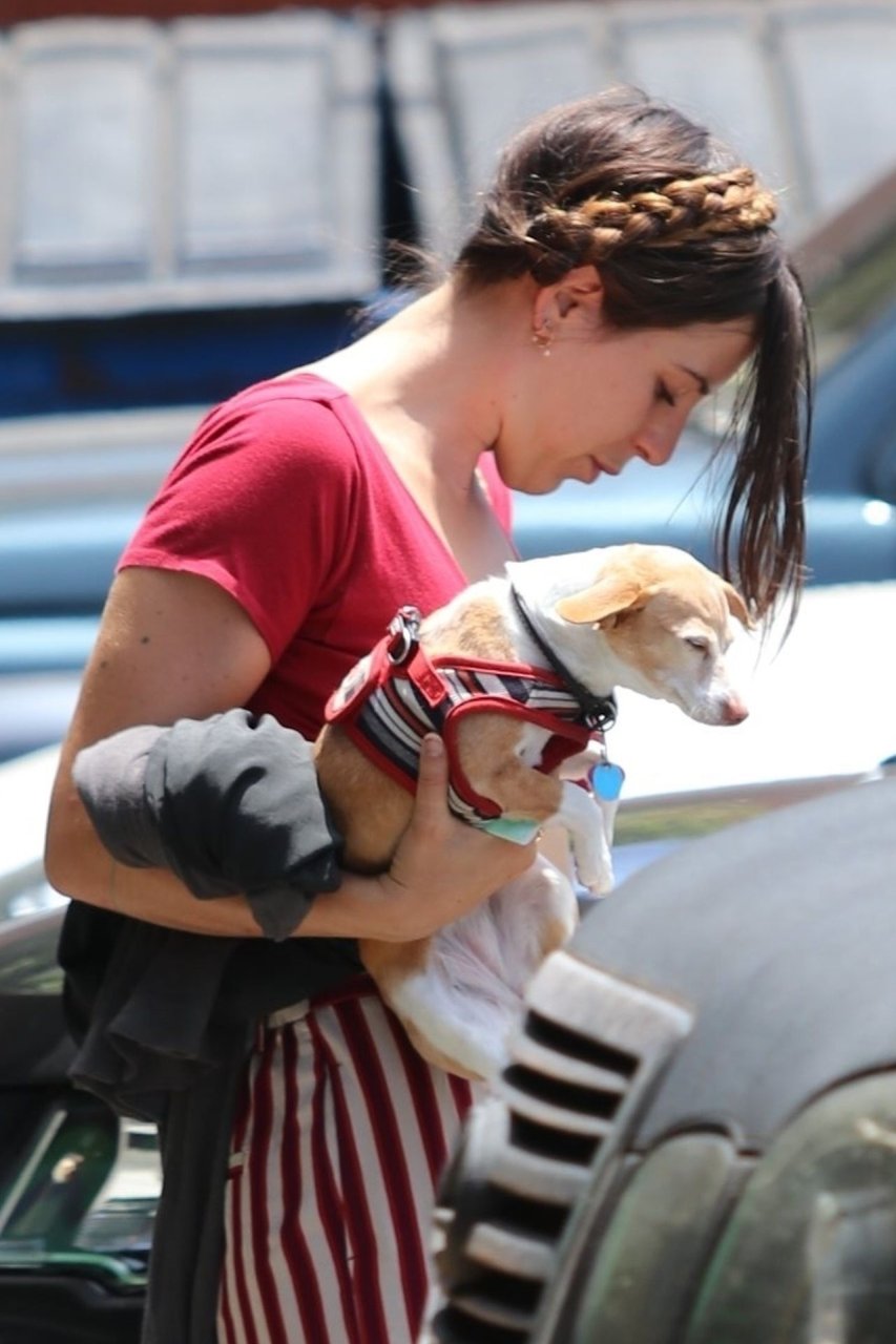 A atriz Scout Willis está em Los Angeles fazendo uma aparição fora de uma lavanderia com seu cachorro nas mãos, 09/07/2019. A atriz usa uma parte de baixo listrada vermelha/branca combinada com uma camiseta decotada em V.