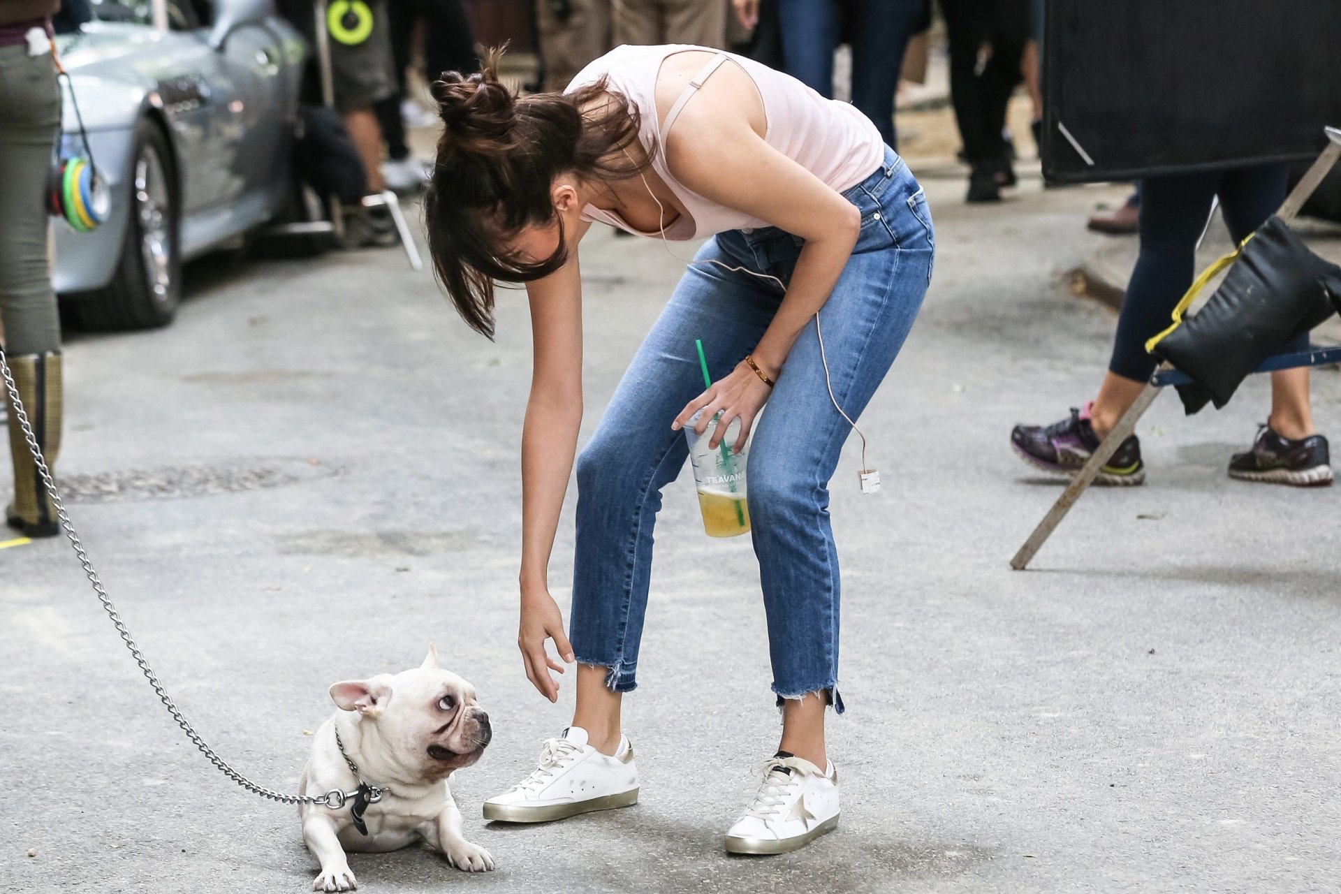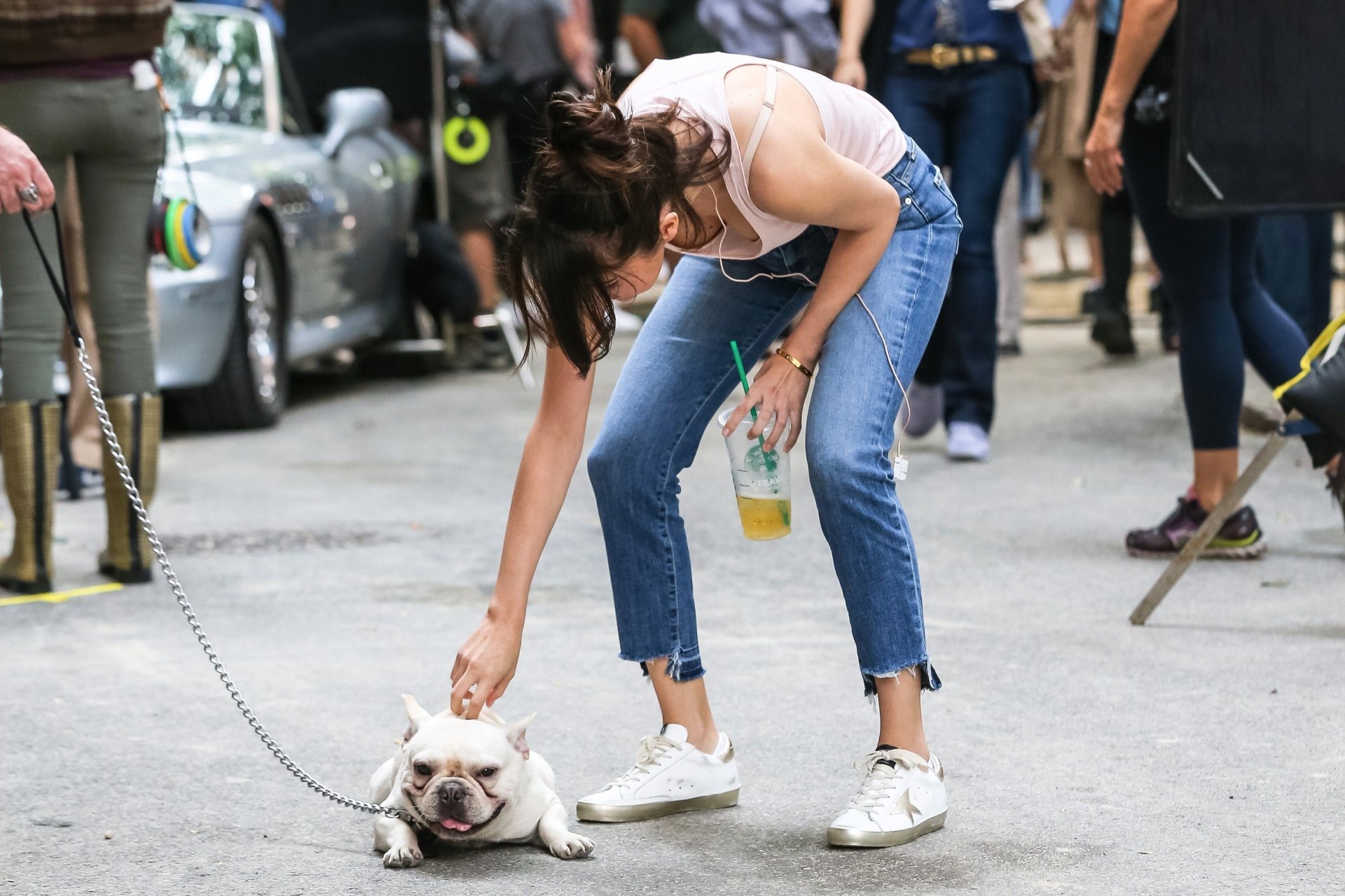 Atriz e cantora Selena Gomez (25) brinca com um filhote no set de seu próximo projeto com Woody Allen filmando em Nova York, 21/09/2017.