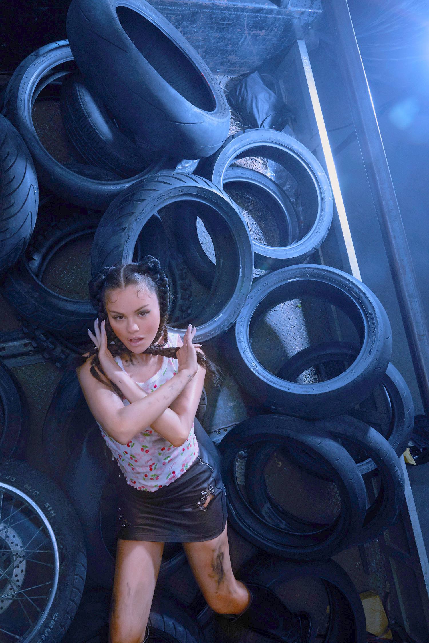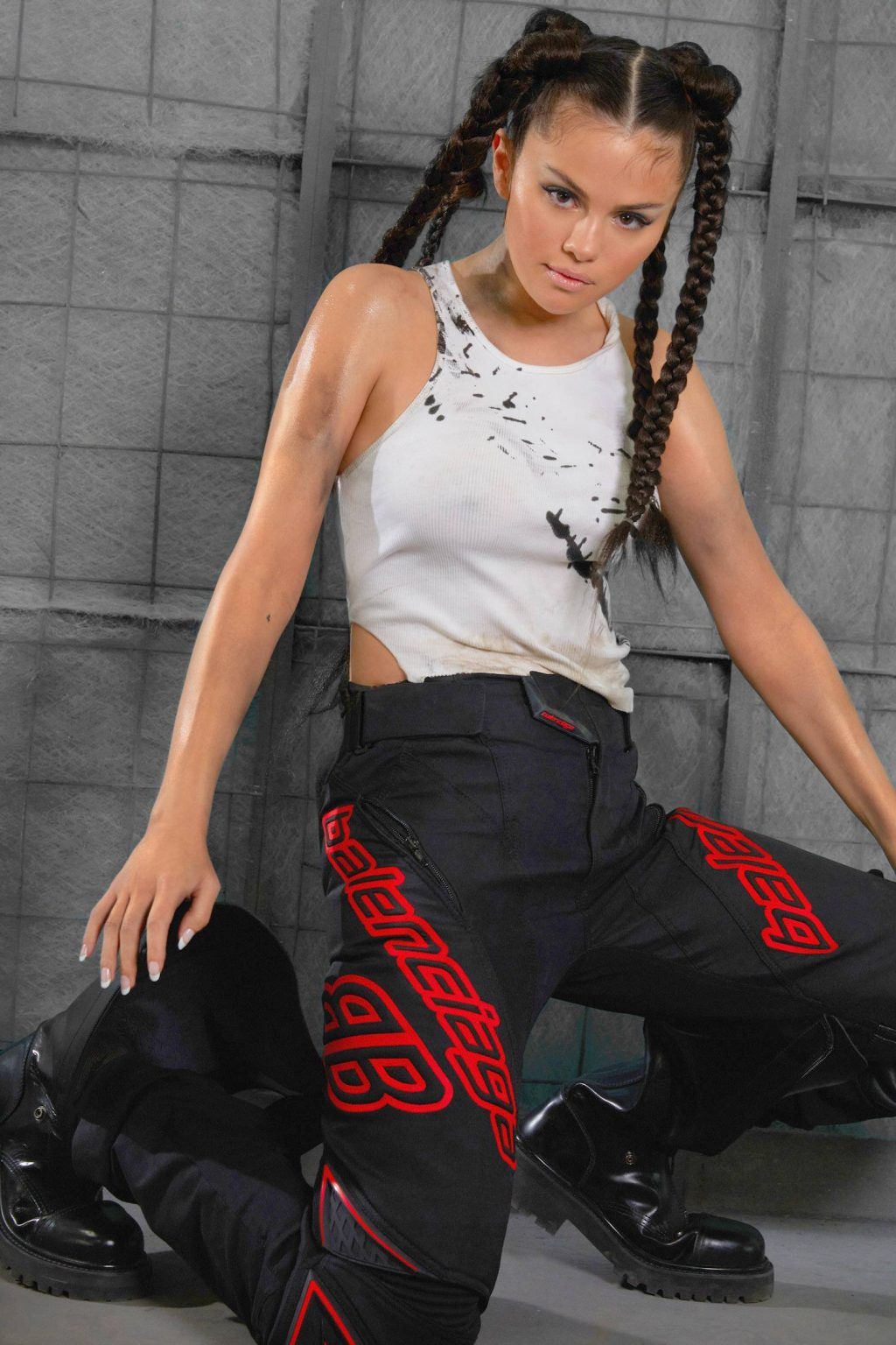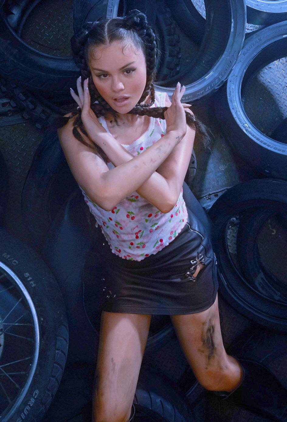 Em uma das fotos, ela está com um vestido preto curto com correntes da Morphew Collection, enquanto na outra, ela usa uma saia de couro Moschino Couture e uma camiseta com estampa de cereja. Além disso, Gomez foi fotografada com um top branco sem sutiã, calças pretas Balenciaga e botas Vetements da mesma cor.