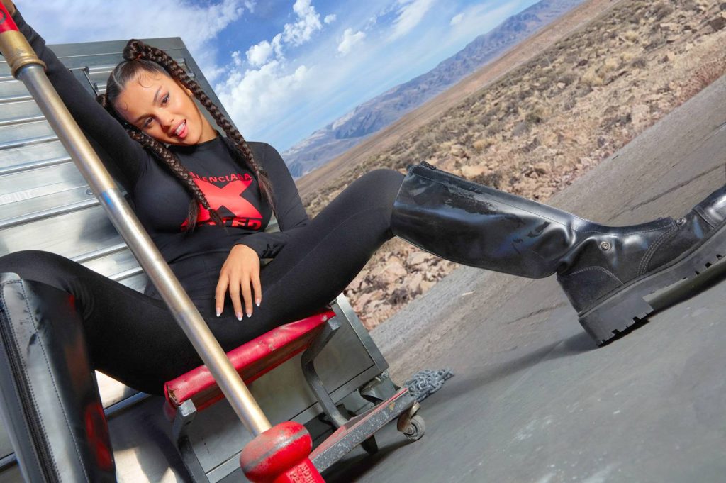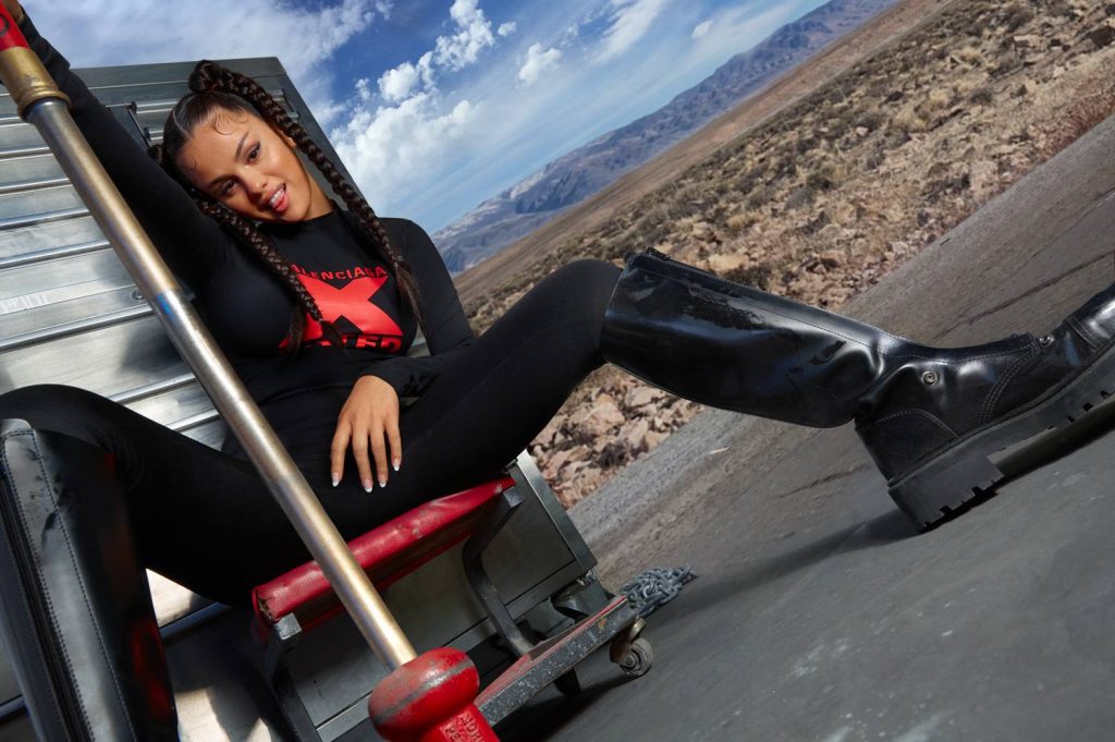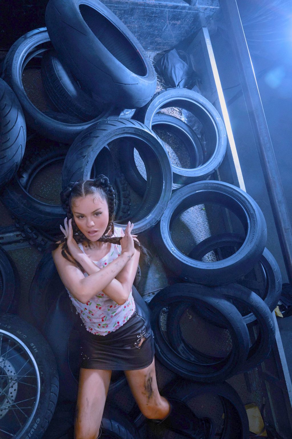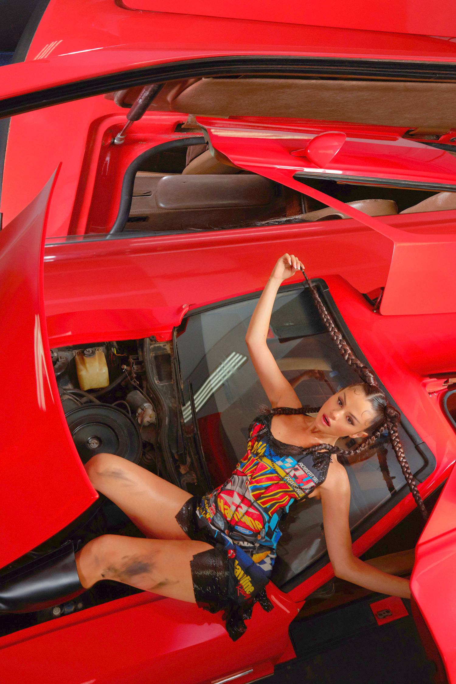 Em uma das fotos, ela está com um vestido preto curto com correntes da Morphew Collection, enquanto na outra, ela usa uma saia de couro Moschino Couture e uma camiseta com estampa de cereja. Além disso, Gomez foi fotografada com um top branco sem sutiã, calças pretas Balenciaga e botas Vetements da mesma cor.